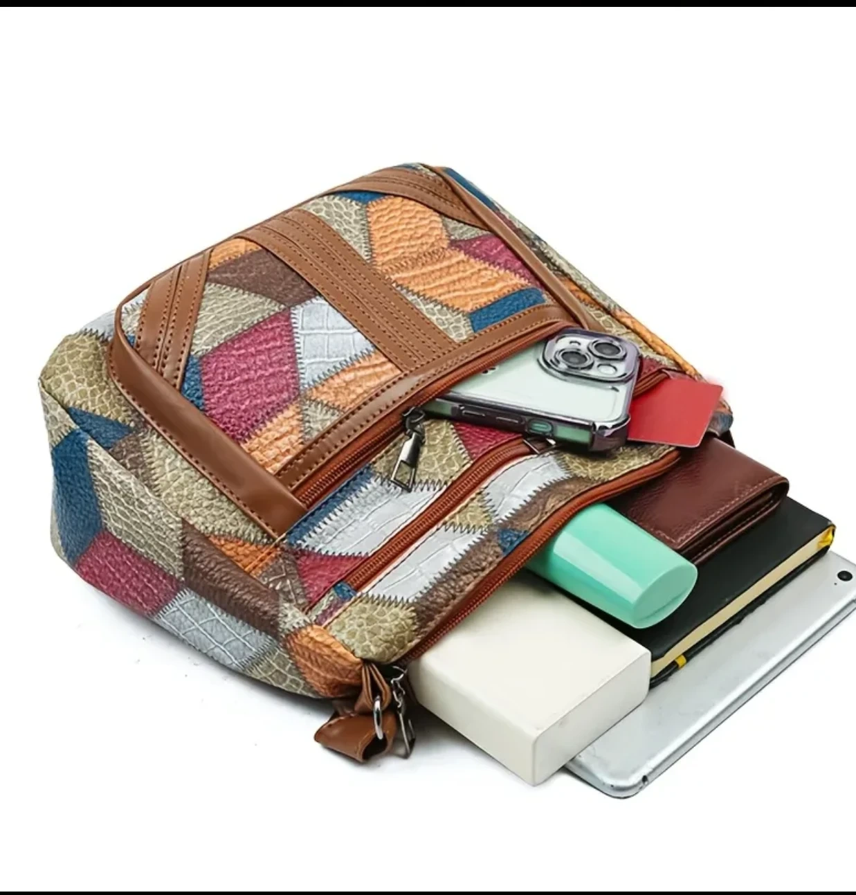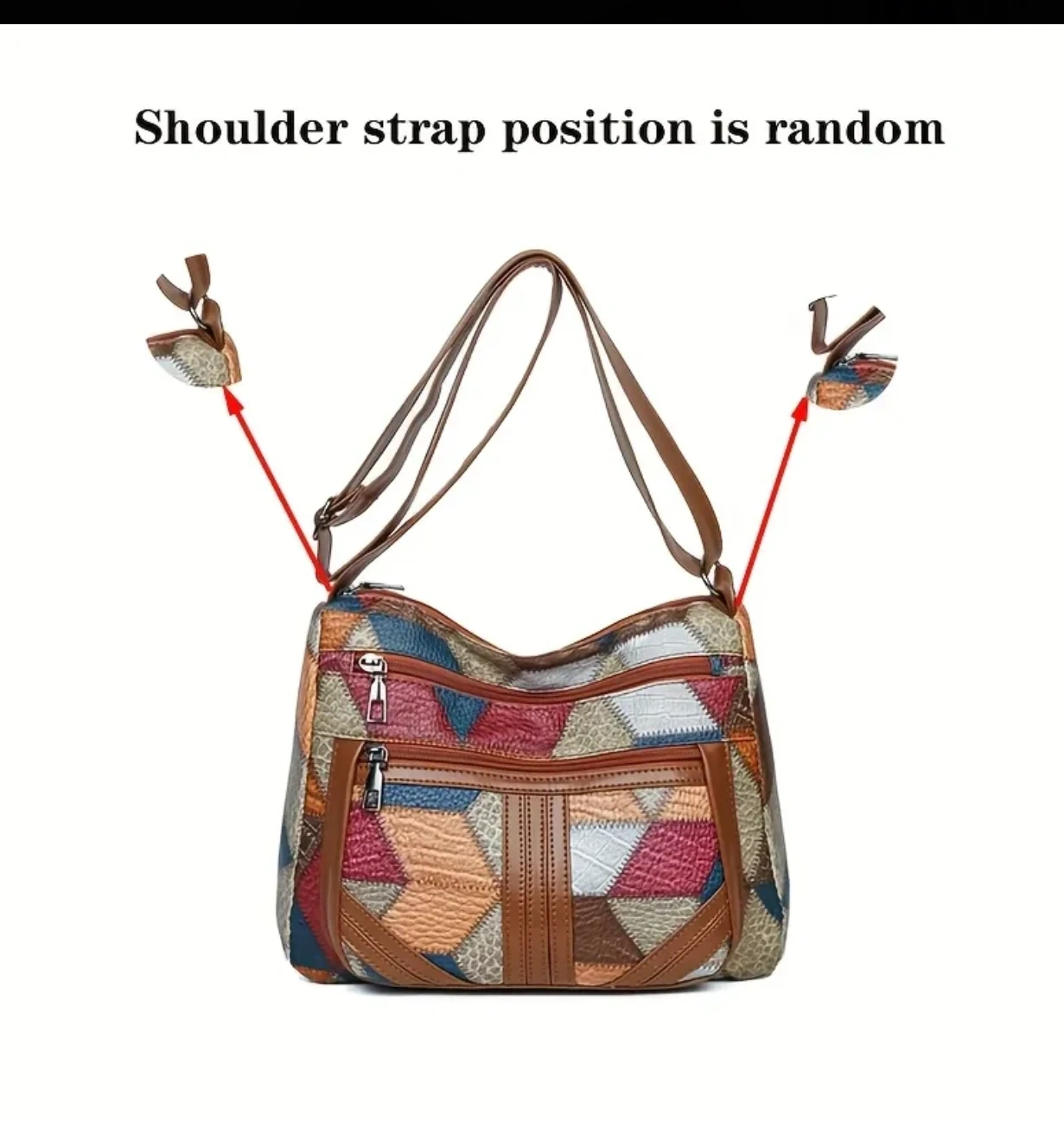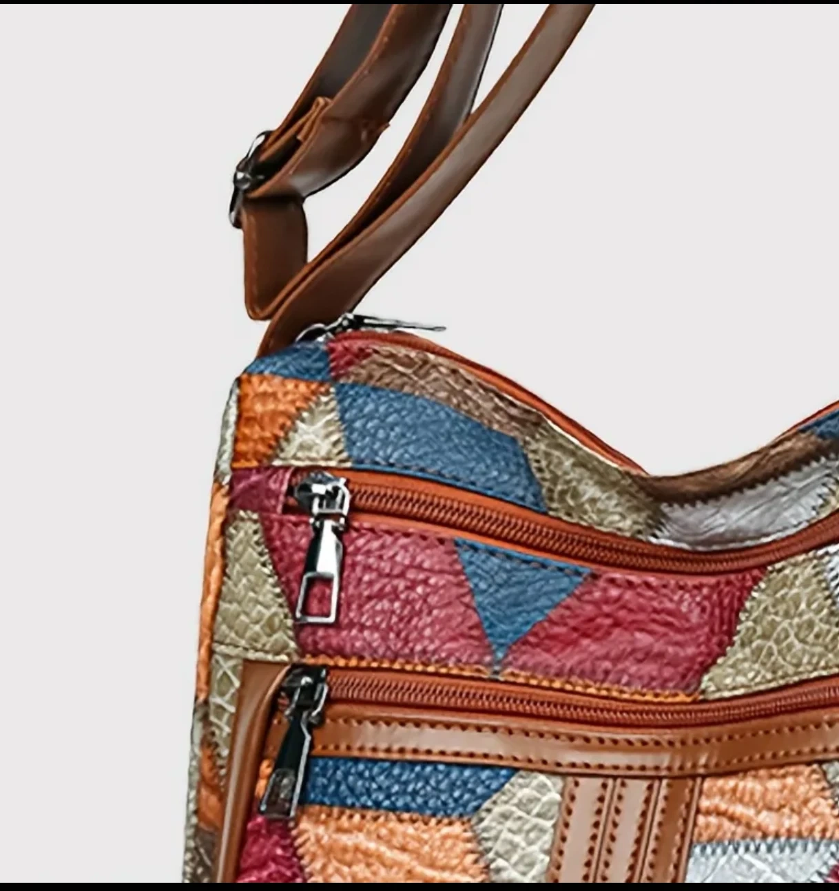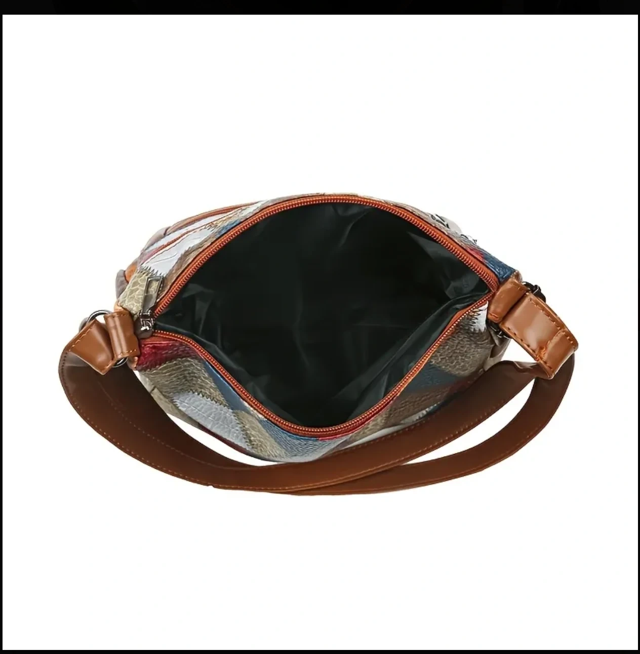 This is a very cute patchwork leather shoulder bag in excellent condition! It has a brown strap and zipper and has a colourful geometric design. The bag measures 9.4 inches in length, 7.8 inches in height, and 5.1 inches in width.