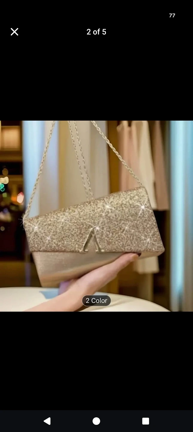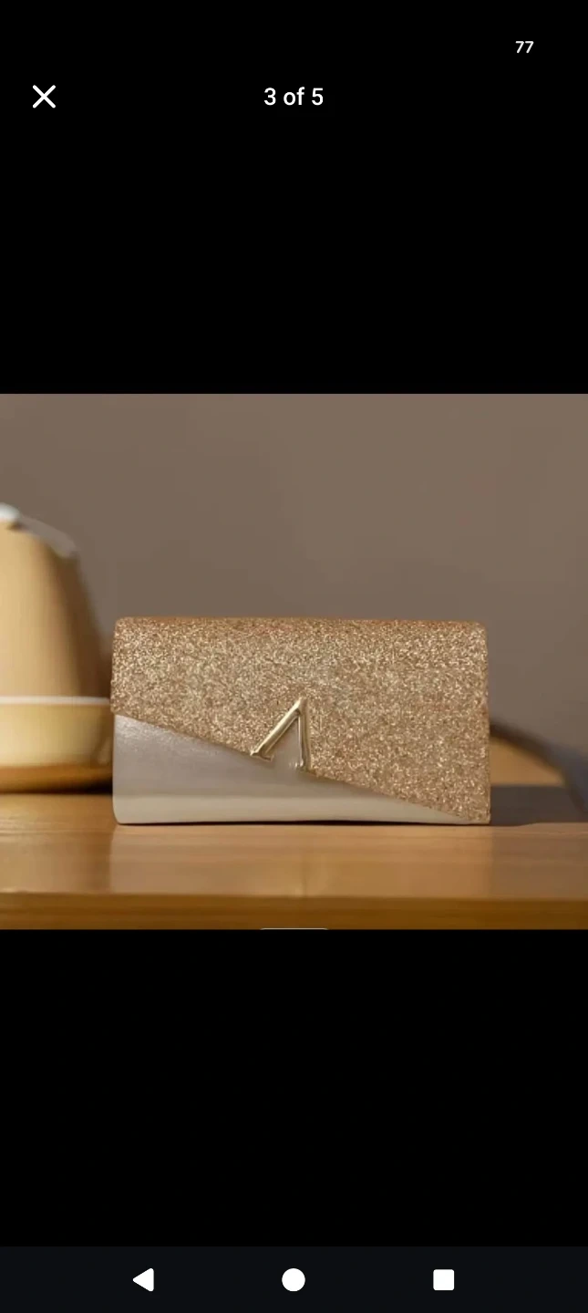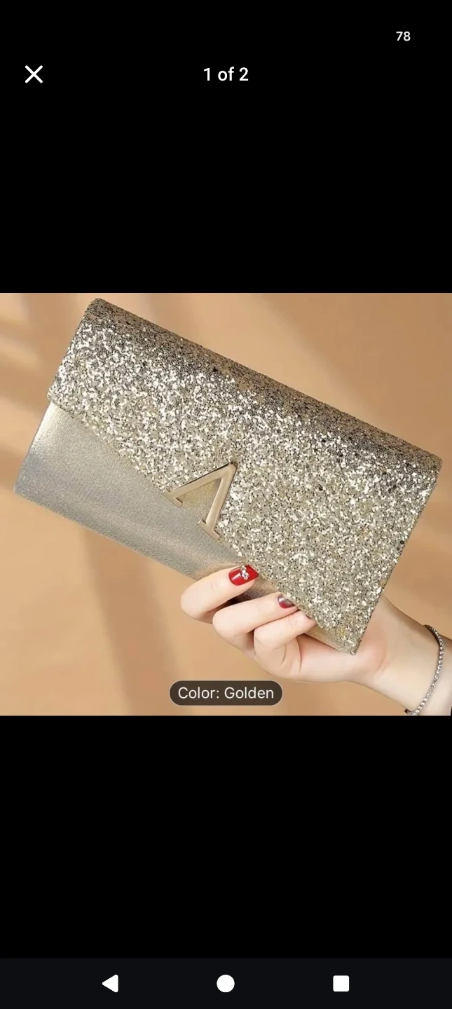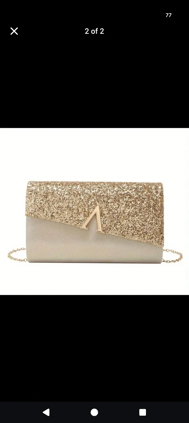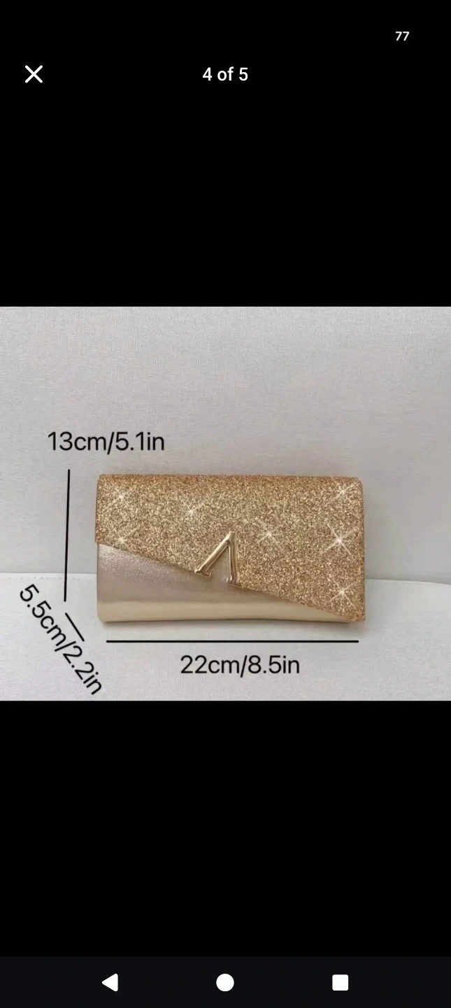 Selling a beautiful gold glitter clutch bag! It's perfect for evenings out or special occasions. The bag measures approximately 22cm (8.5in) in length, 13cm (5.1in) in height, and 5.5cm (2.2in) in width.