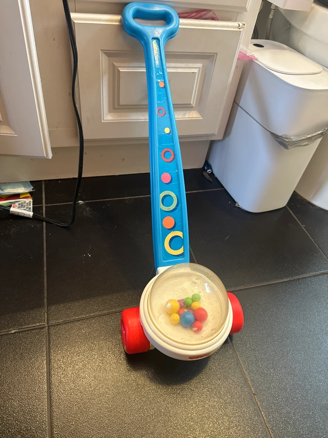 This Fisher-Price Ball Popper is ready for a new home! It's a classic toy that encourages little ones to walk and explore. The colorful balls pop around as it's pushed, making fun sounds that kids love