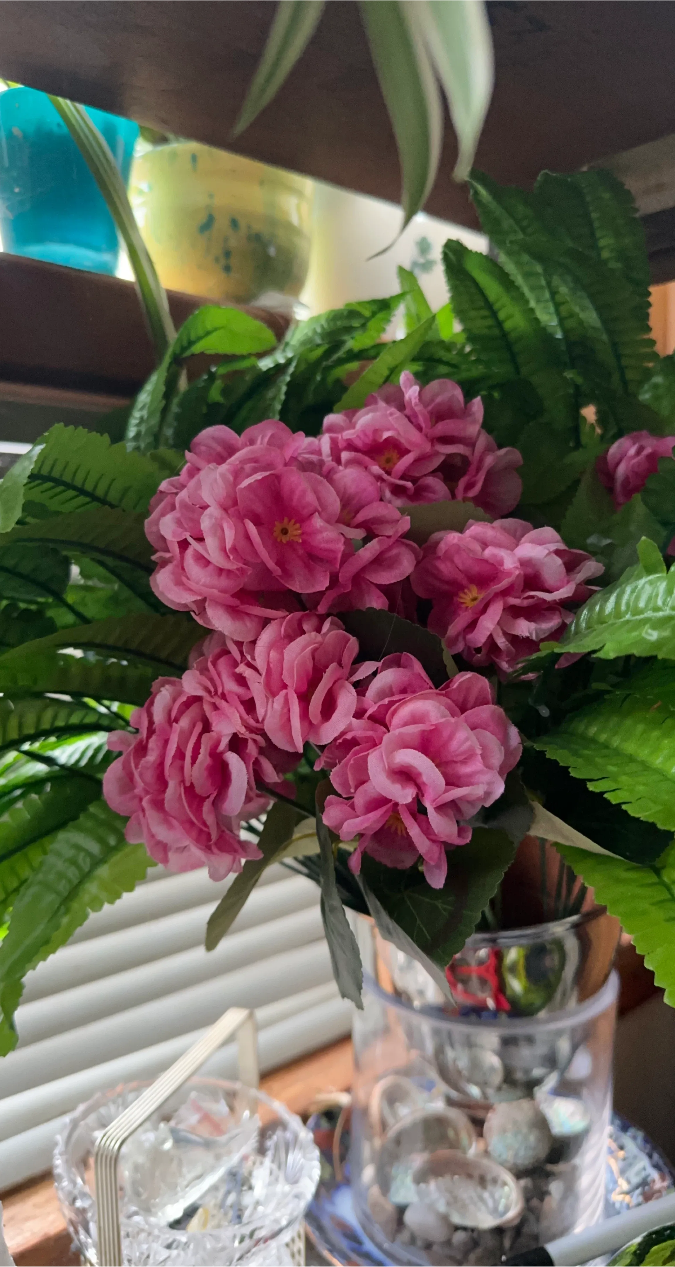 Here's a lovely artificial flower arrangement with pink flowers and green leaves. It comes in a clear vase filled with decorative stones.