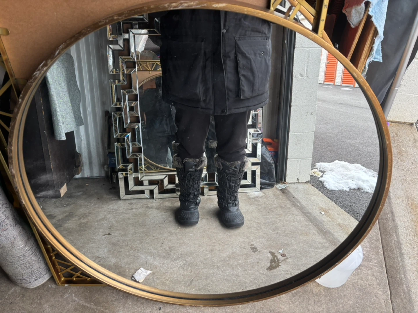 Selling a round mirror with a gold frame. It's in good condition and would be a great addition to any room!