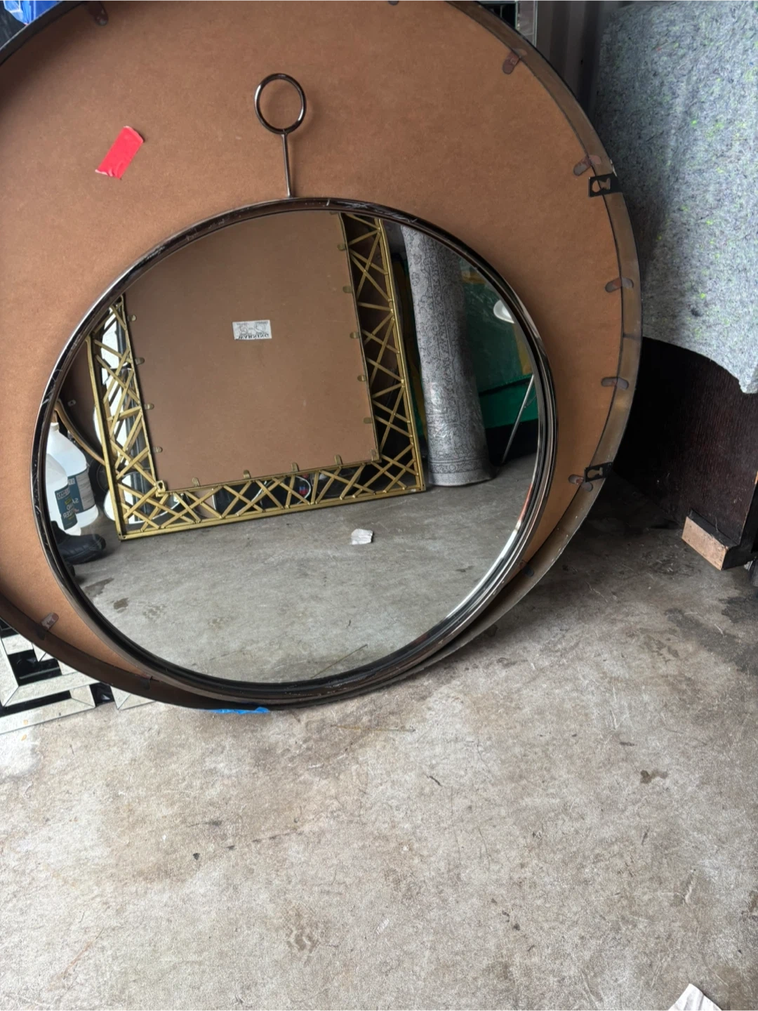 Selling a round mirror that would look great in any room! It features a sleek silver frame that complements the circular design. Perfect for adding a touch of elegance to your home decor