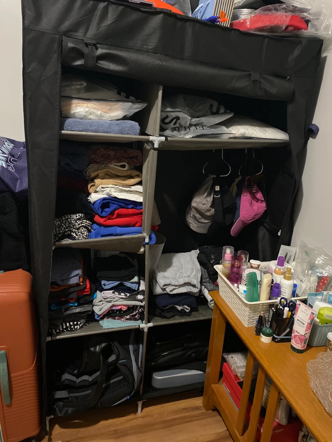 This portable wardrobe closet is perfect for adding extra storage space! It features multiple shelves and hanging rods to keep your clothes and accessories organized. It's in great condition and easy to assemble.