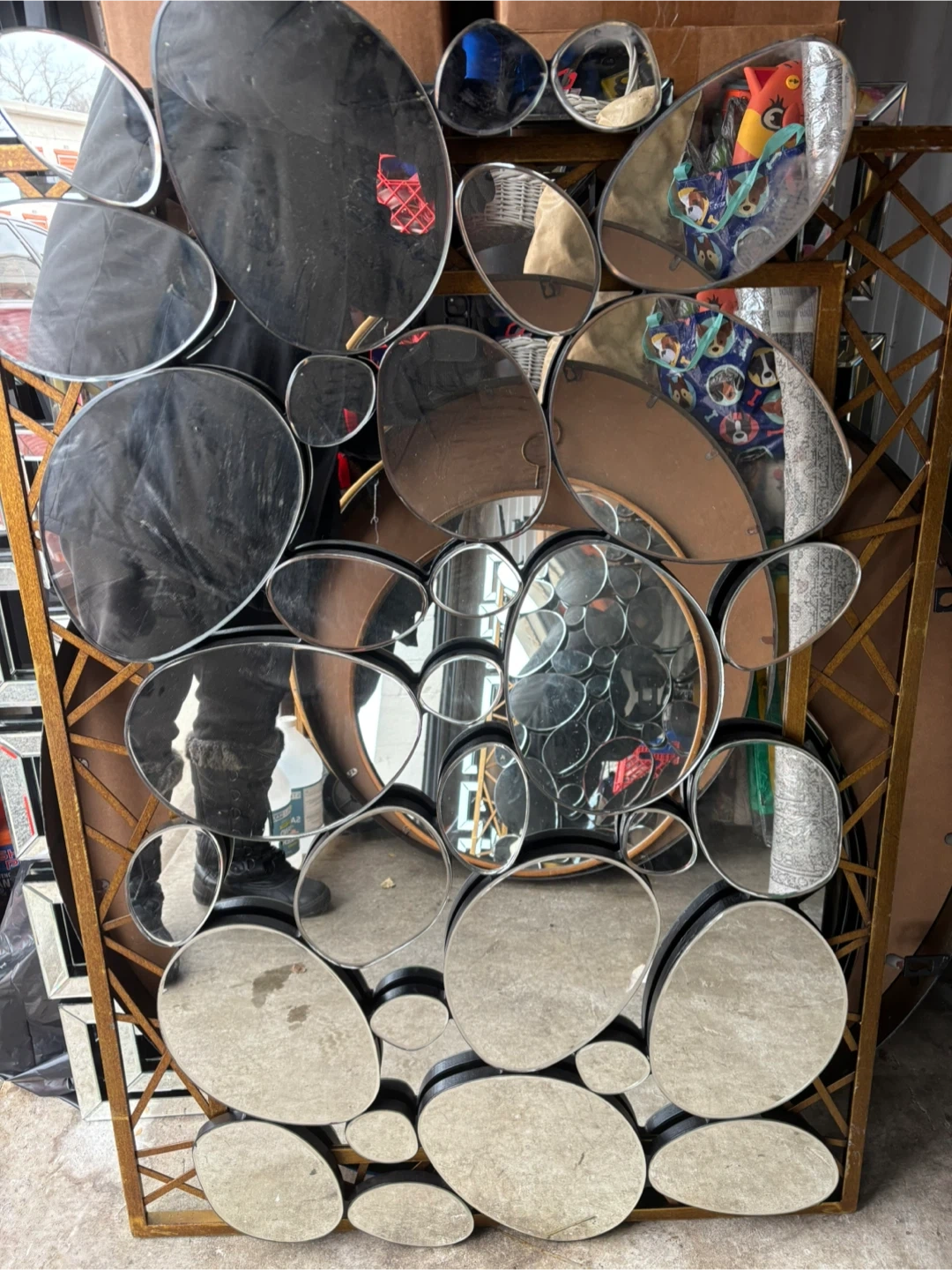 I'm selling this unique wall decor featuring multiple mirrors. It's a statement piece that would add a modern touch to any room! The frame has a gold finish, and the various sized mirrors create an interesting visual effect. It's in good condition and ready to be displayed in your home