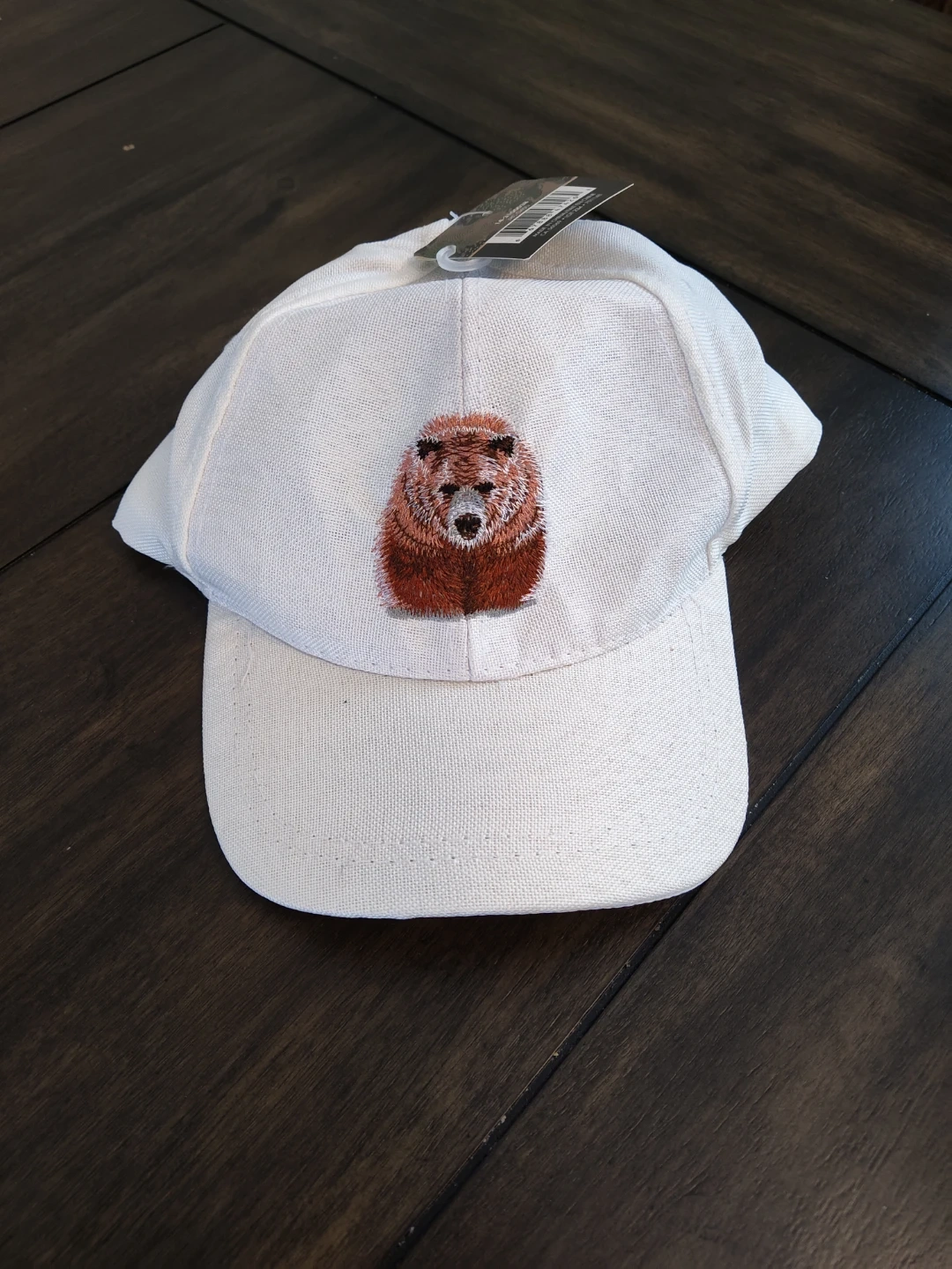 Here's a cute white baseball cap featuring a brown bear embroidery on the front. It's in great condition and perfect for adding a touch of nature to your outfit!