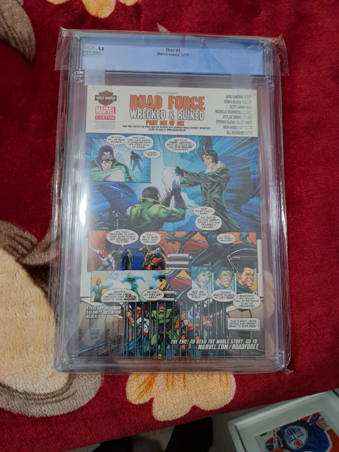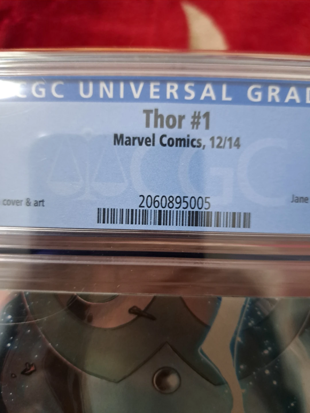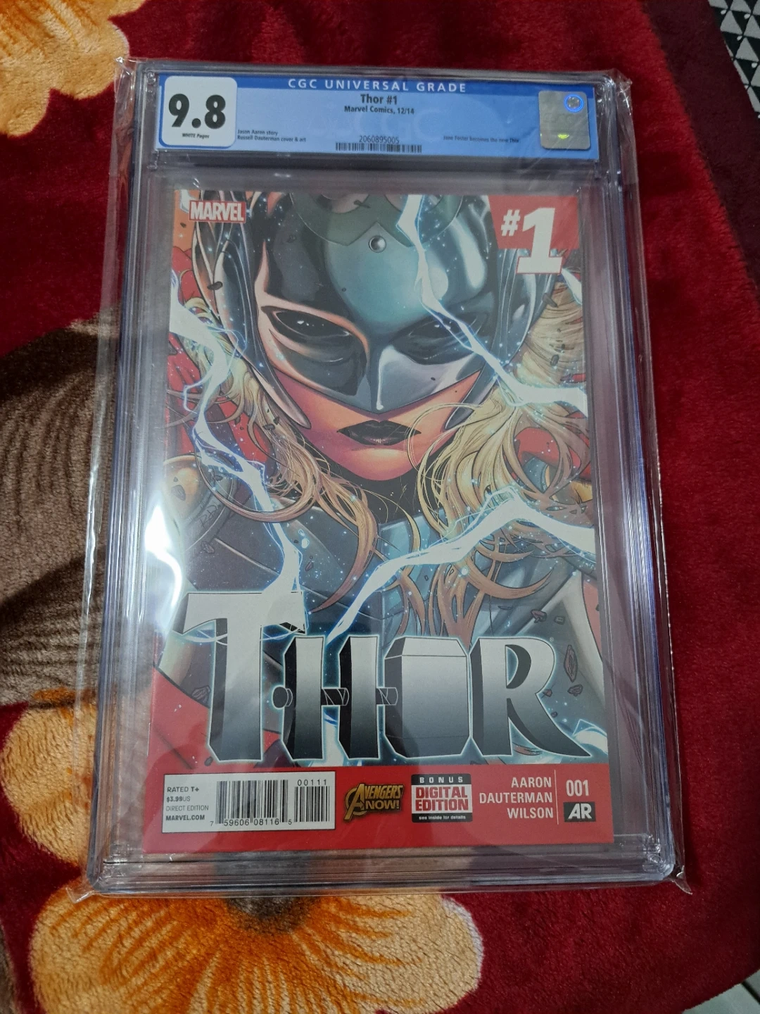 Selling a Thor #1 Marvel comic, graded 9.8 by CGC. This is a Universal Grade comic from Marvel Comics, dated 12/14.