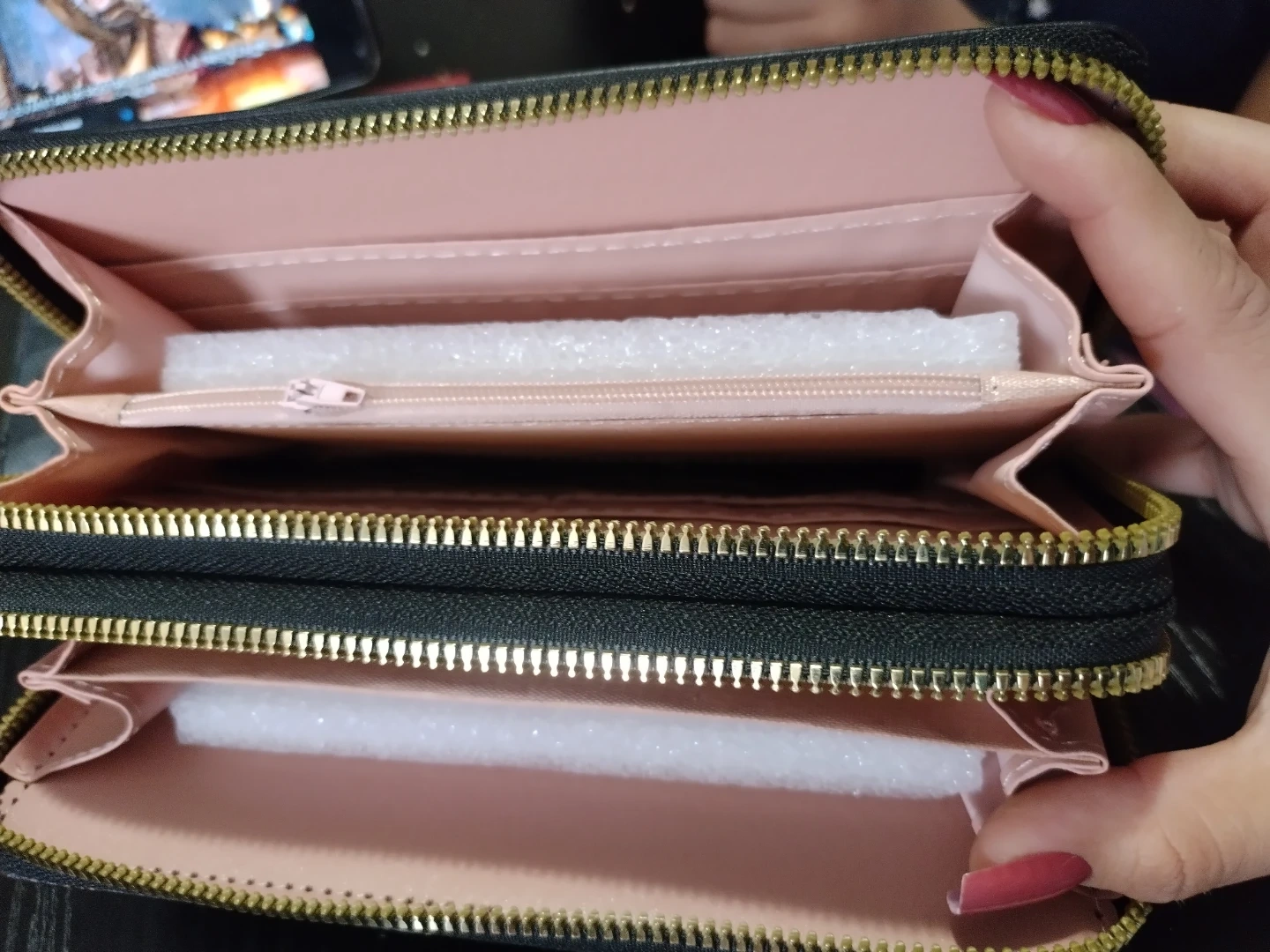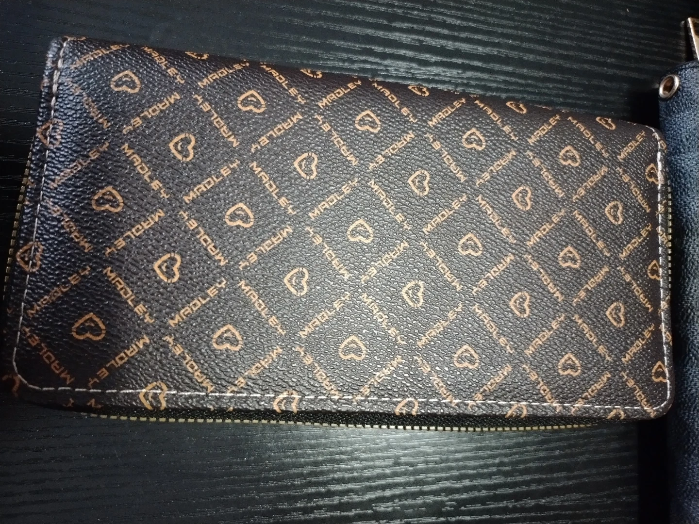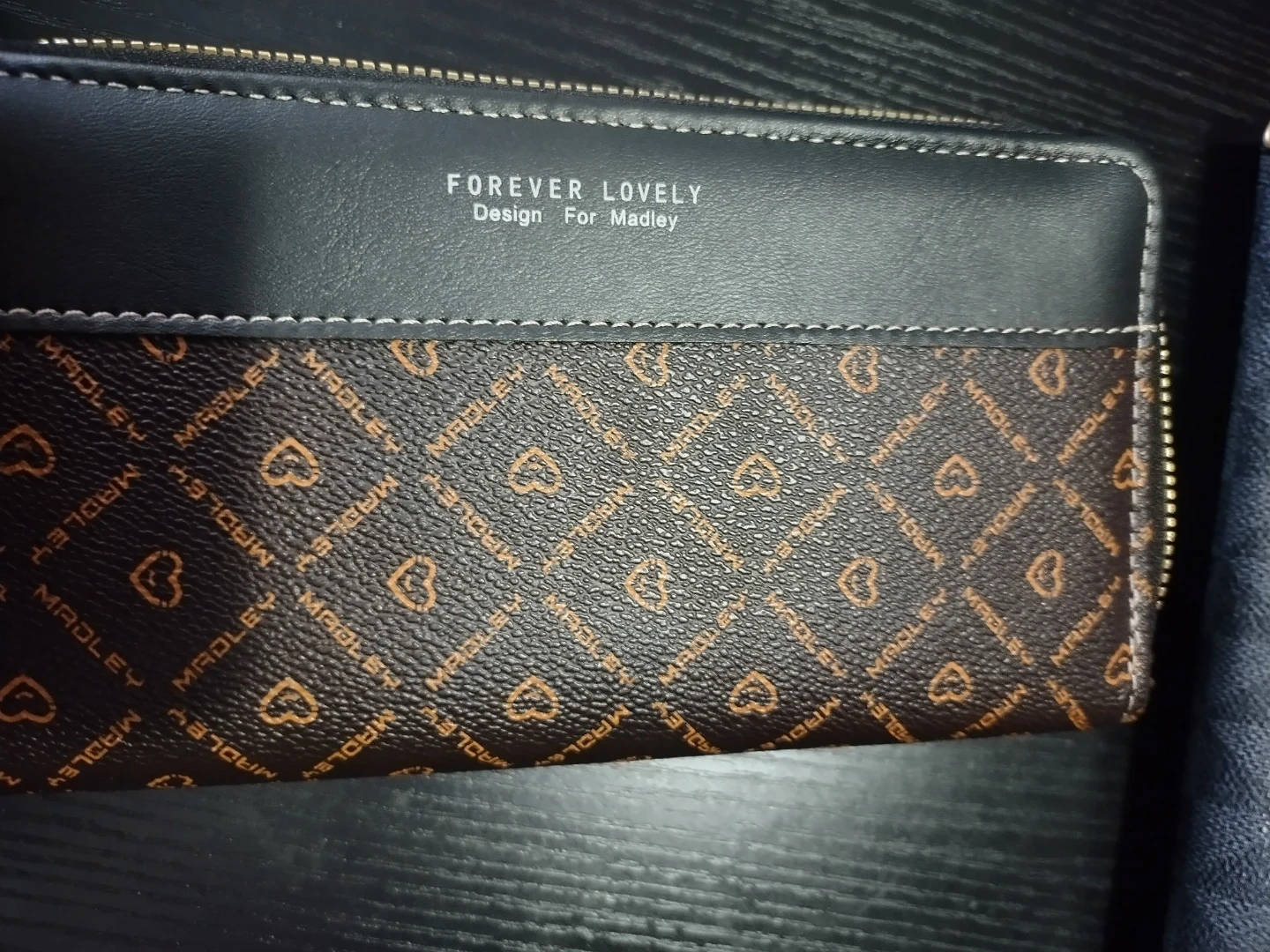 Selling a Madley Forever Lovely wallet with a unique design! It features a pattern of hearts and the brand name. The wallet is brown and black, with a gold zipper, and the interior is pink. It's in great condition and ready for a new owner
