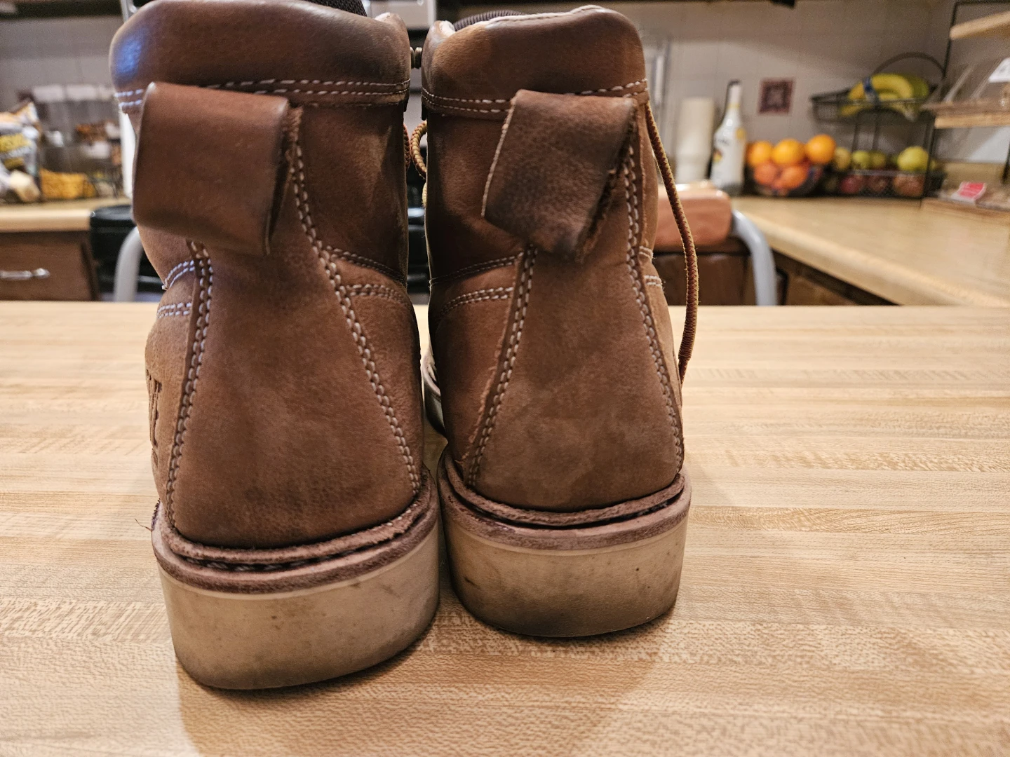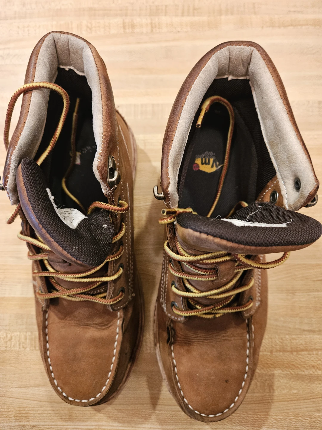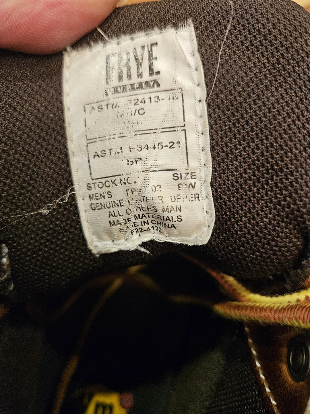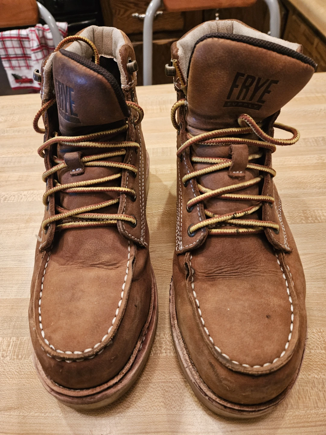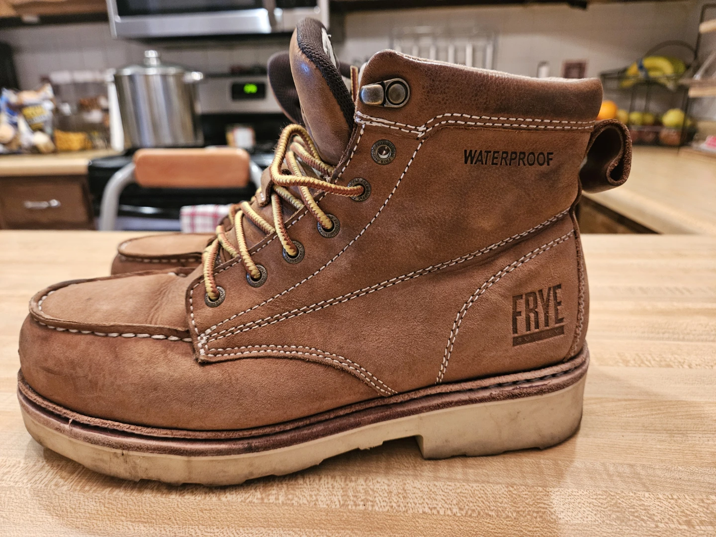 Selling a pair of Frye waterproof leather work boots. They are a men's size 8W and show some signs of wear. Great for work or outdoor activities!