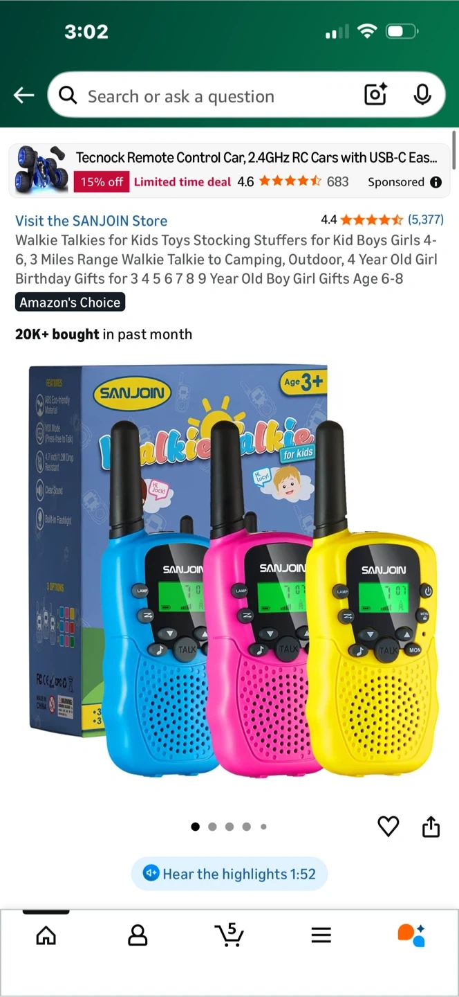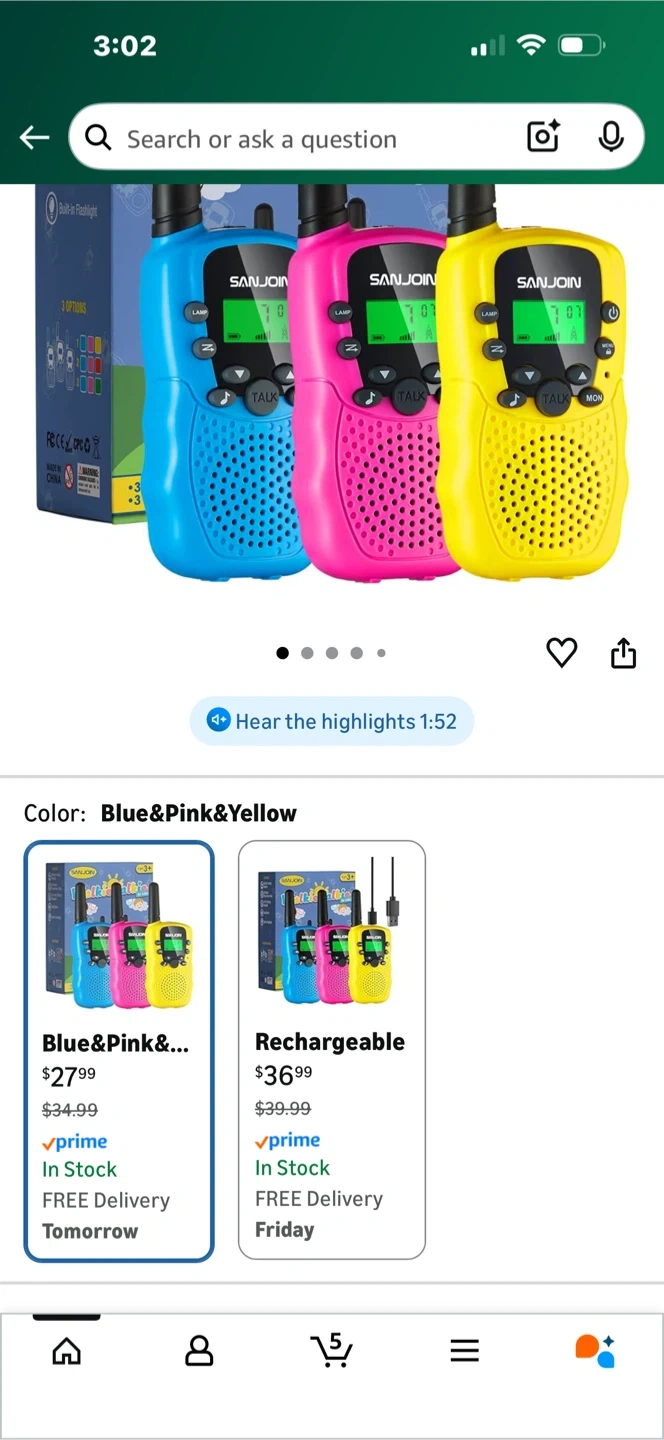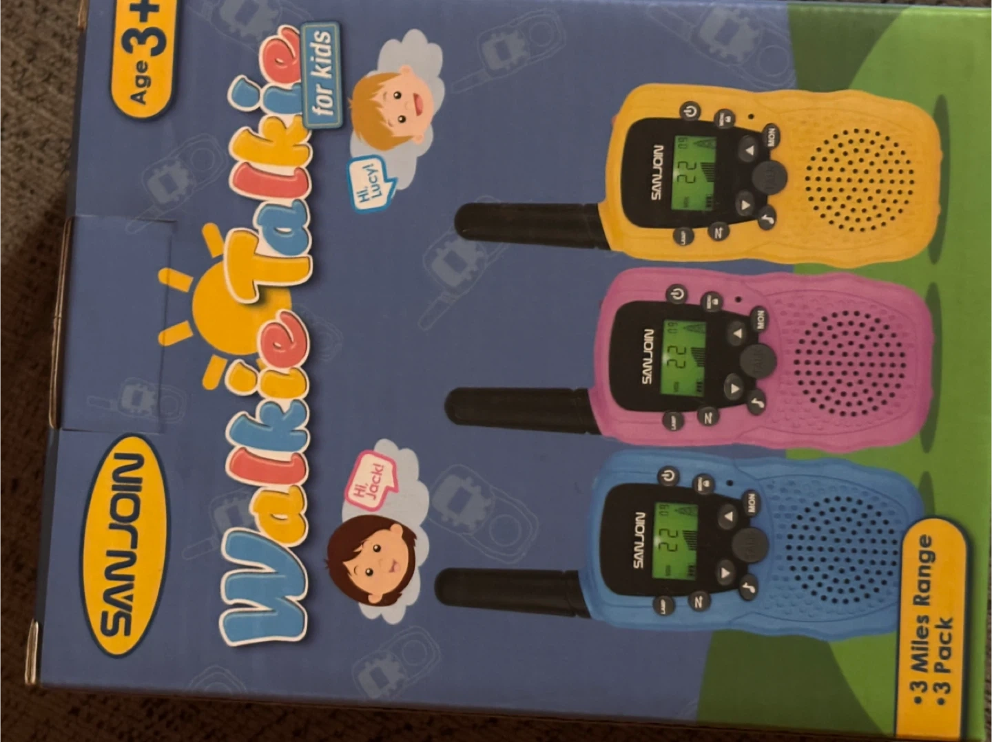 Selling a set of SANJOIN walkie talkies for kids! This is a 3-pack with blue, pink, and yellow radios. They have a range of up to 3 miles, making them great for camping or playing outside. Recommended for ages 3+