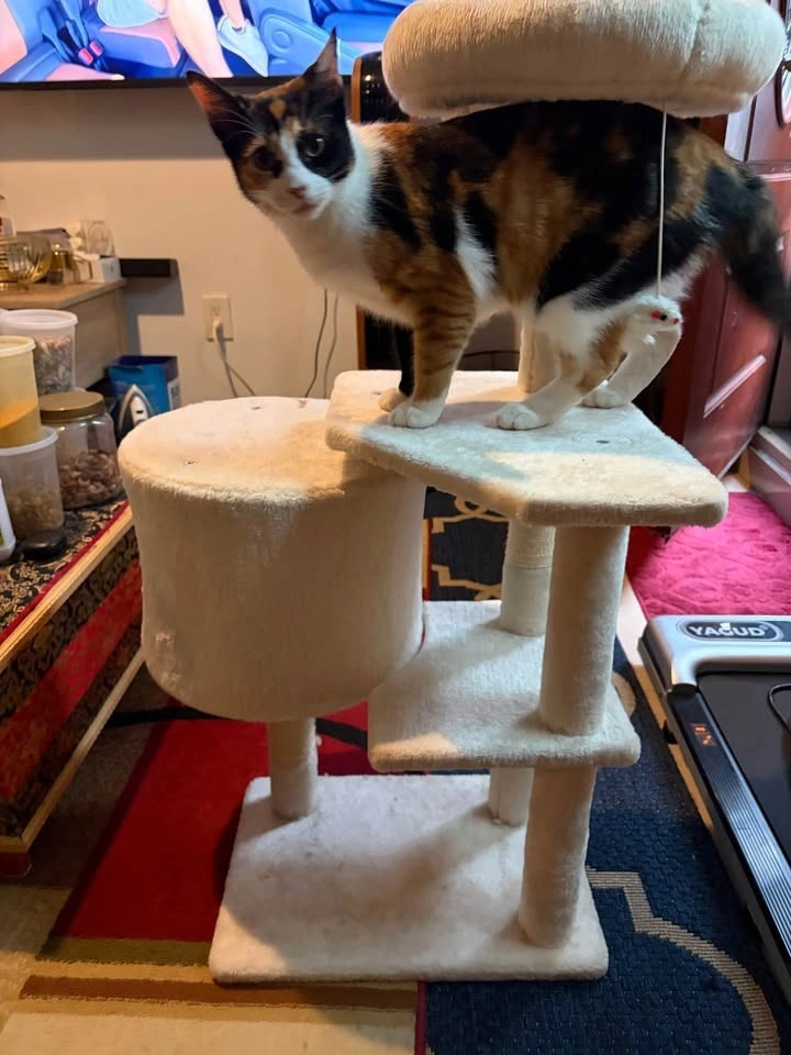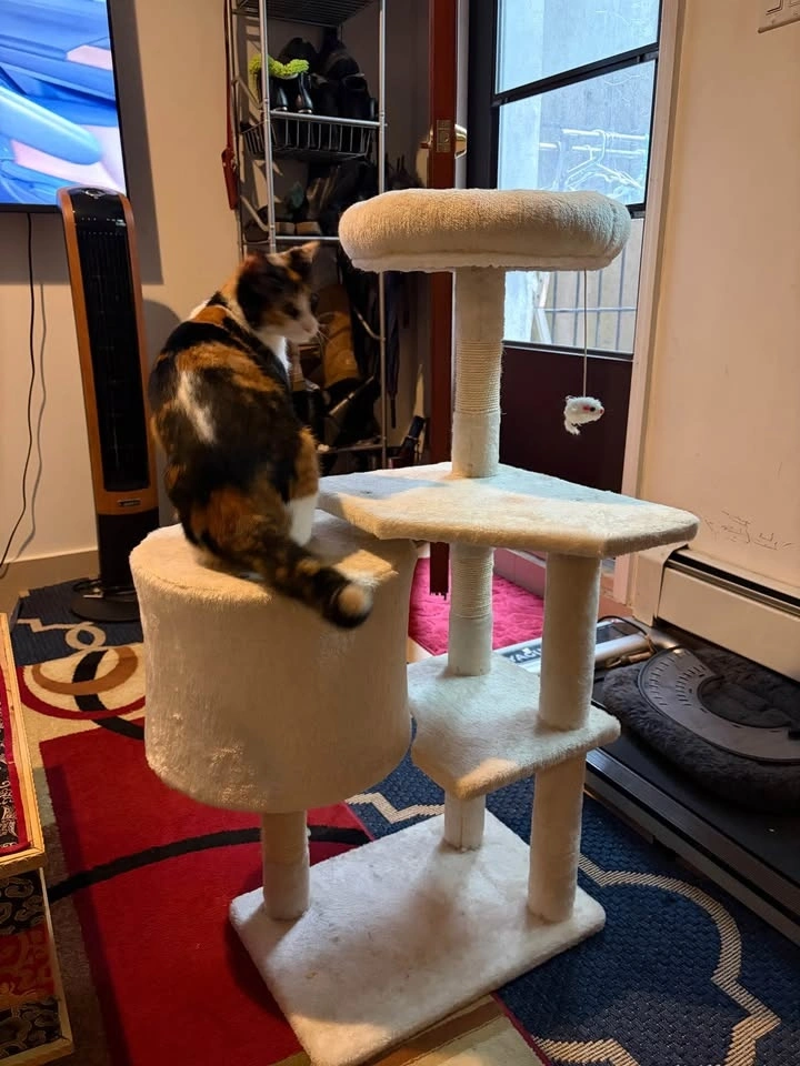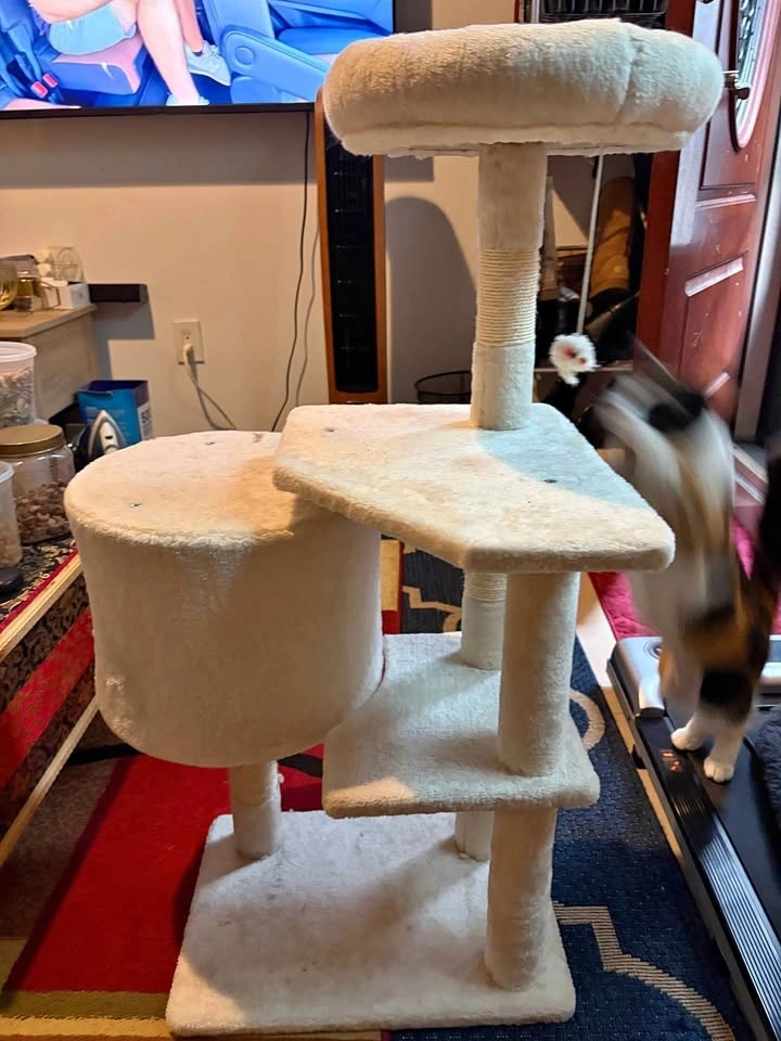 Sturdy, multi-level cat tree with soft plush platforms, a cozy enclosed condo, sisal-wrapped scratching posts, and a hanging toy. Perfect for climbing, scratching, lounging, and play. Clean and gently used.