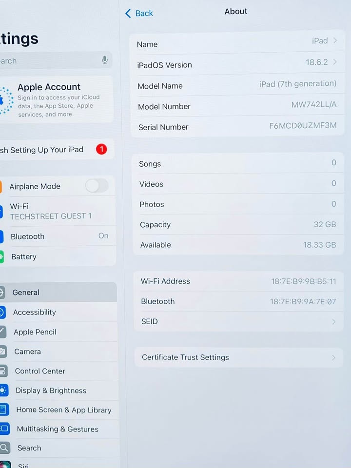 I am selling Apple iPad 7th Gen, 32 GB, 10.2” Display, WIFI. I factory reset it so it's like new and all accounts and data is removed.