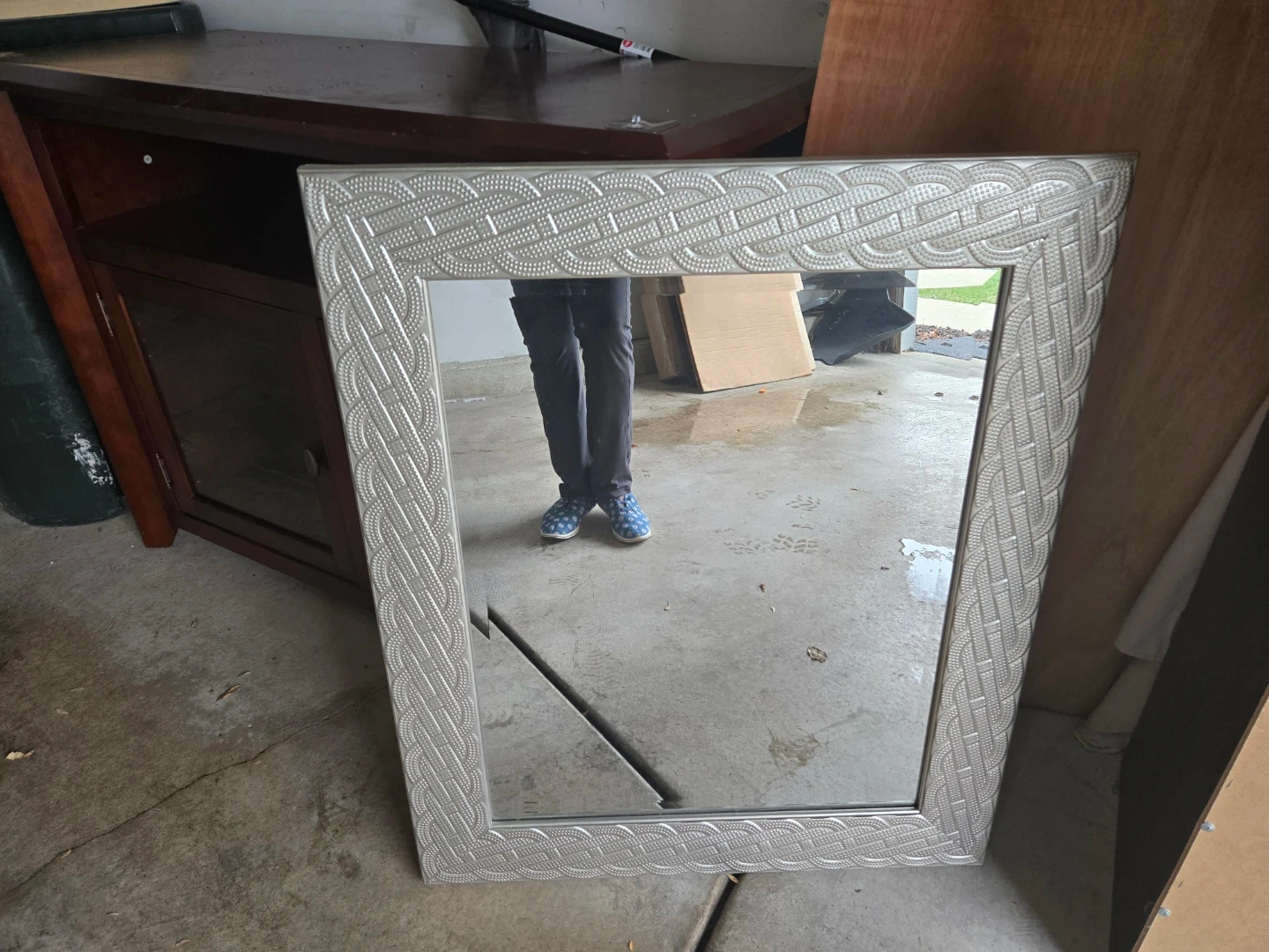 Here's a nice framed mirror ready for a new home! The frame has a unique design that would add a touch of character to any room