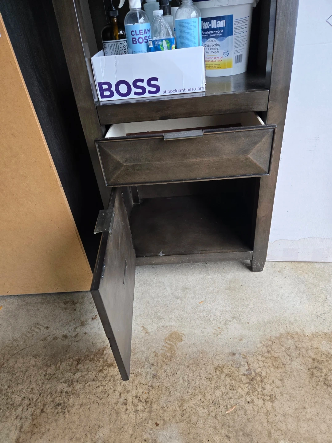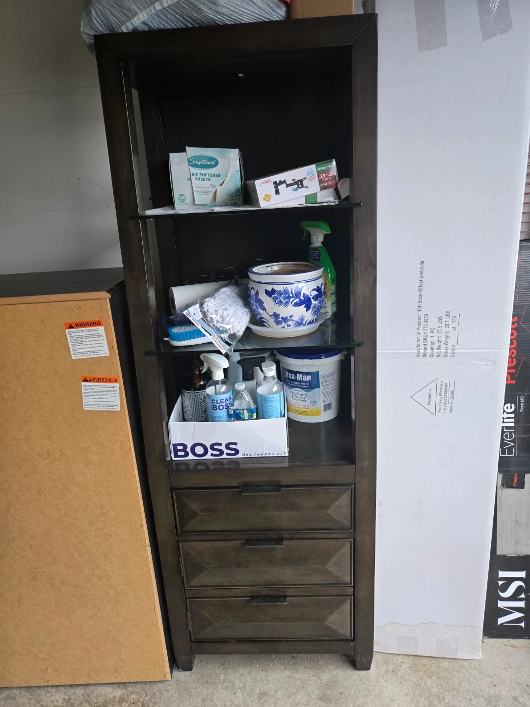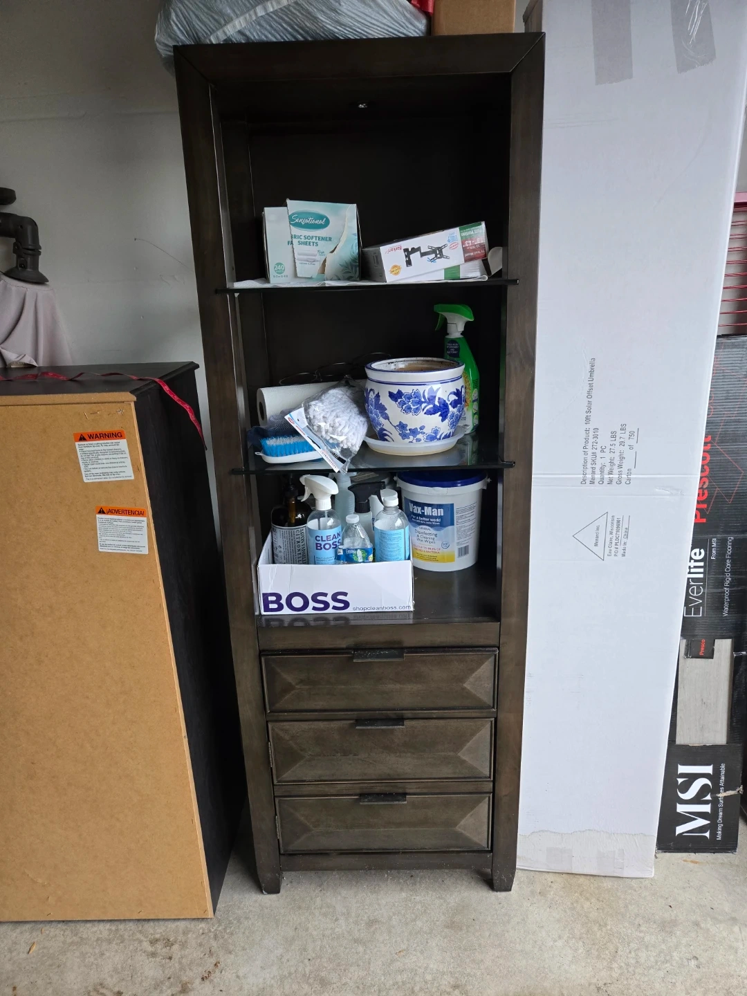 Selling a dark brown wooden bookcase. It has multiple shelves and drawers for storage. Great for books, decor, or other items! It's in good condition and ready for a new home
