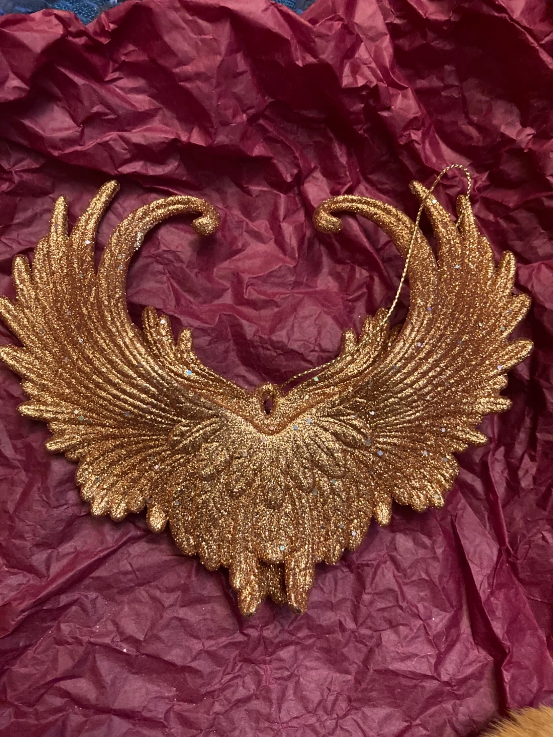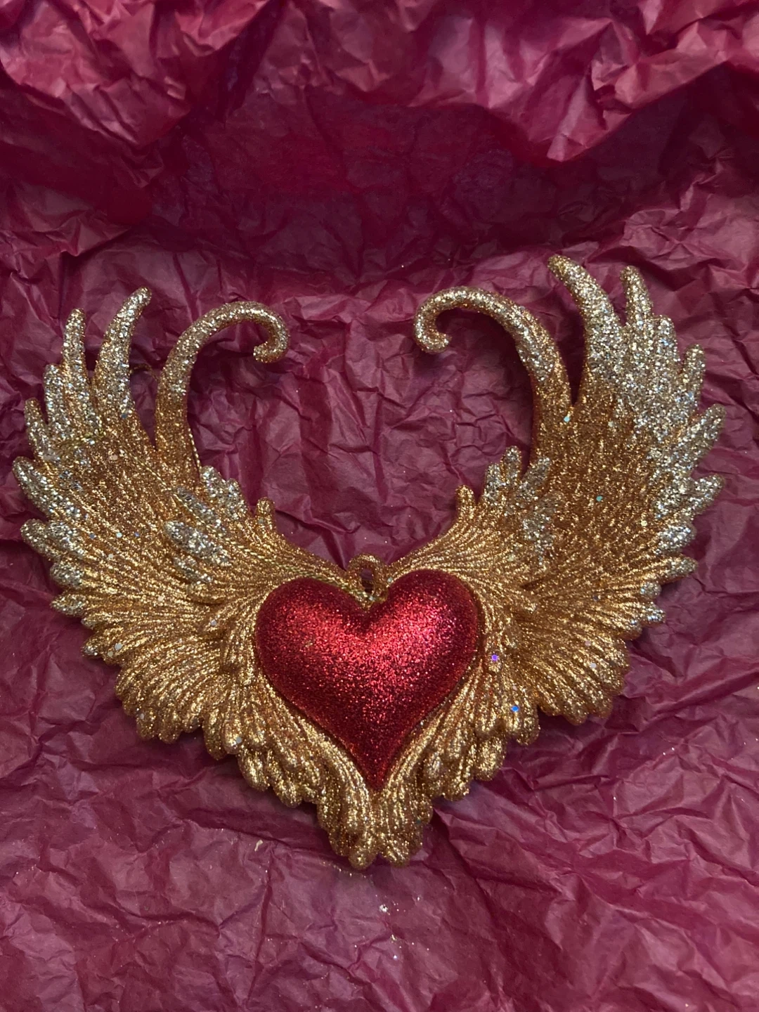 This is a beautiful large heart with wings ornament. It is gold and red with glitter. It would make a great addition to any collection. It glistens with the light. About 6 inches wide