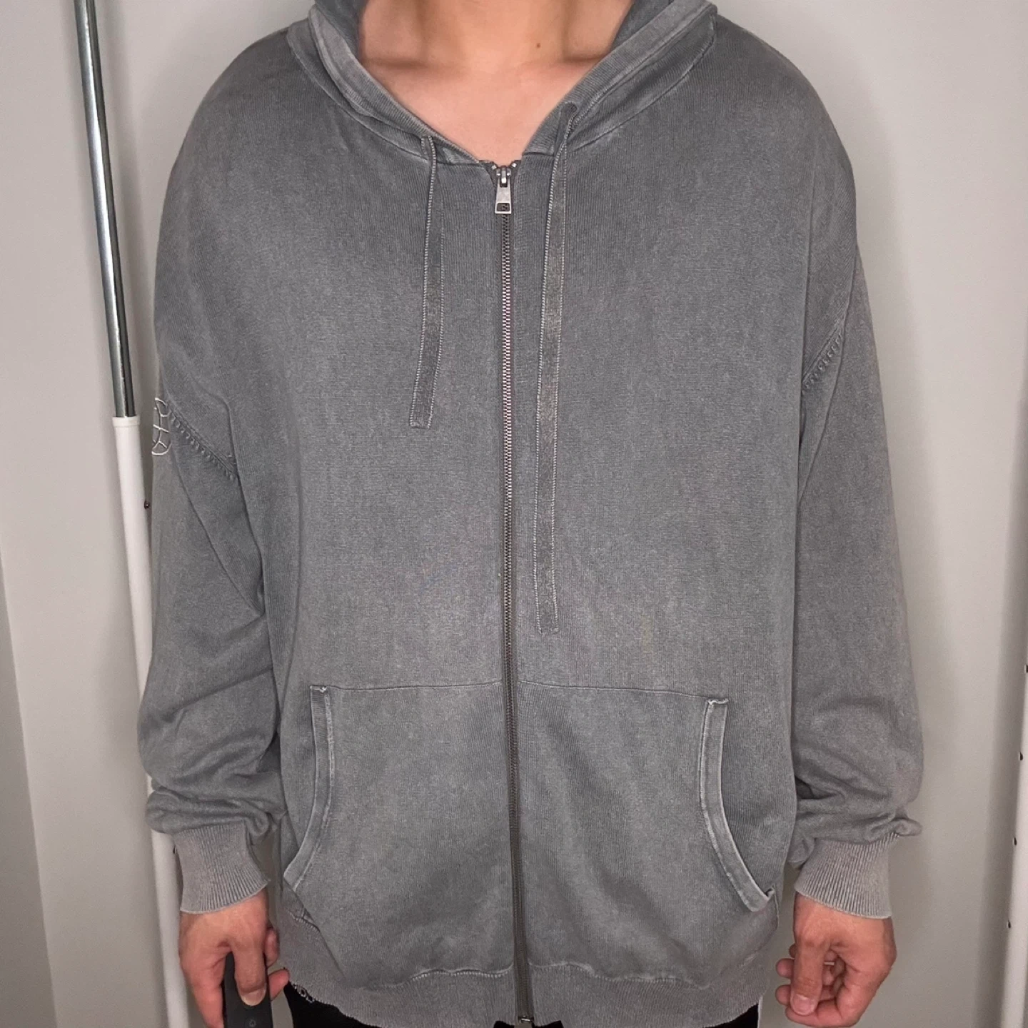 Selling a Zara zip-up hoodie in a grey colour. It's in great condition and has a unique design on the sleeve. Perfect for layering or wearing on its own!