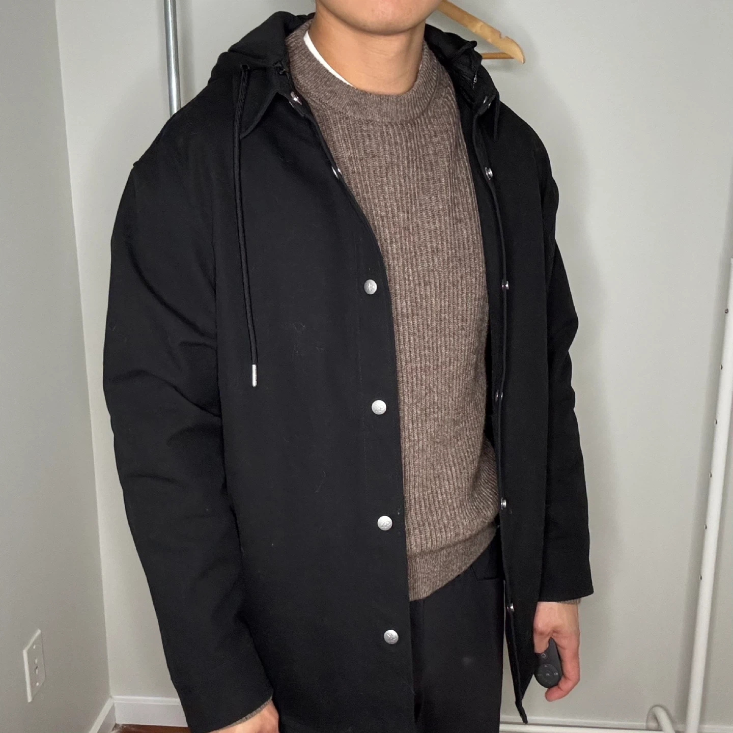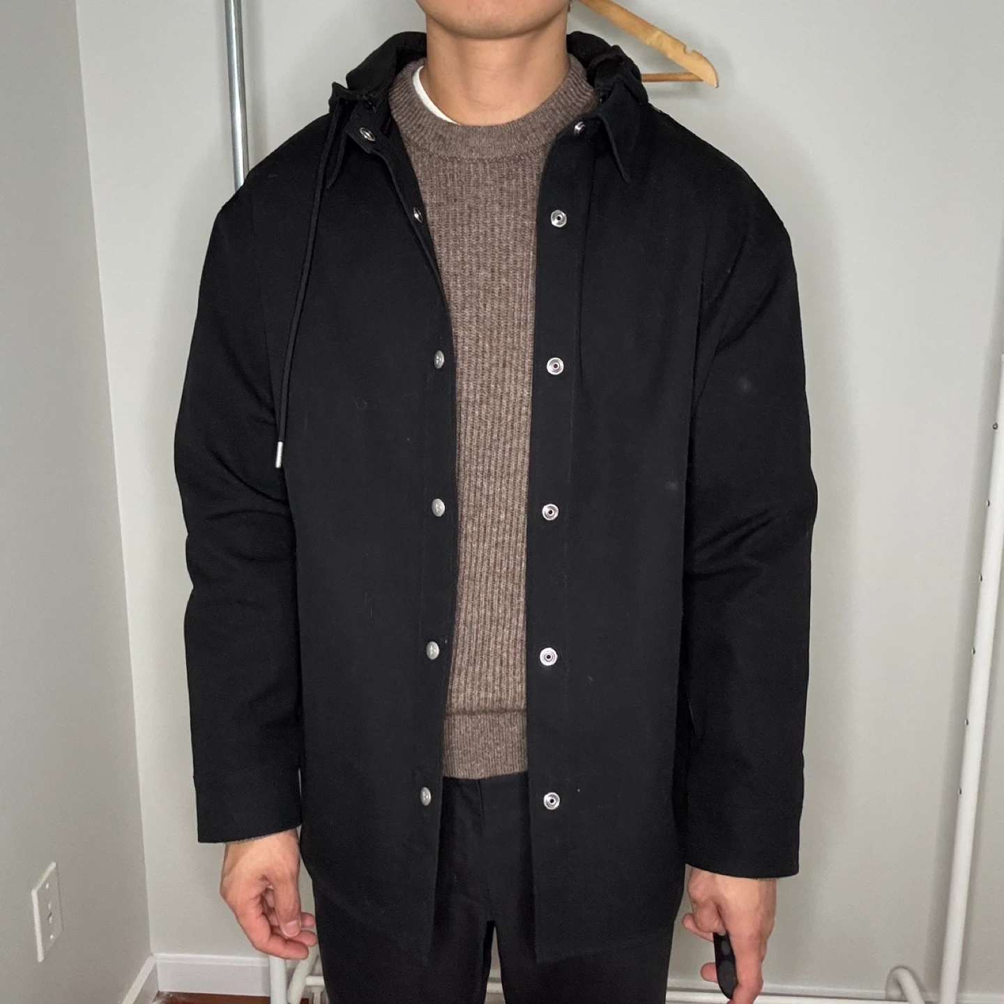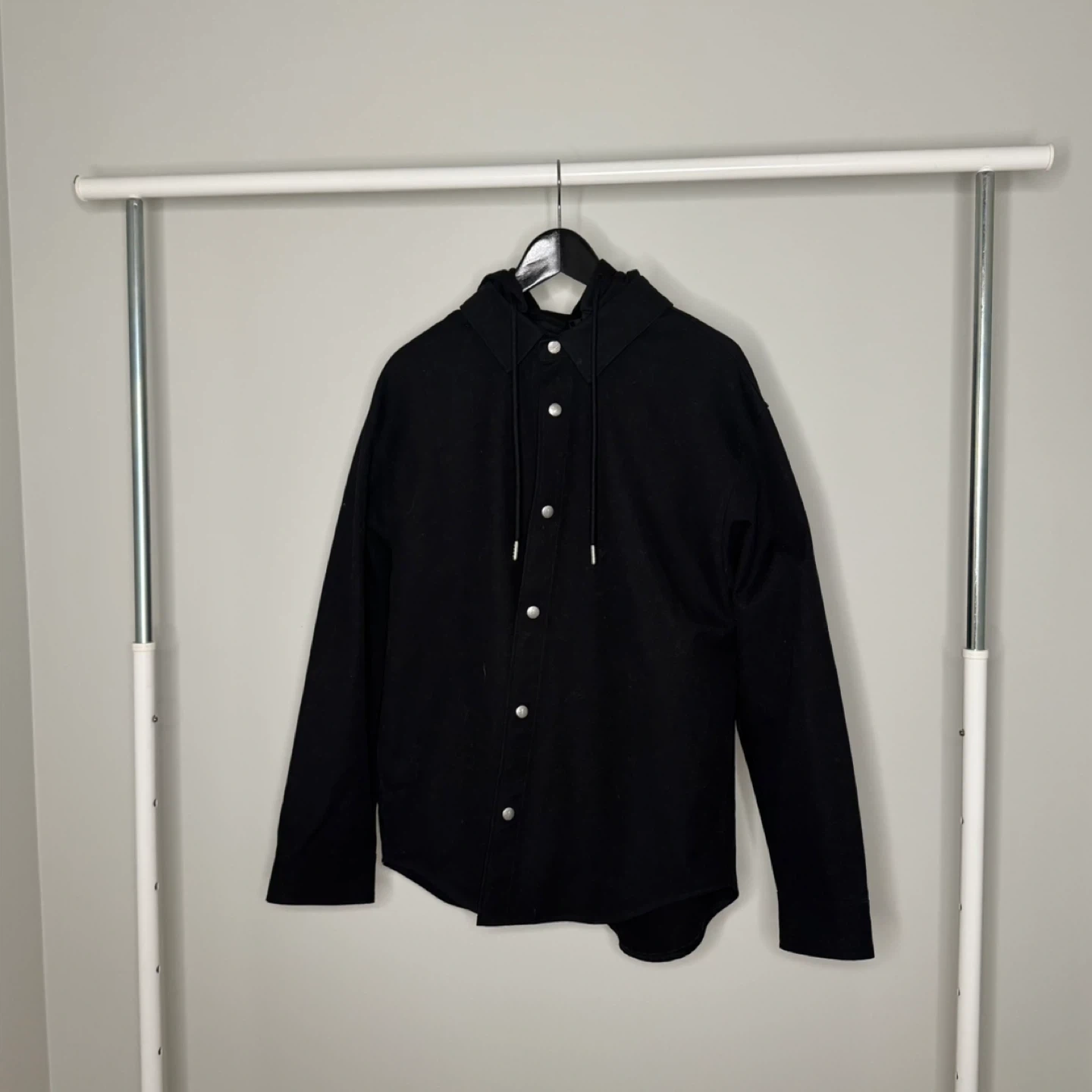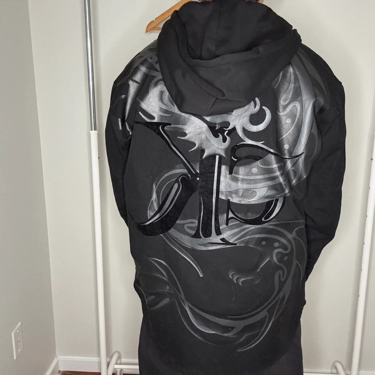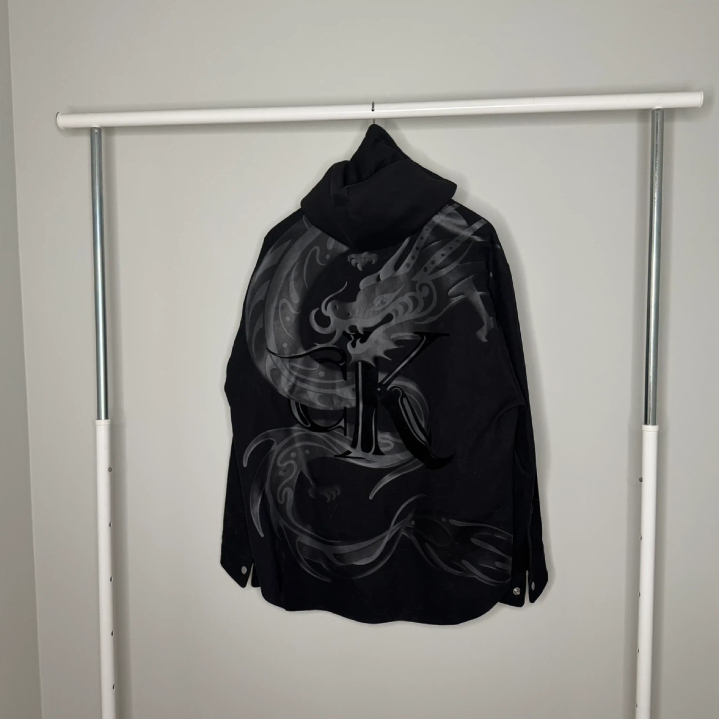 Selling a stylish black jacket featuring a unique dragon design on the back. It's in great condition and perfect for adding a bit of edge to your wardrobe. It has a hood and button closure.