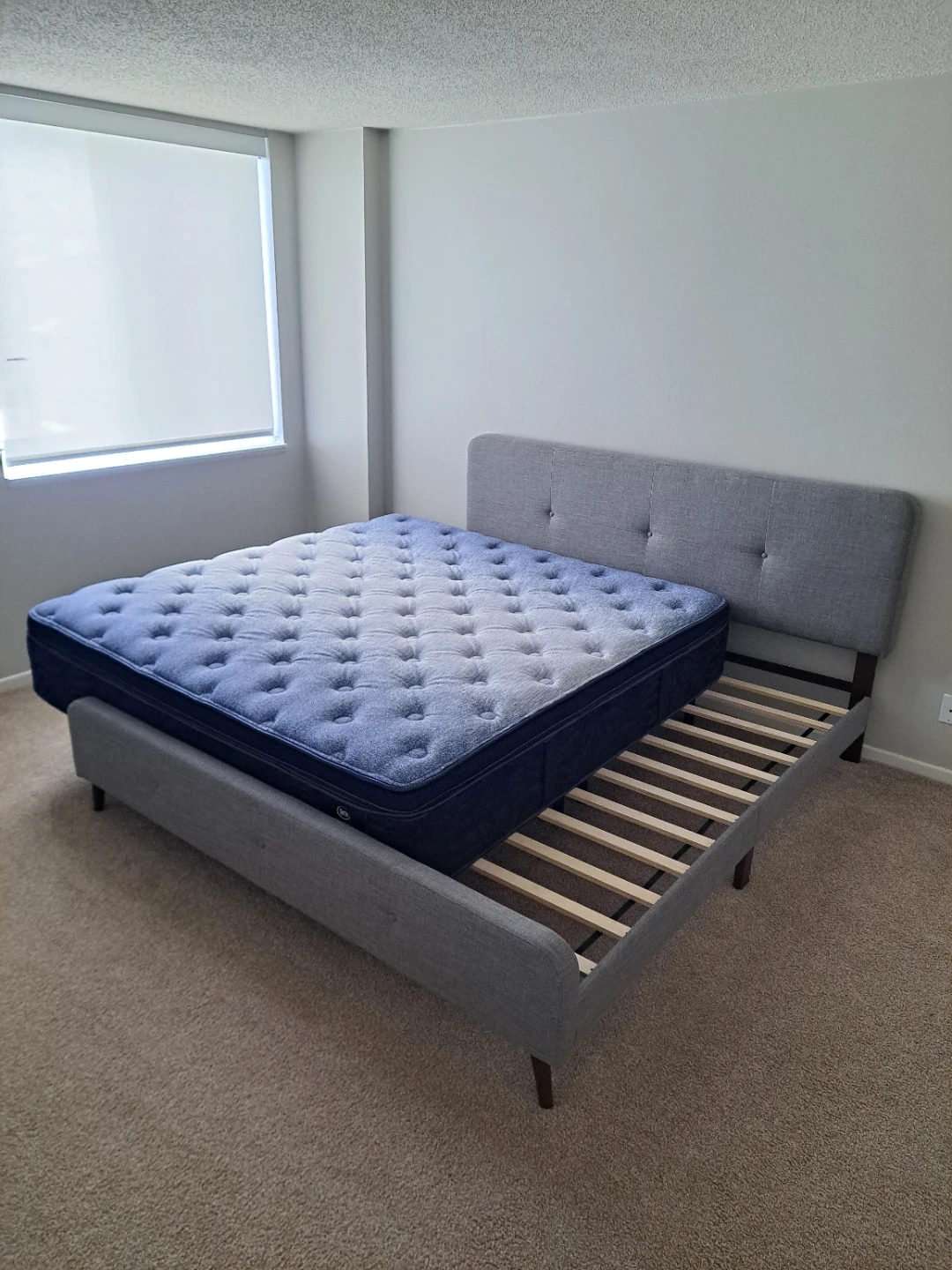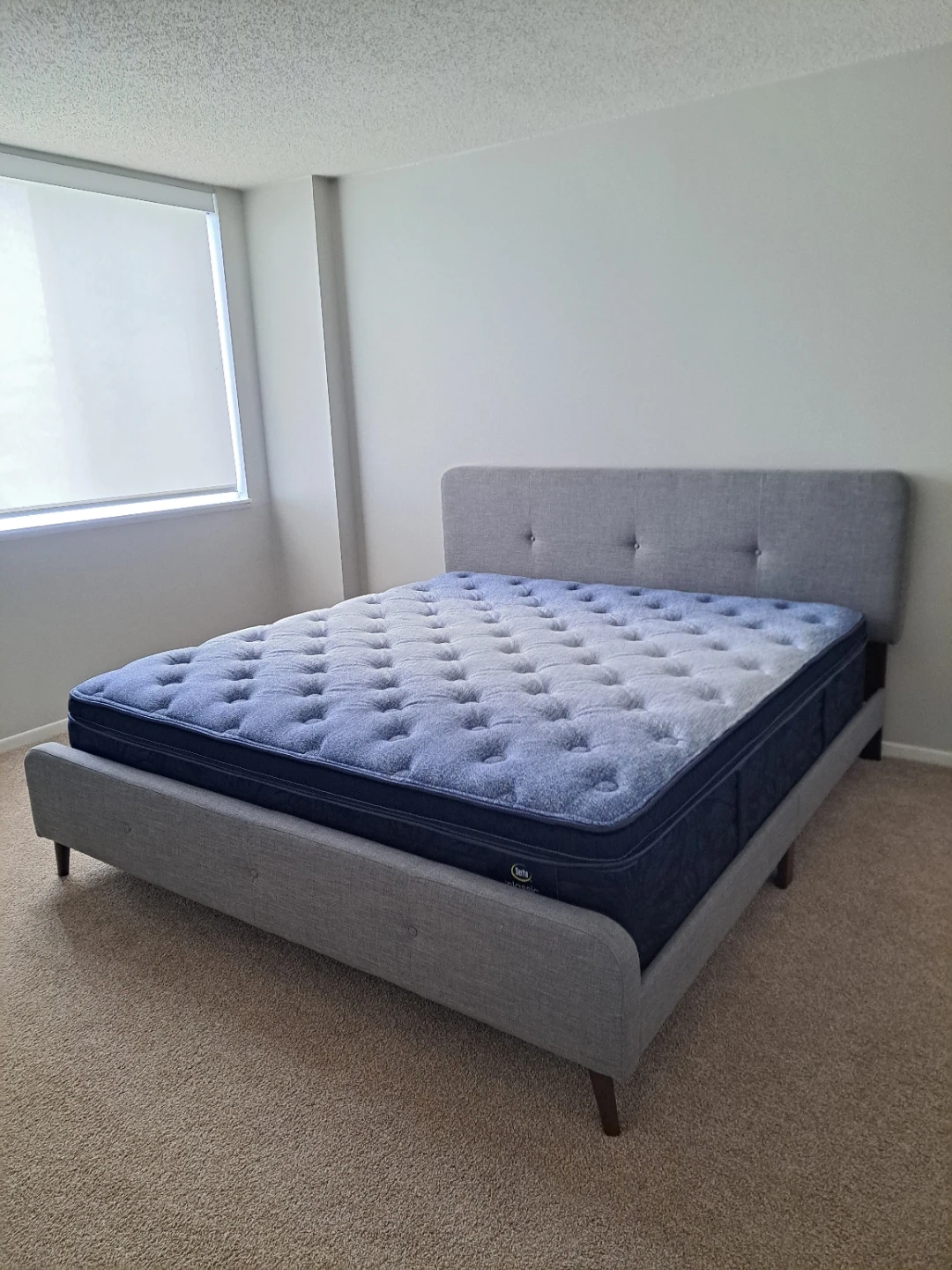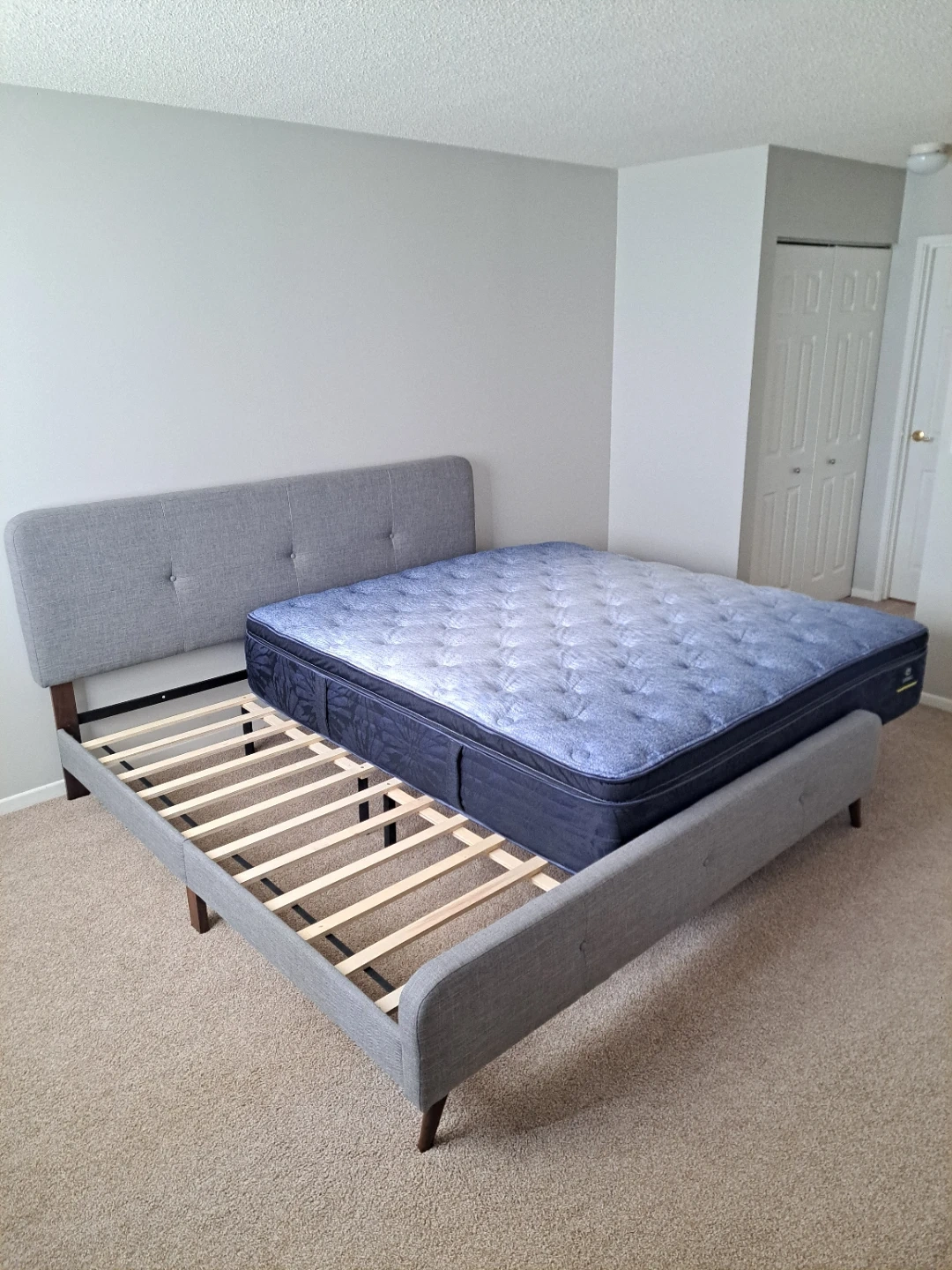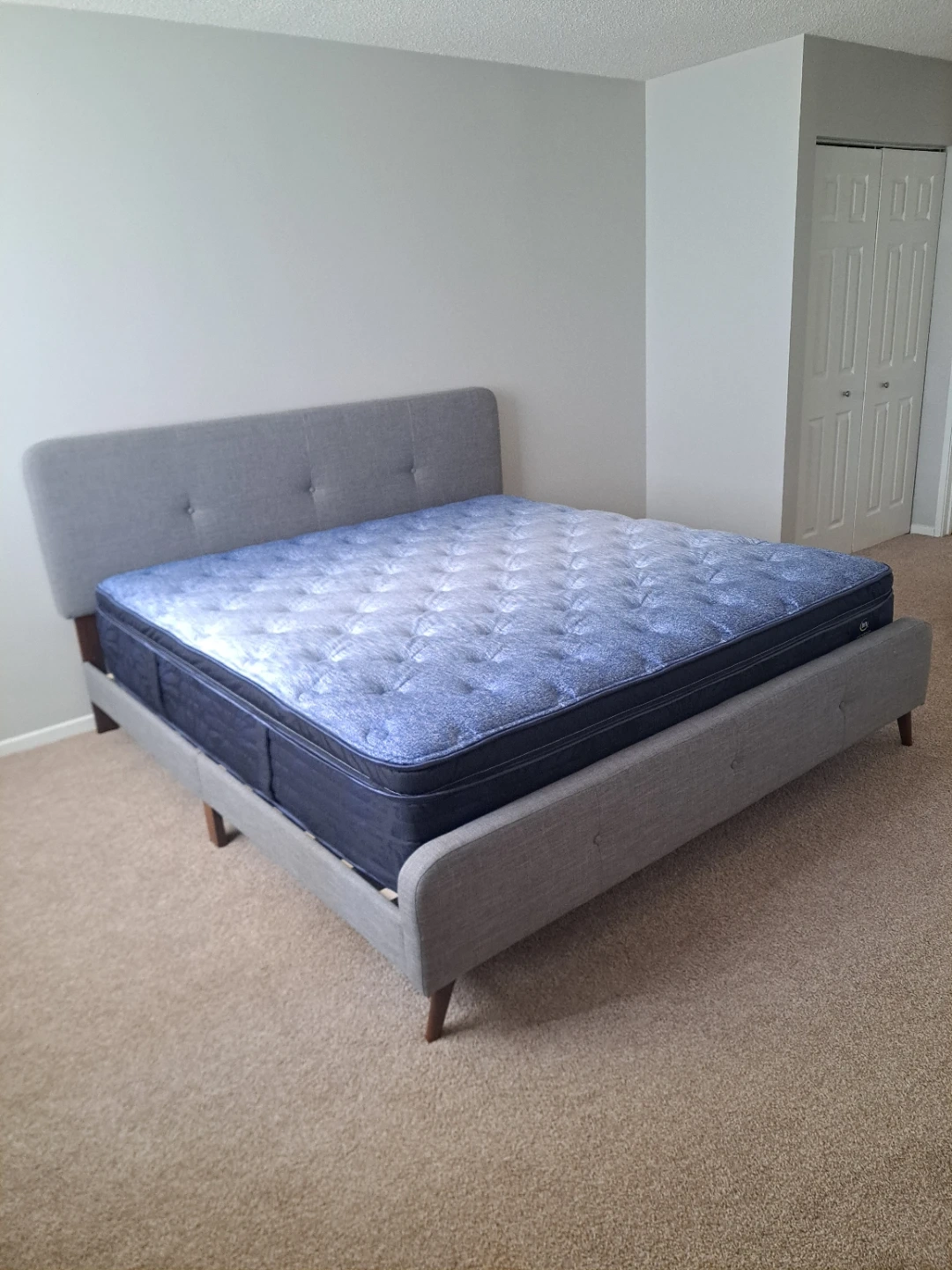 Selling a king size mattress with platform bed frame. The set is in great condition and ready for a new home! The mattress is a Serta brand. The bed frame is a light gray color. Totally new.