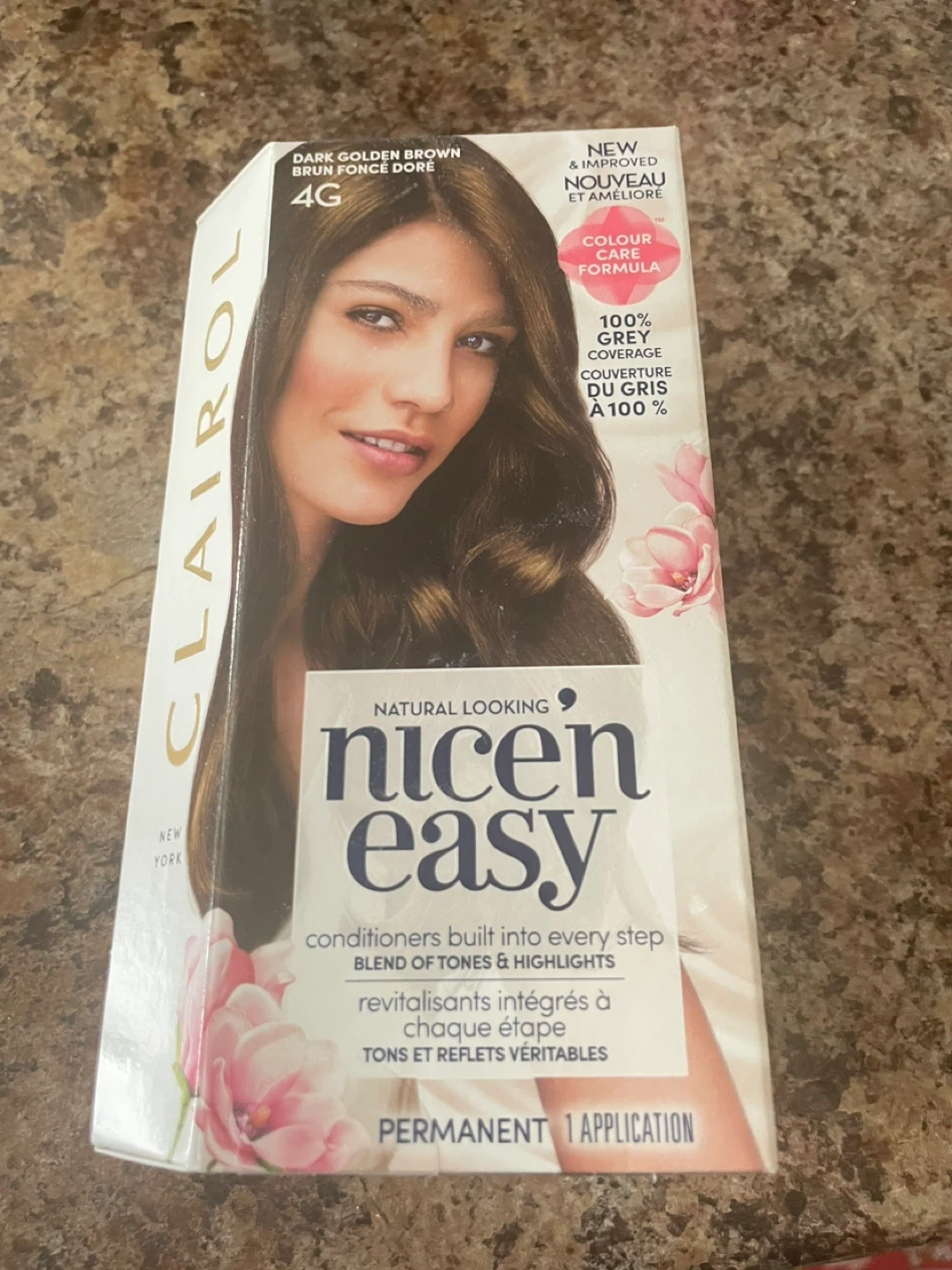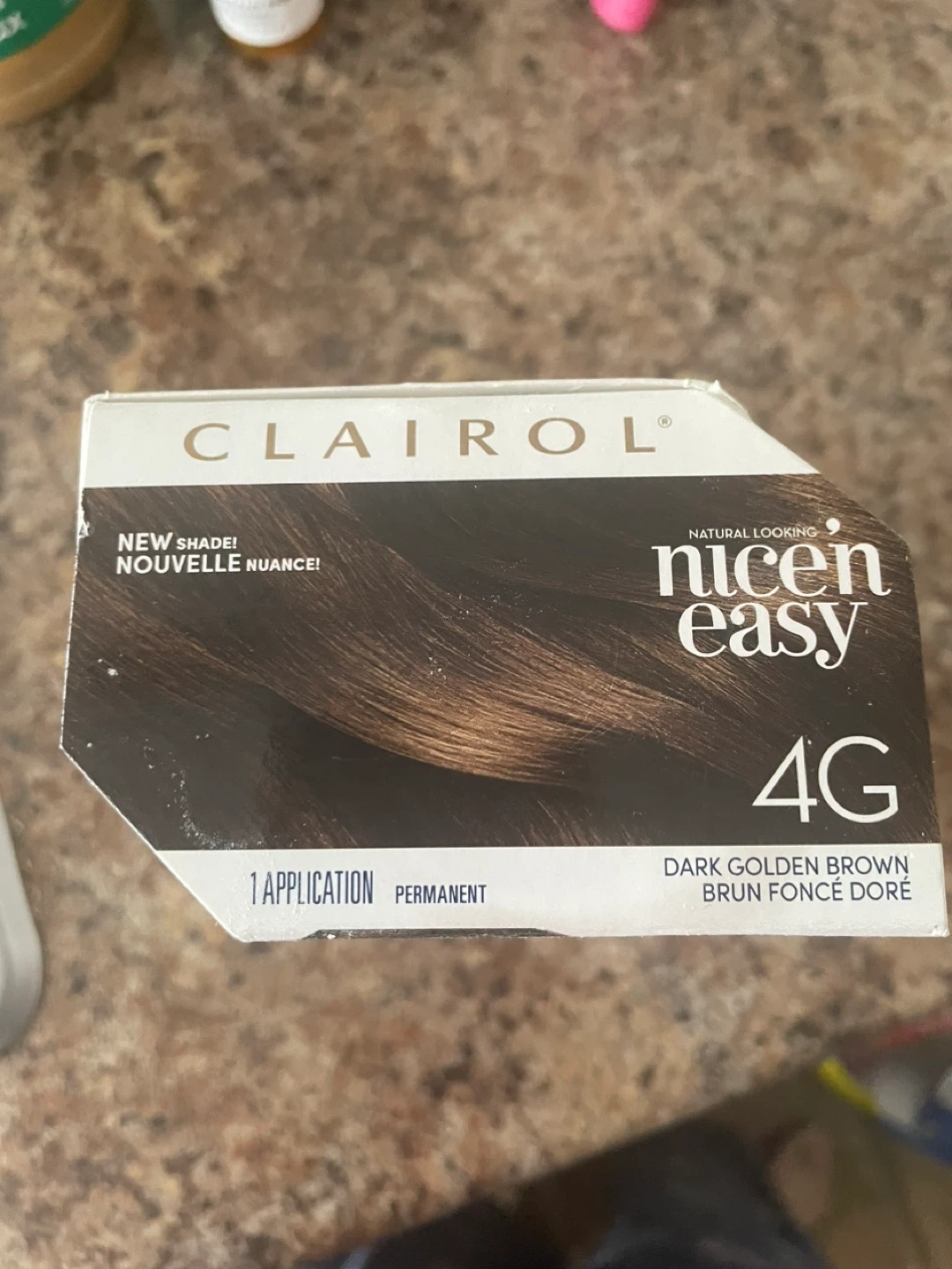 Selling a box of Clairol Nice'n Easy hair dye in the shade 4G Dark Golden Brown. It's a permanent hair colour for one application. Get natural-looking tones and highlights with this easy-to-use kit!