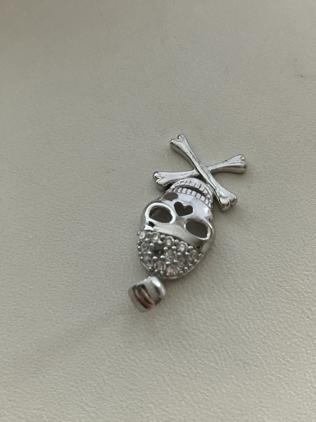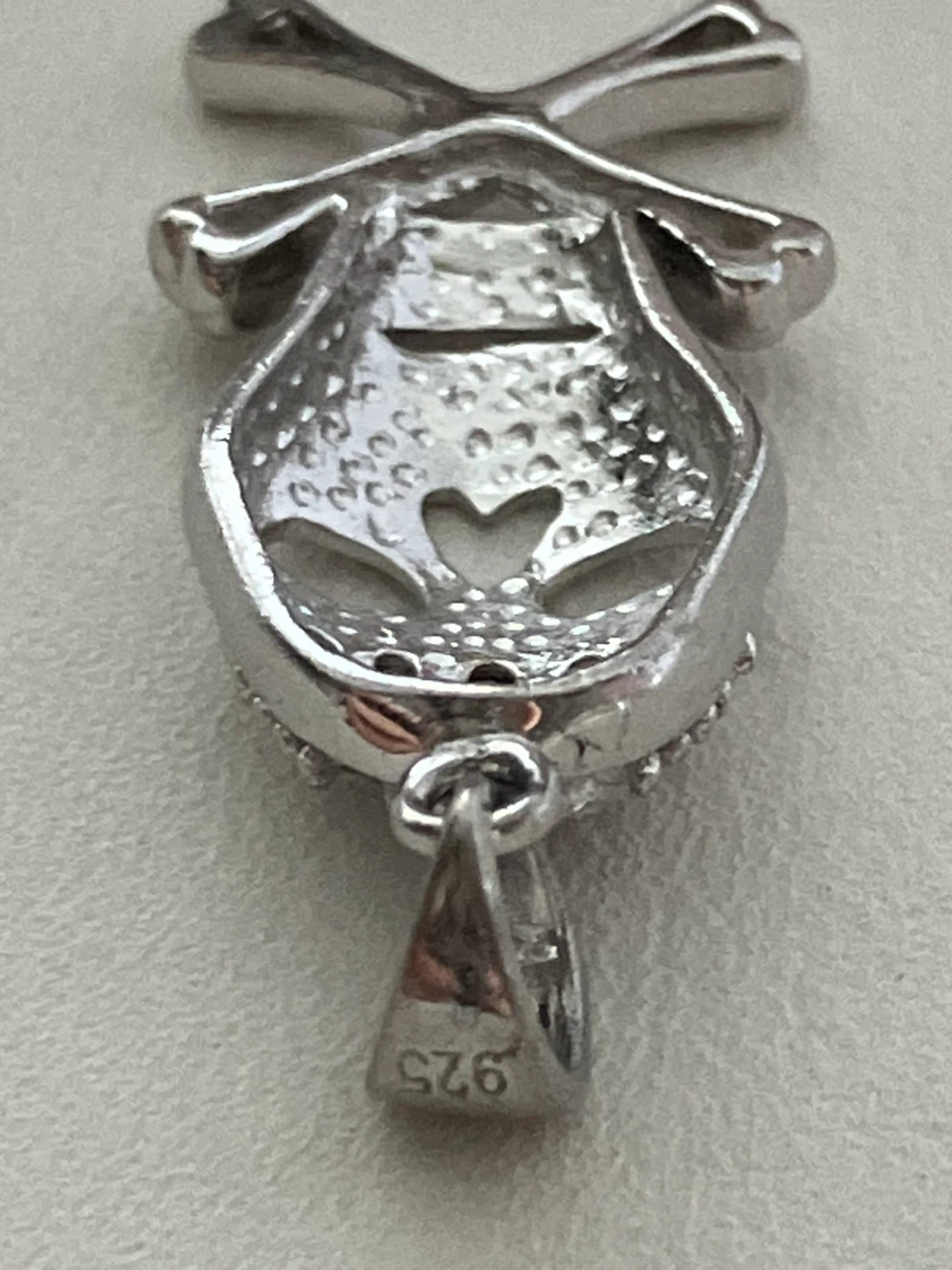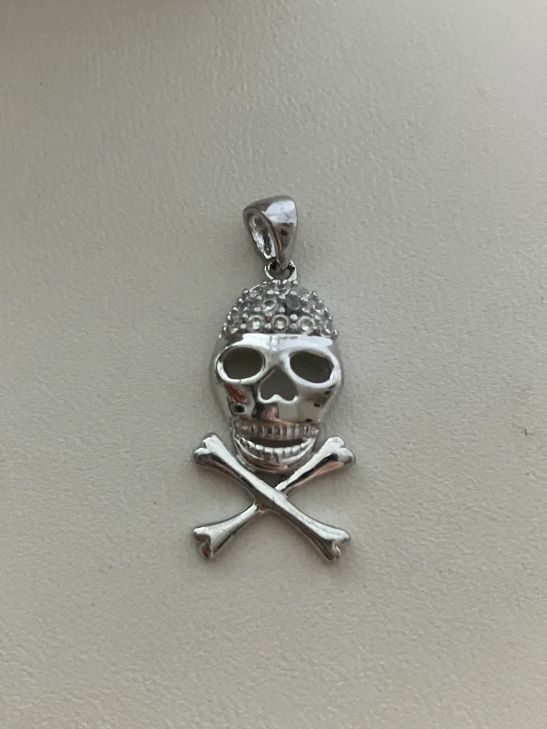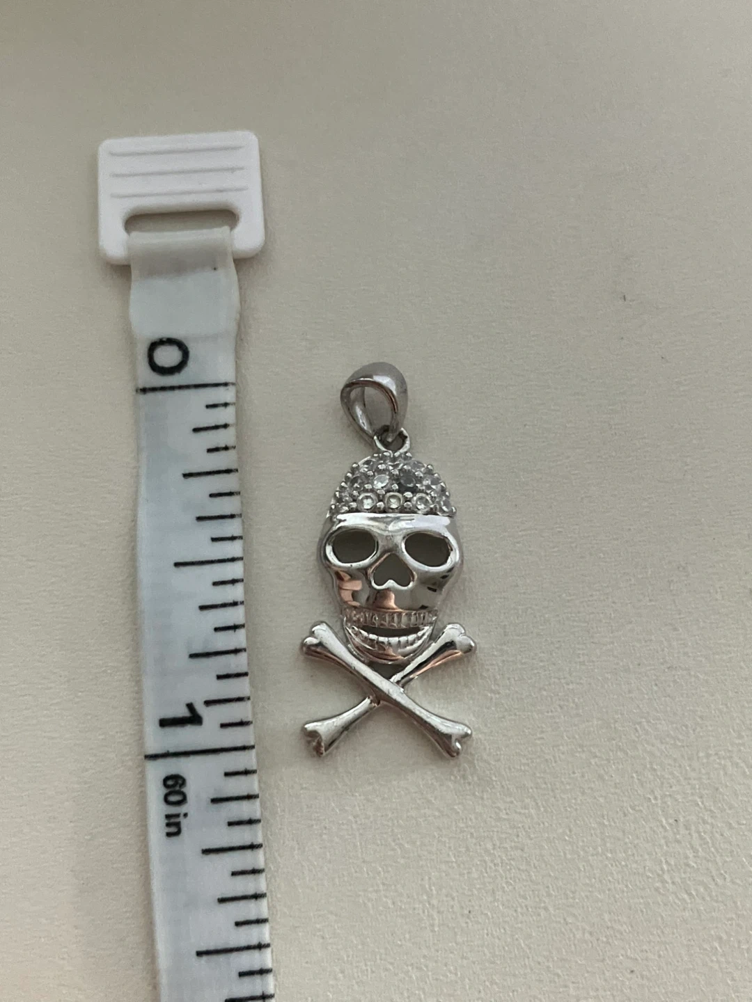 Here's a cool sterling silver pendant featuring a skull and crossbones design! It's marked with '925', indicating it's made of sterling silver. The skull has some sparkly accents, adding a bit of flair to the piece