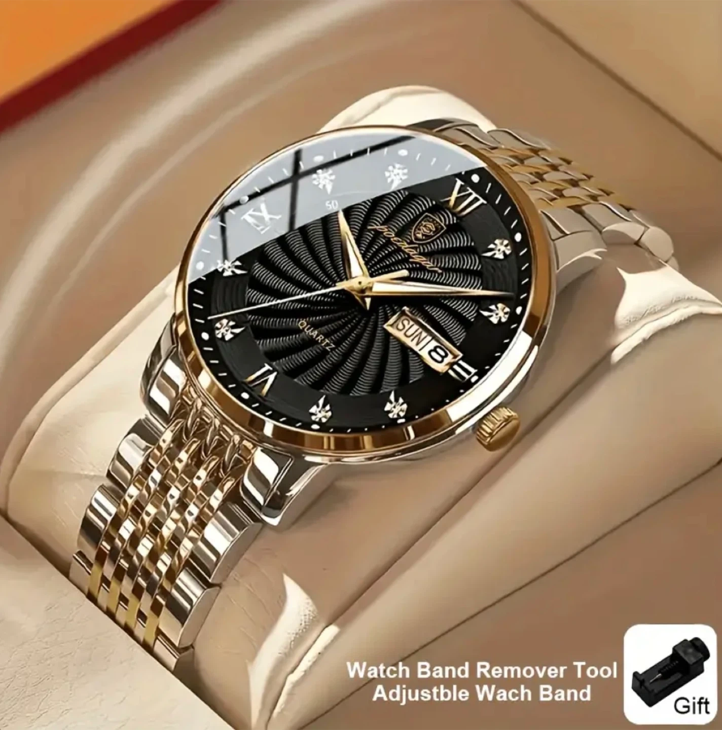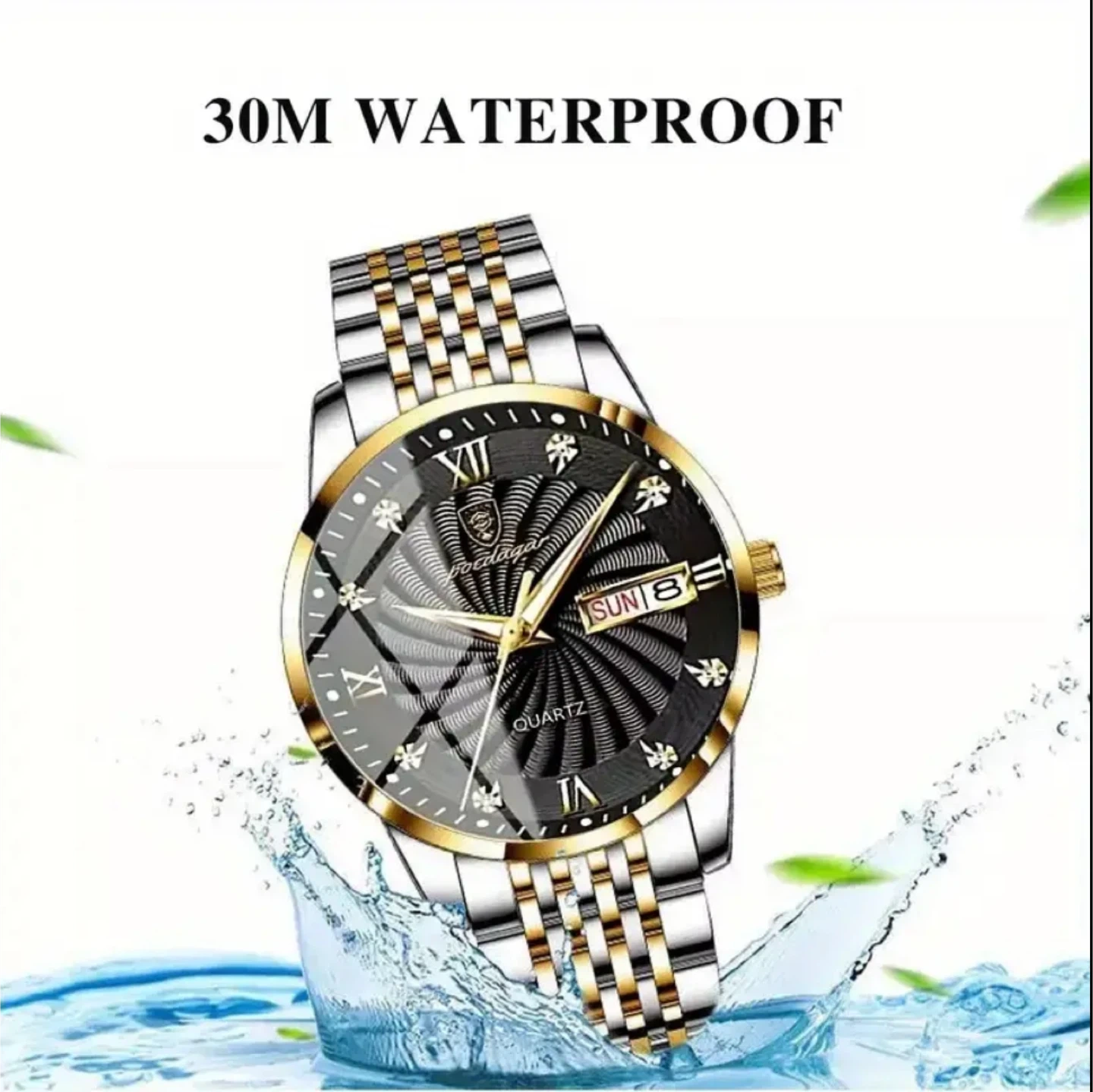This watch is a men's fashion style. It features a dial diameter of 42mm/1.65inch and a dial thickness of 10mm/0.40inch. The band width is 20mm/0.78inch and the band length is 28cm/11.02inch. It's also 30M waterproof and has a strong luminous display, making it easy to read at night.