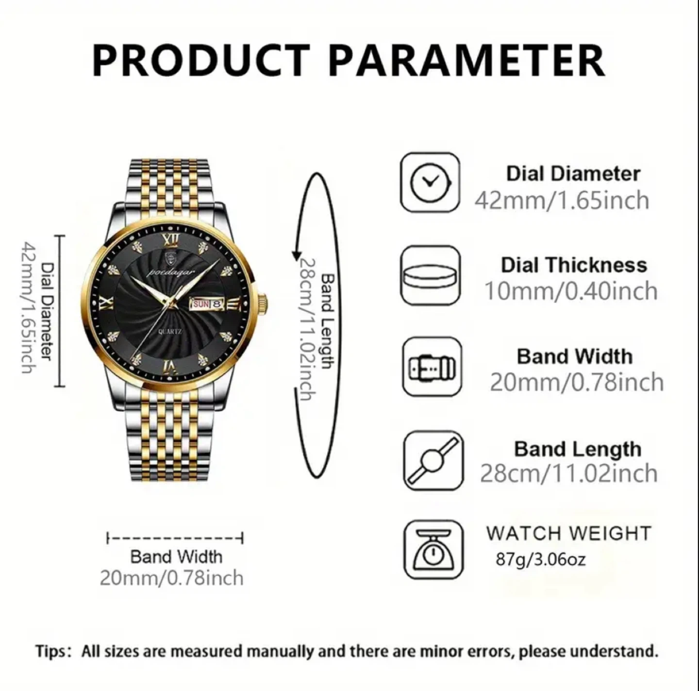 This watch is a men's fashion style. It features a dial diameter of 42mm/1.65inch and a dial thickness of 10mm/0.40inch. The band width is 20mm/0.78inch and the band length is 28cm/11.02inch. It's also 30M waterproof and has a strong luminous display, making it easy to read at night.