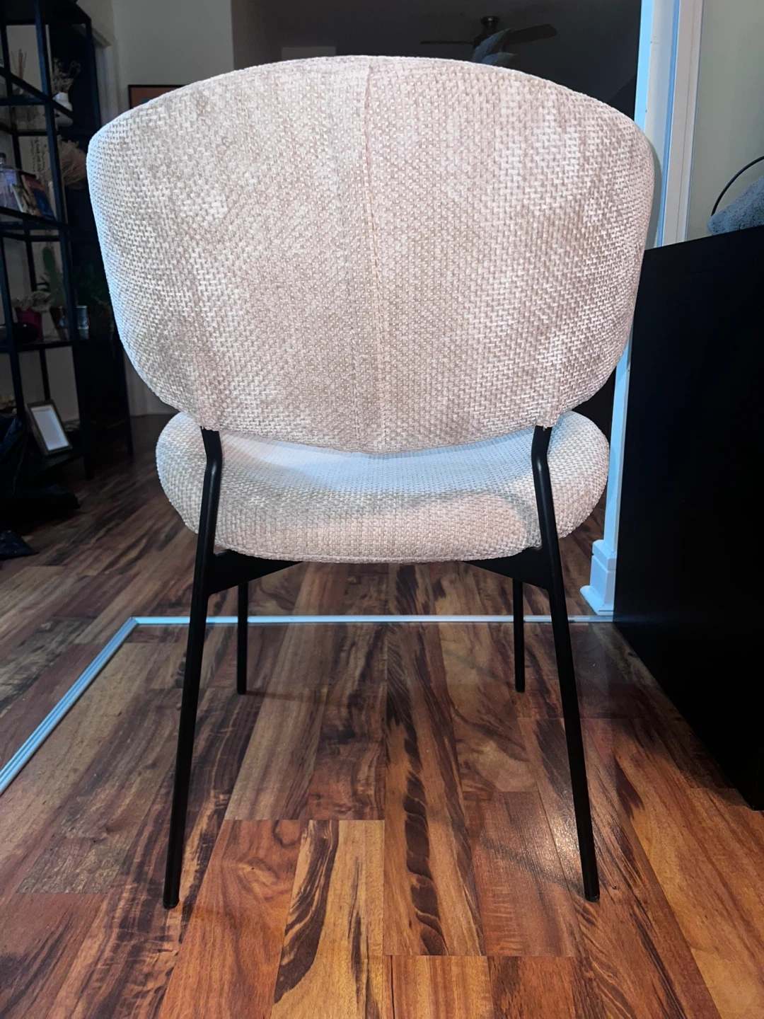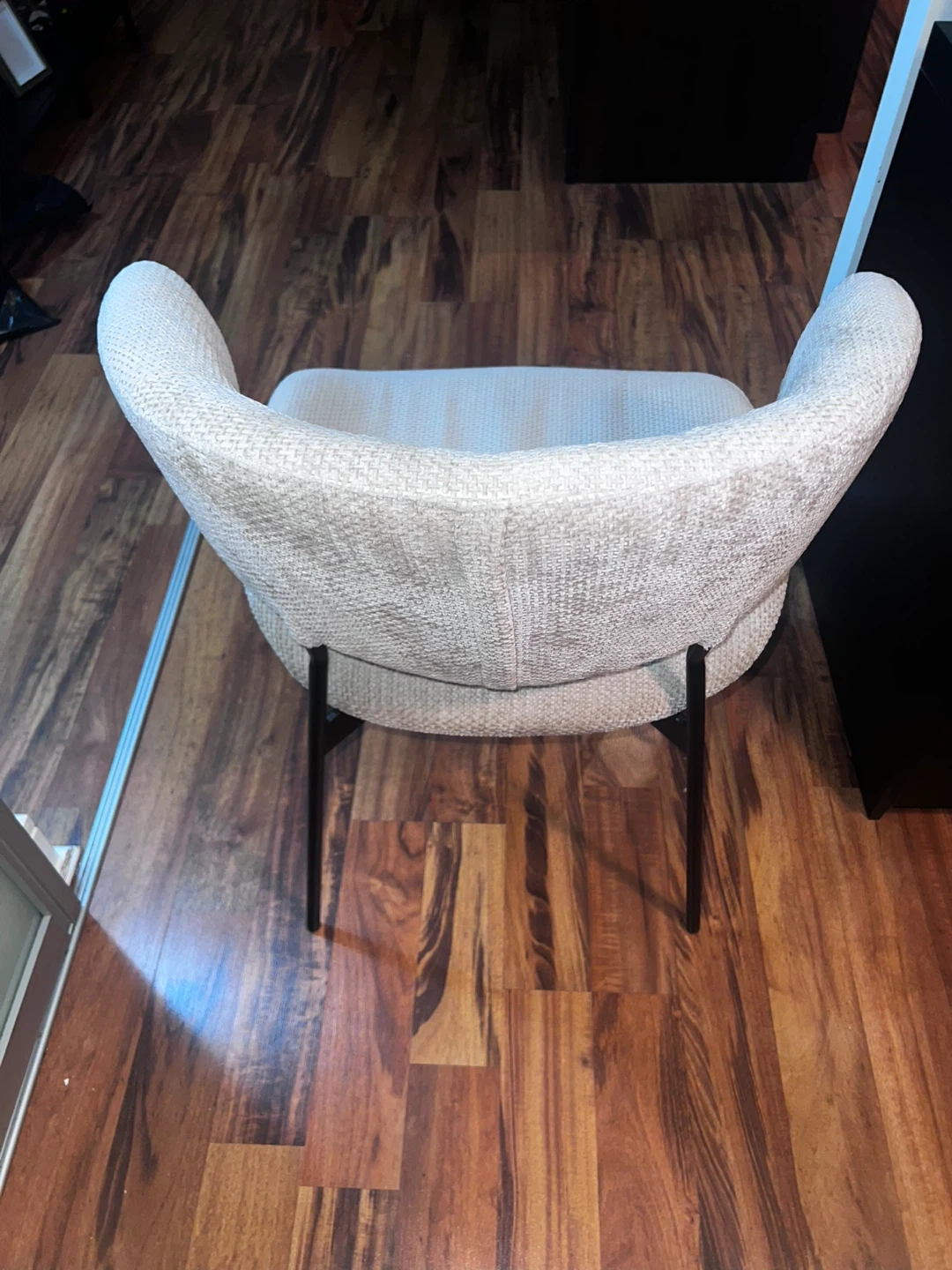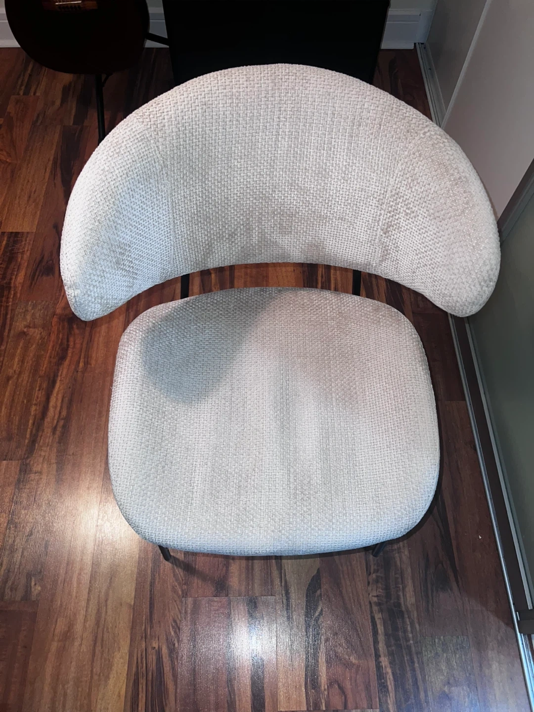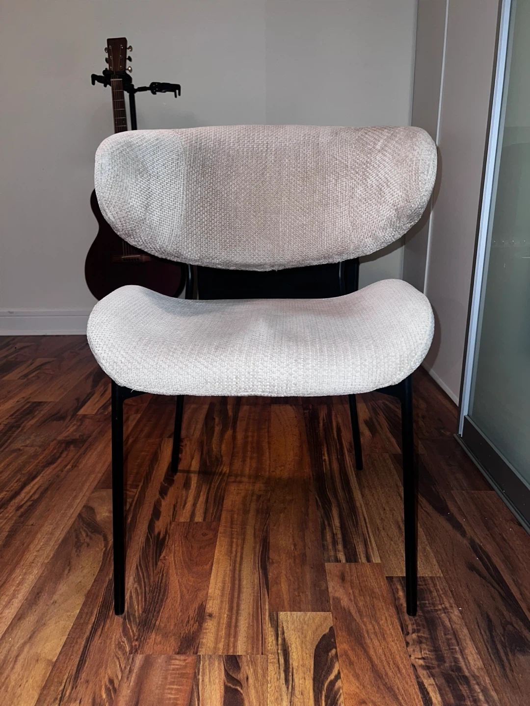 Selling a modern chair with a cream-coloured upholstered seat and back. The frame is black metal. It's in great shape and would look great in any room or office!