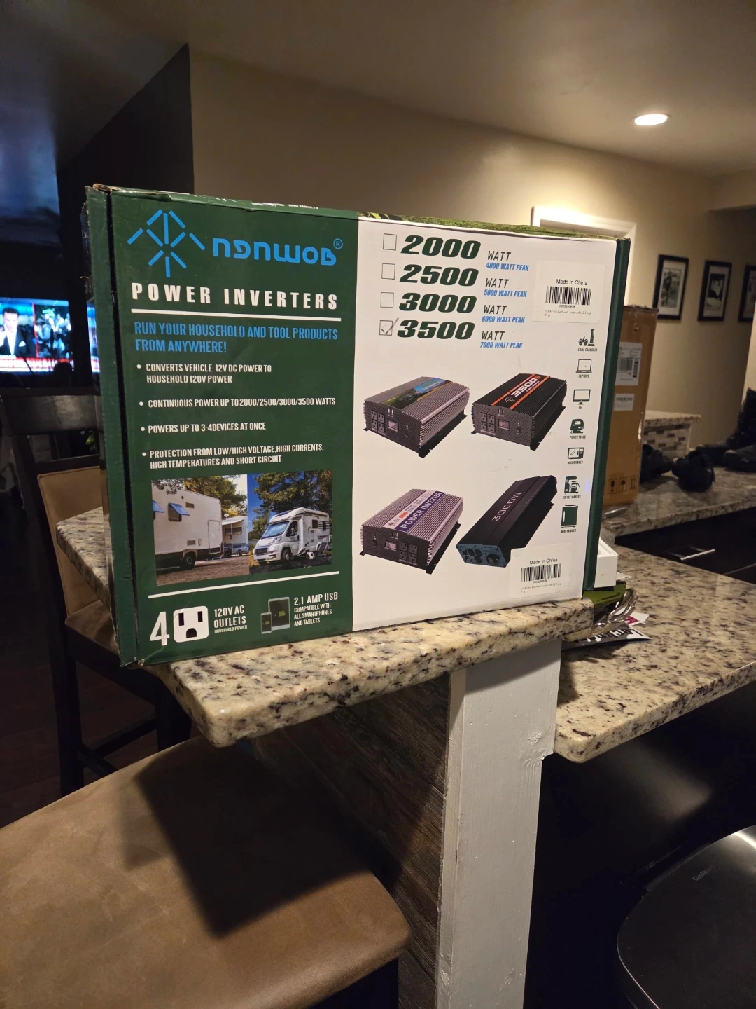 Selling a NONWOD power inverter that can run your household and tool products from anywhere! It converts vehicle 12V DC power to household 120V power and provides continuous power up to 2000/2500/3000/3500 watts. It can power up to 3-4 devices at once and offers protection from low/high voltage, high currents, high temperatures, and short circuits. It has 4 120V AC outlets and a 2.1 amp USB compatible with all smartphones and tablets.