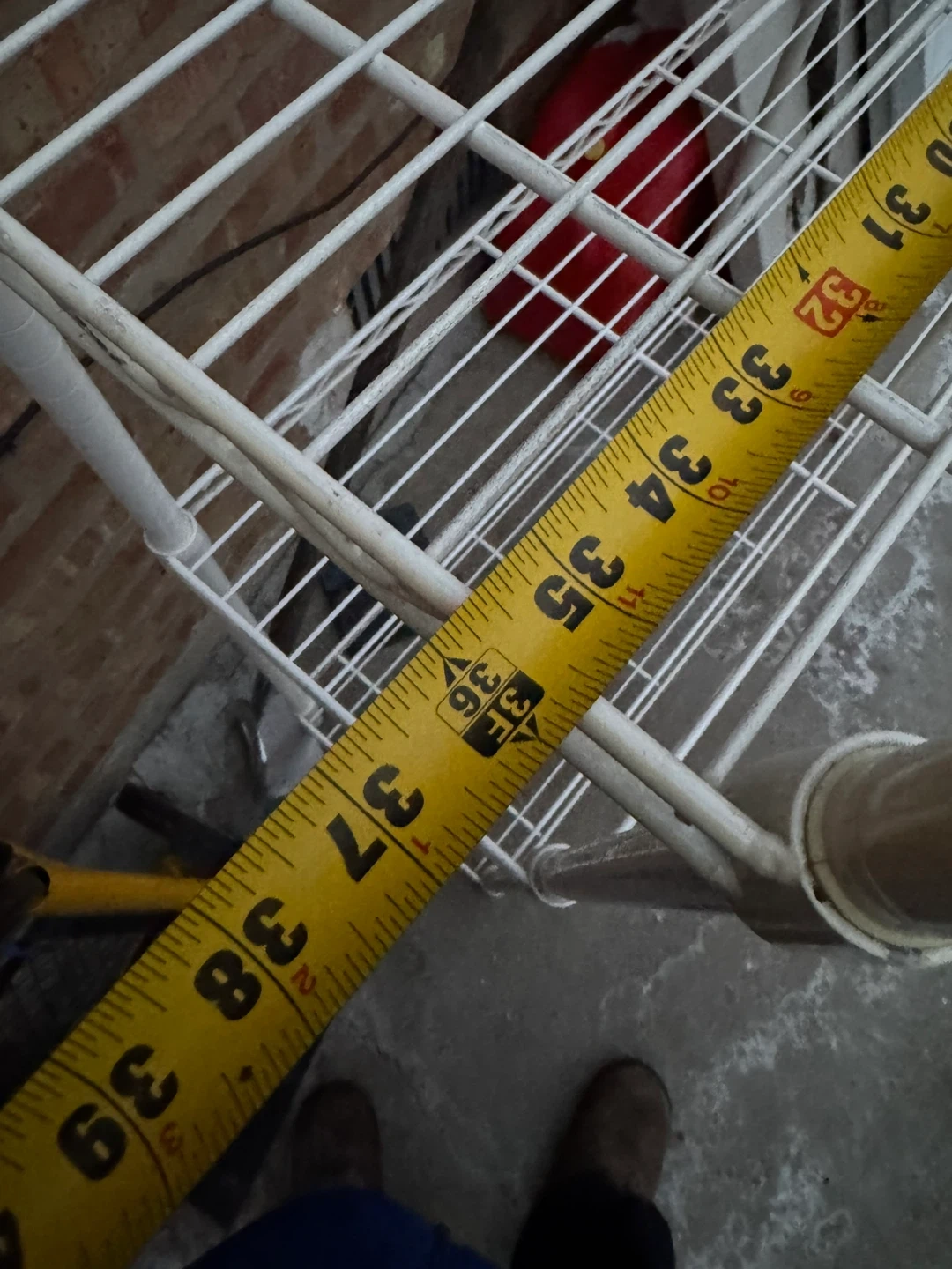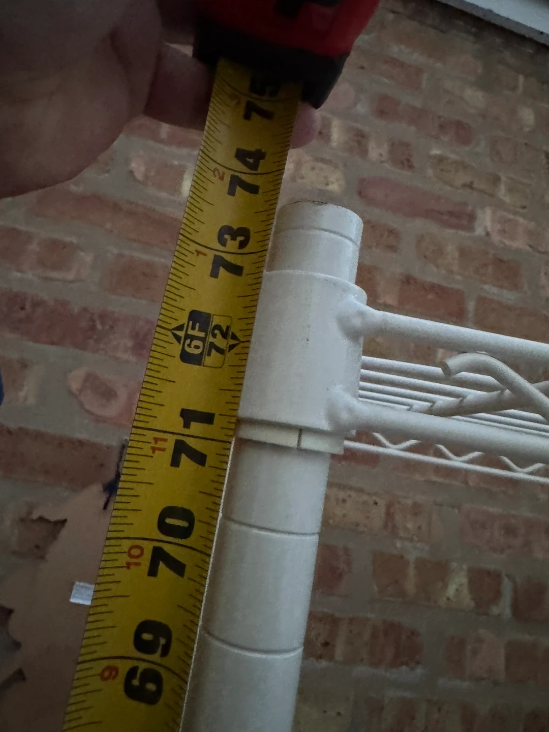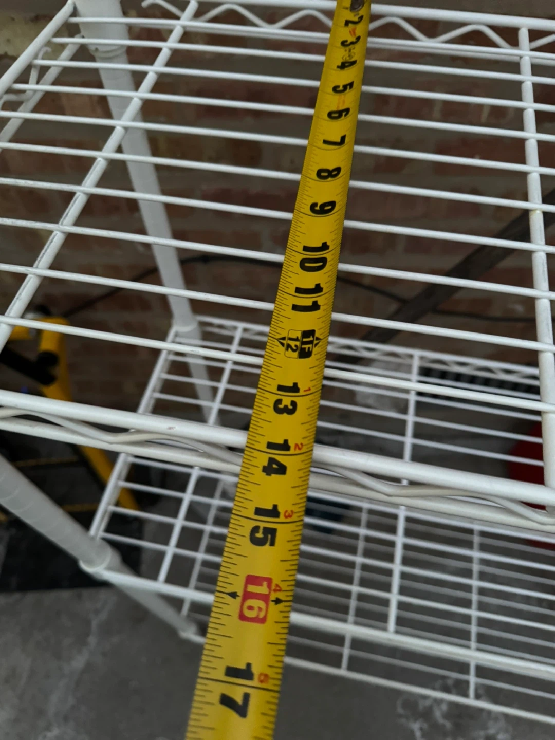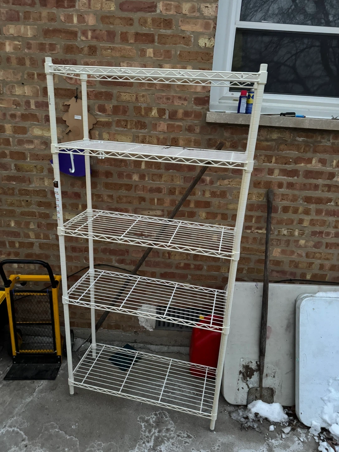 Selling a white wire shelf unit with 5 tiers. It's great for storage and organization in any room. The shelves are approximately 36 inches wide and 16 inches deep. The unit is about 74 inches tall.