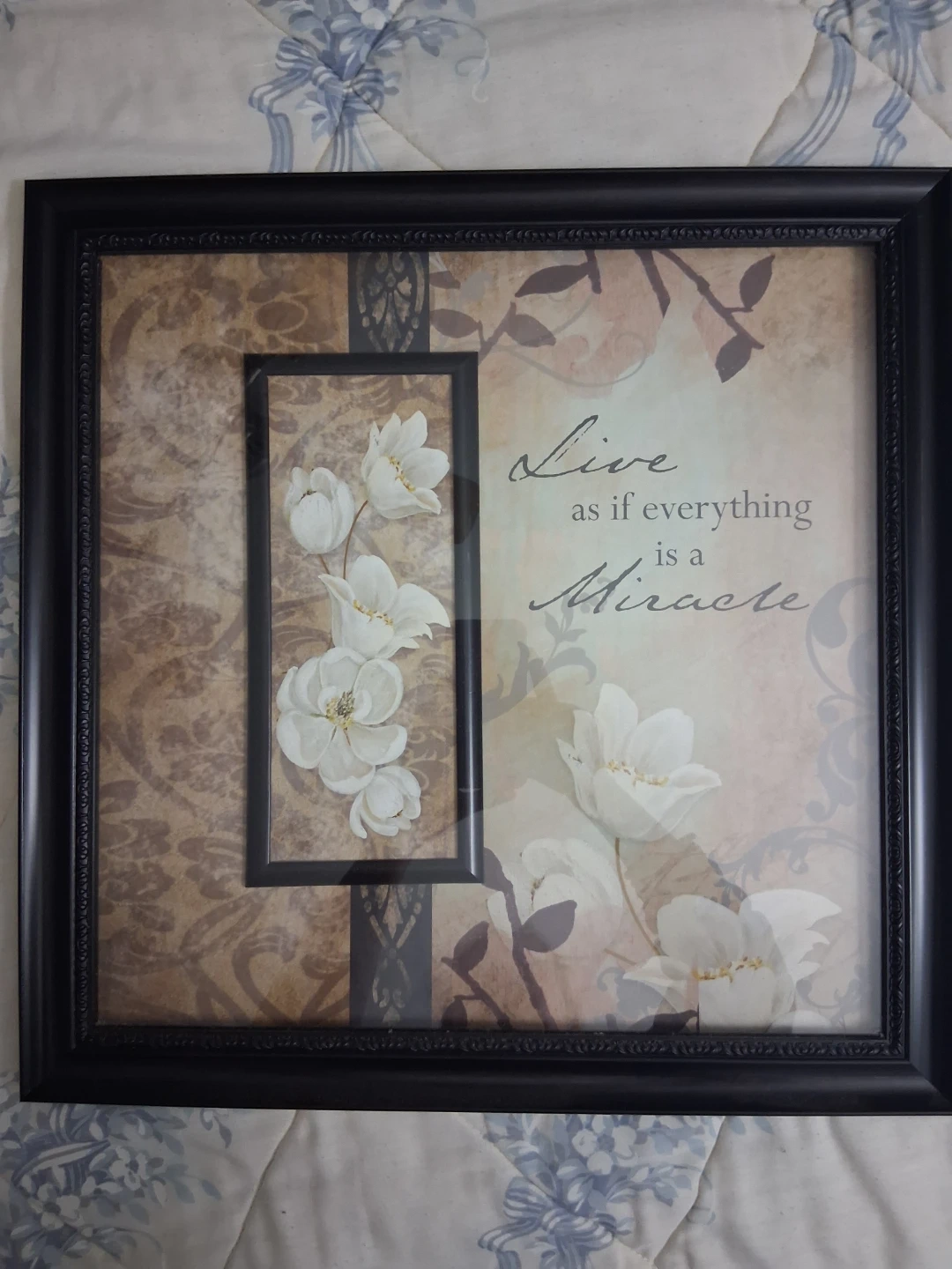 This is a framed wall art piece from Interior Illusions. It features a floral design and the text "Live as if everything is a Miracle". It's a beautiful piece to add to your home decor. Like New Condition 18.5" x 18.5". Best Offer accepted.