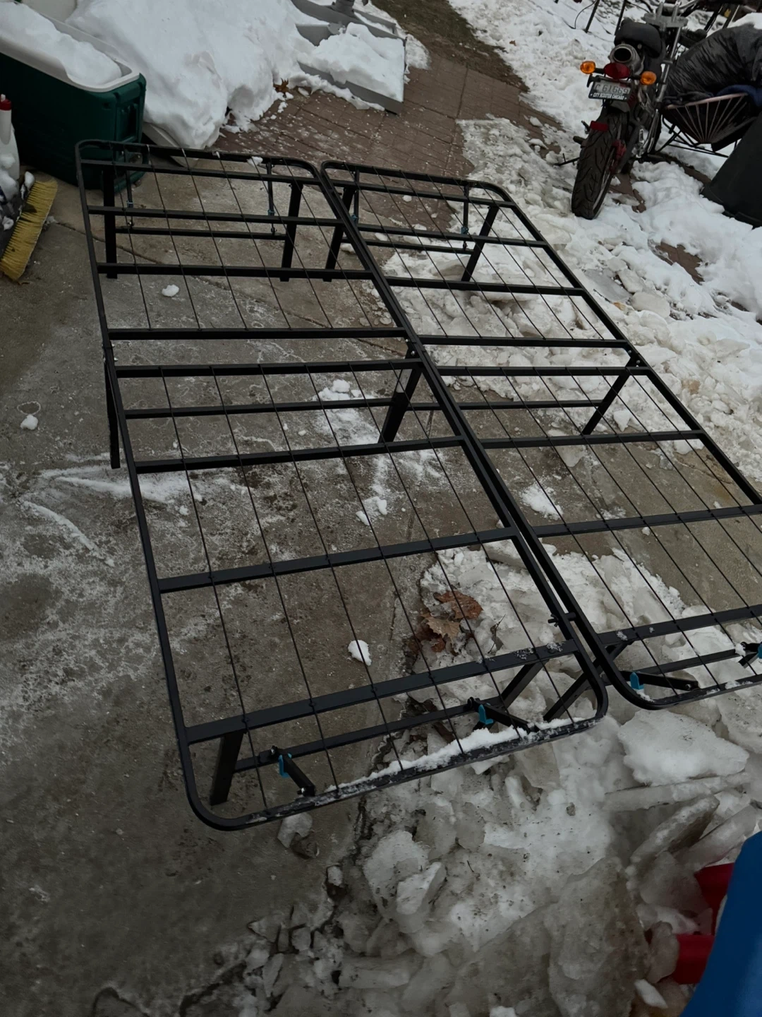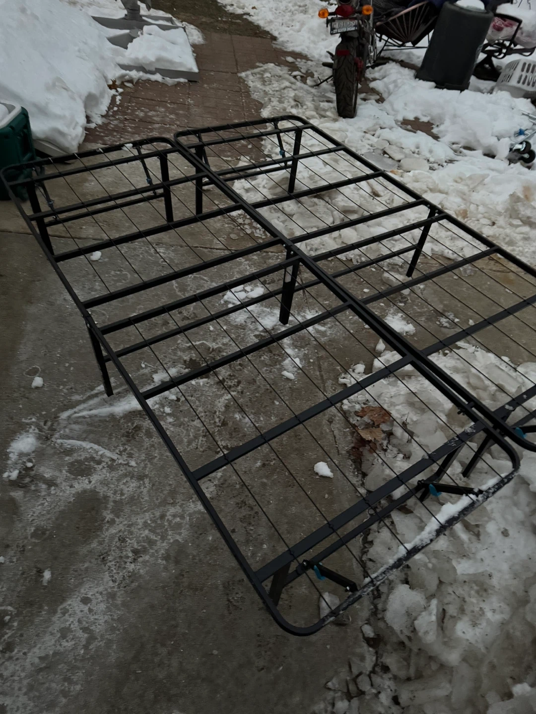 Selling a full-size metal bed frame. It's in good condition and ready to use. Measures approximately 80 inches long and 60 inches wide. This frame is sturdy and reliable for a comfortable night's sleep!