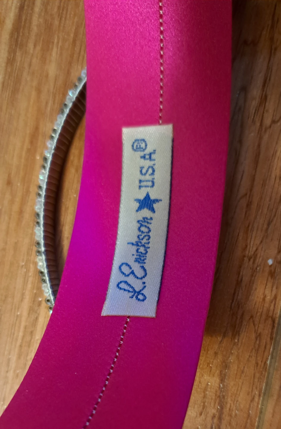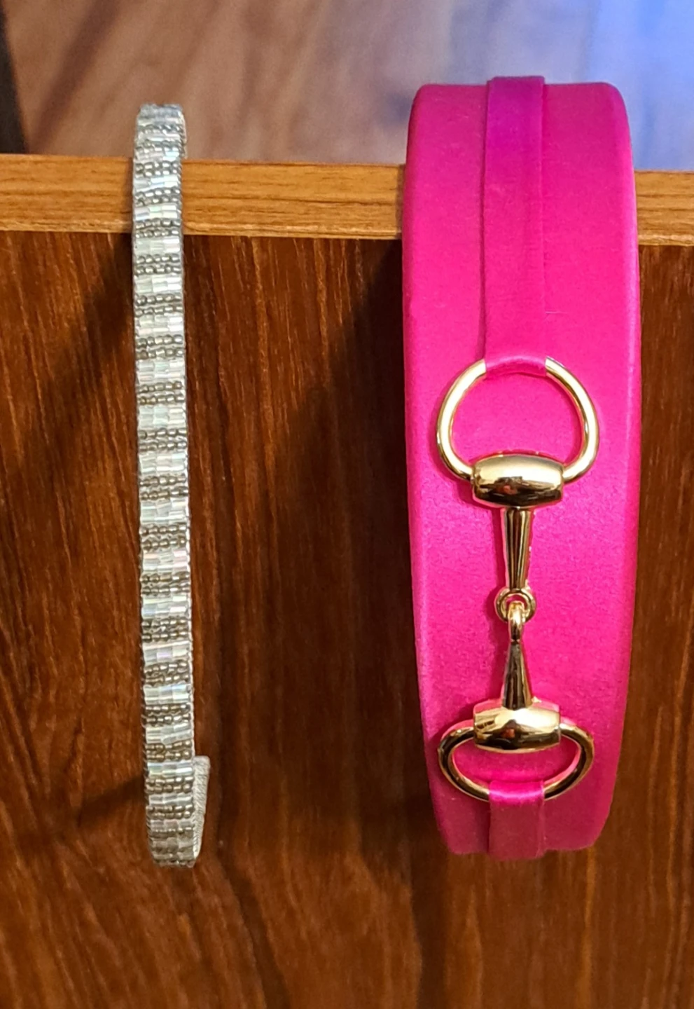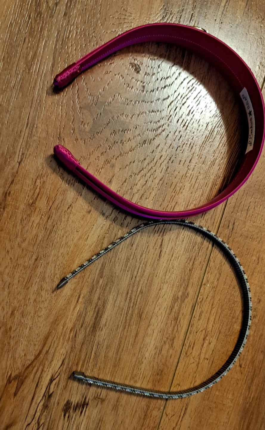 Two headbands for sale! One is a bright pink L. Erickson headband with a gold-coloured detail. The other is a silver-coloured beaded headband. Both are in great condition!