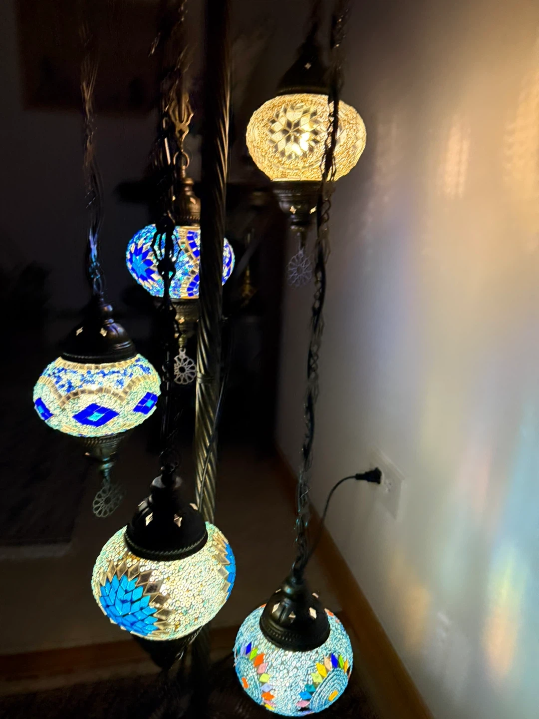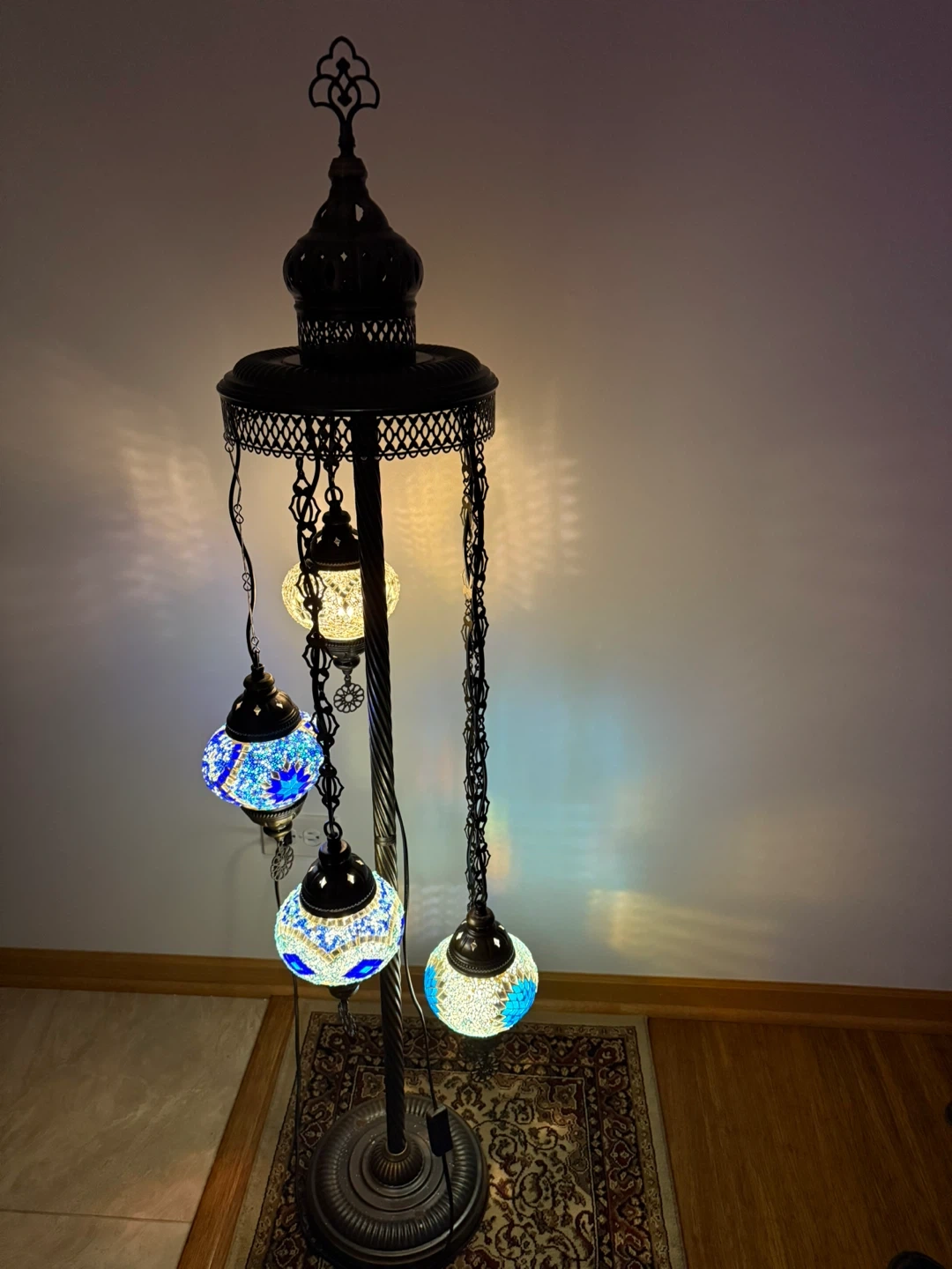 Beautiful mosaic Turkish floor lamp with multiple colorful glass globes. It will add a unique and warm touch to any room in your home. The intricate designs and vibrant colors are truly eye-catching!