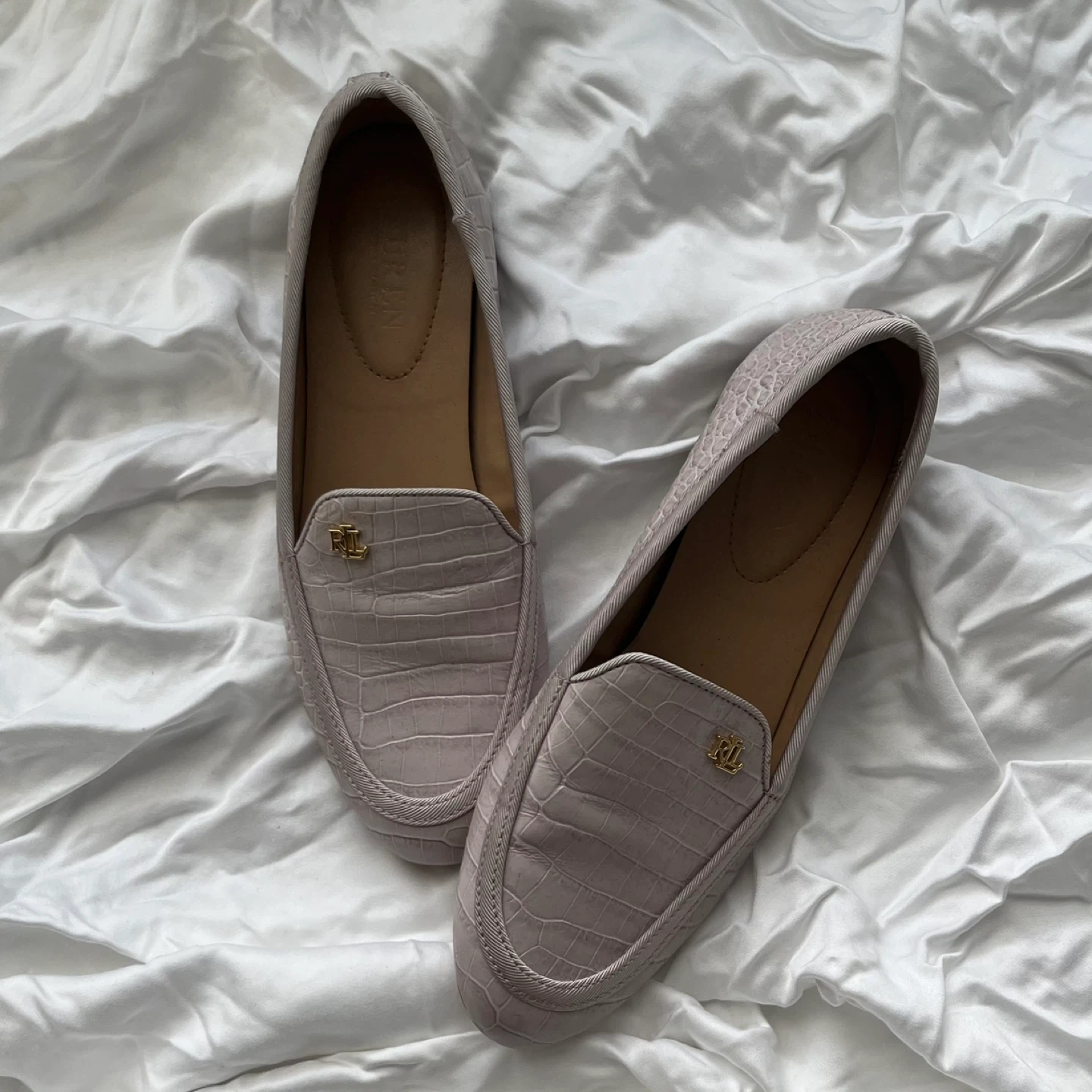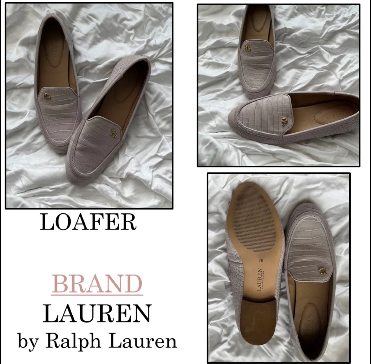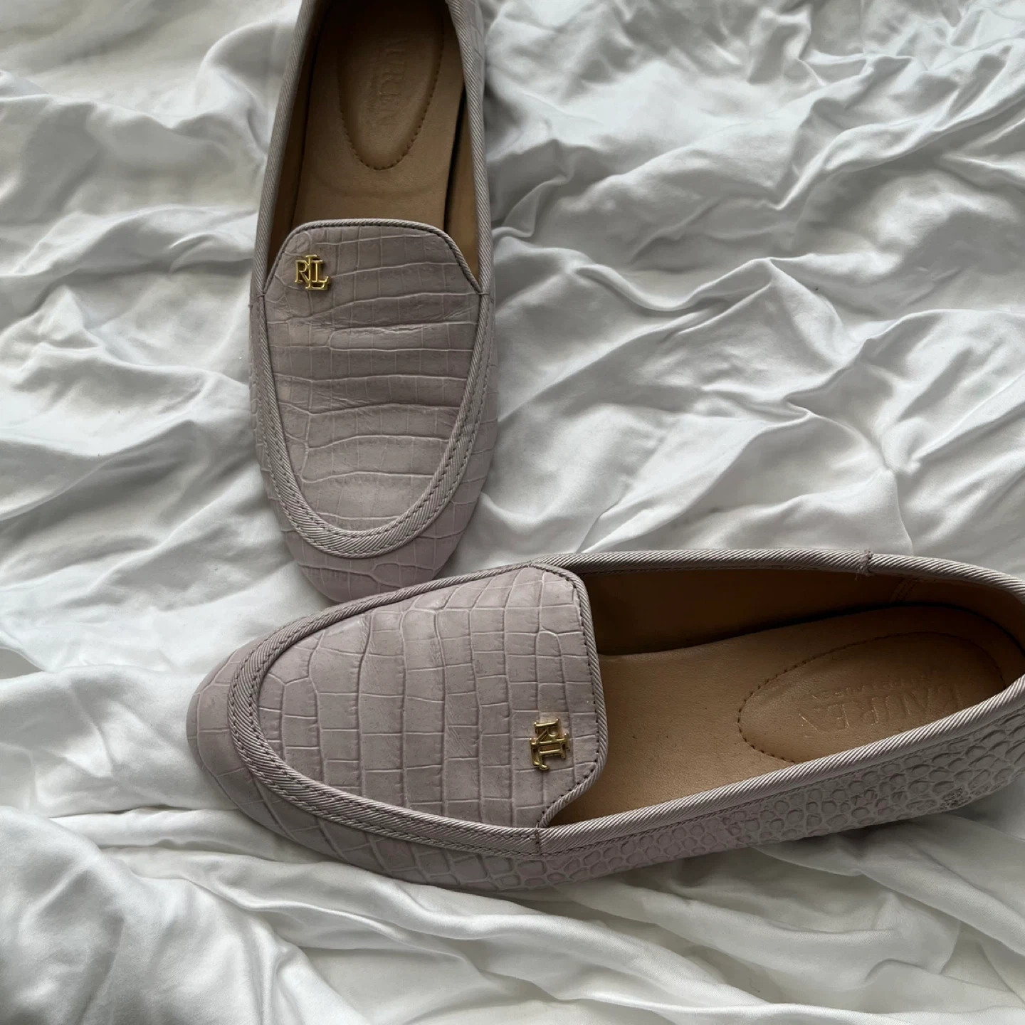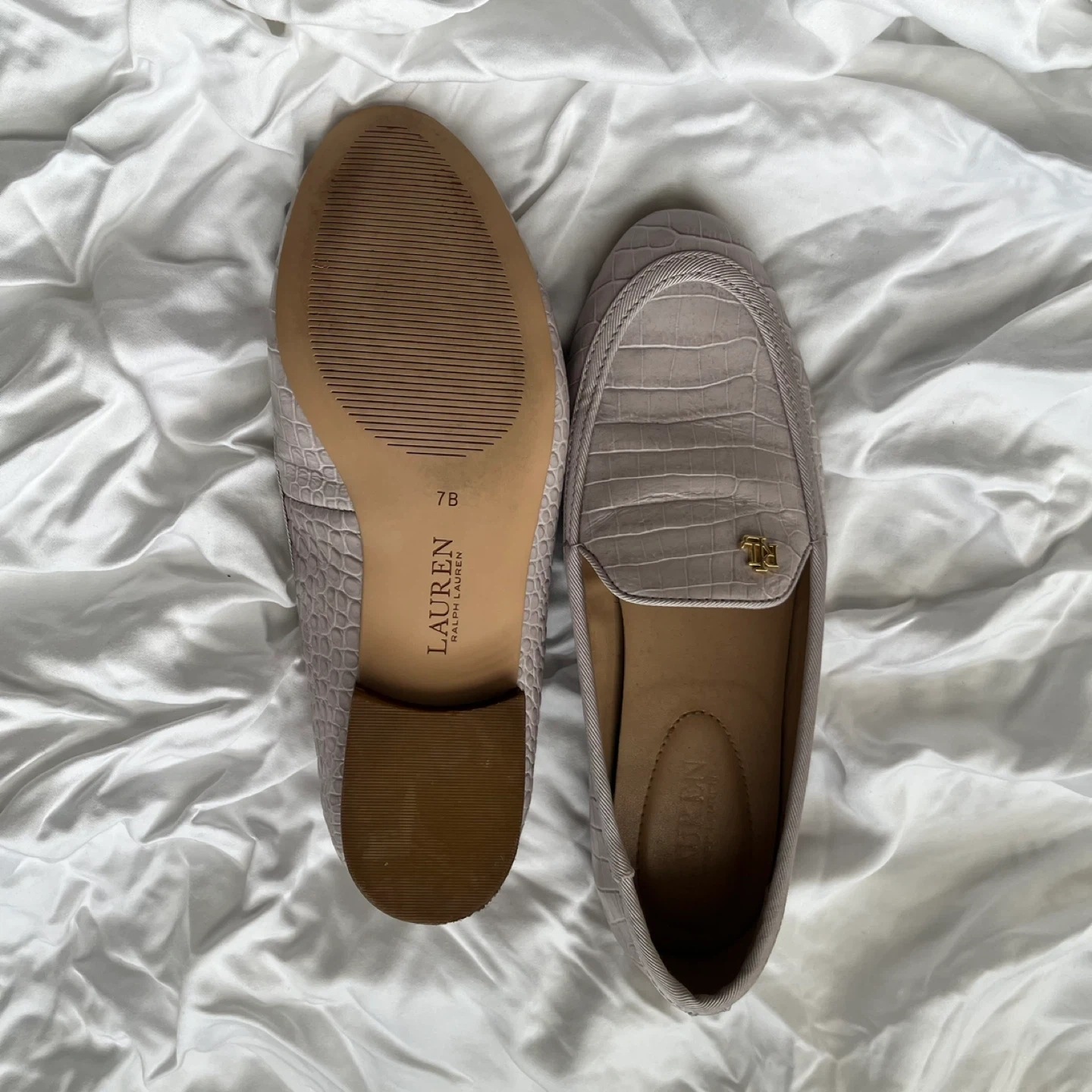 Selling a pair of Ralph Lauren loafers in size 7B. They feature a stylish croc-like texture and the classic RL logo. These are in great condition and ready for a new owner!