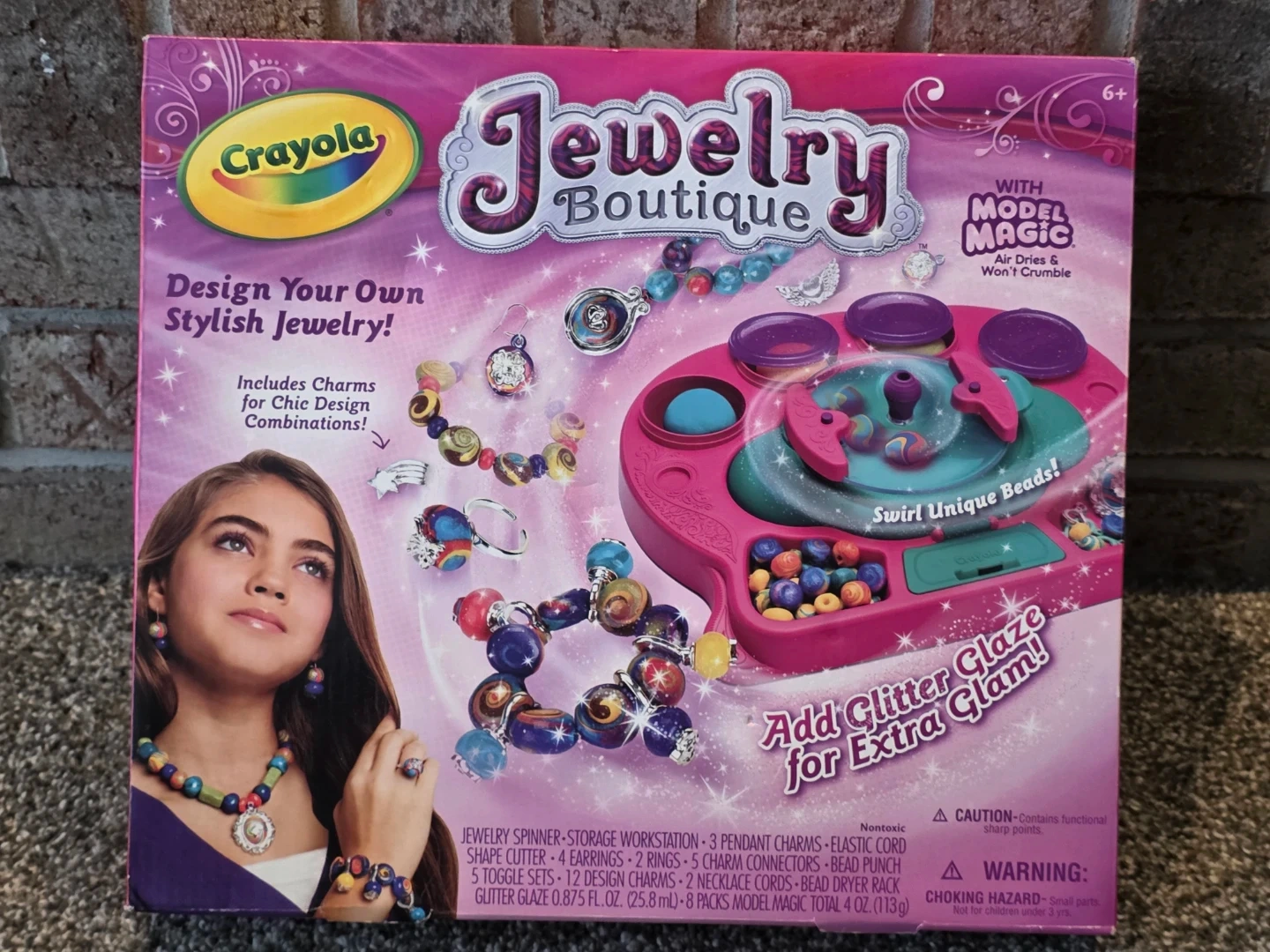 Get creative with this Crayola Jewelry Boutique! It's perfect for designing your own stylish jewelry with unique bead combinations. The kit includes a jewelry spinner, storage workstation, pendant charms, elastic cord, shape cutter, earrings, rings, charm connectors, bead punch, toggle sets, design charms, necklace cords, bead dryer rack, glitter glaze, and model magic. Let your creativity shine!