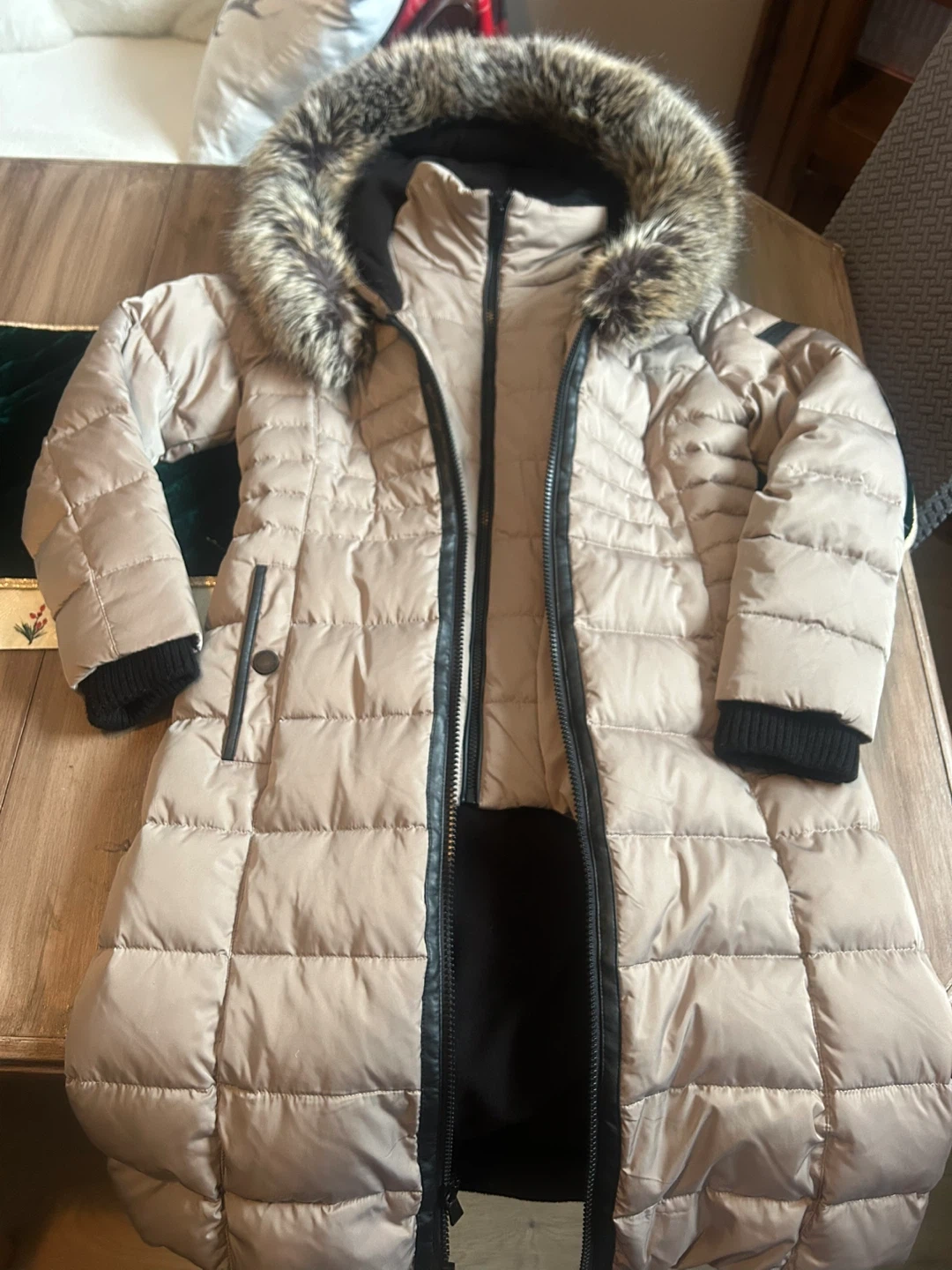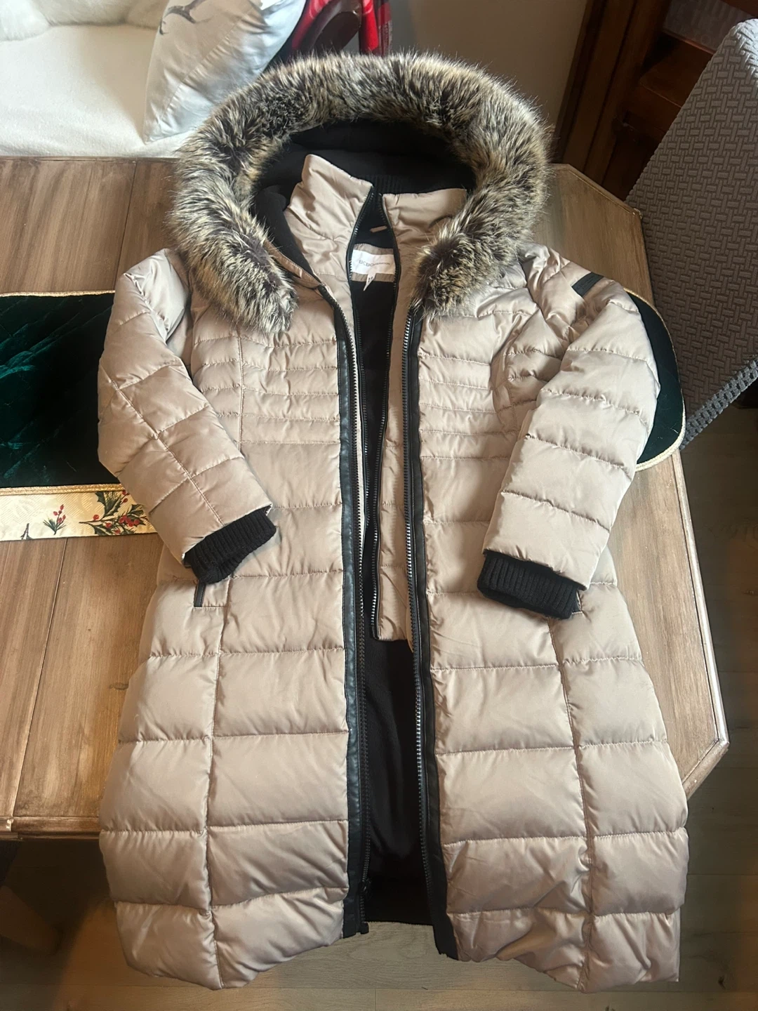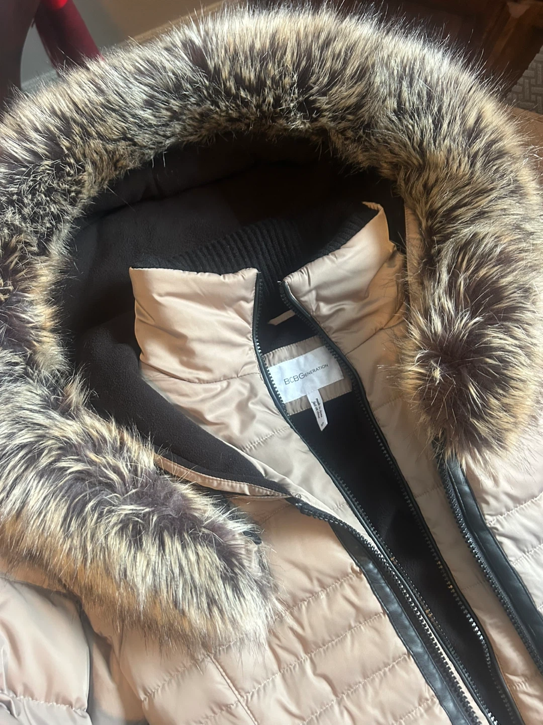 Stylish BCBG down filled puffer coat in a neutral colour, perfect for staying warm this winter! This jacket has a double zipper, and it is lined in fleece. It features a cozy faux fur hood and is in excellent condition. Size medium. Retails for over $200.