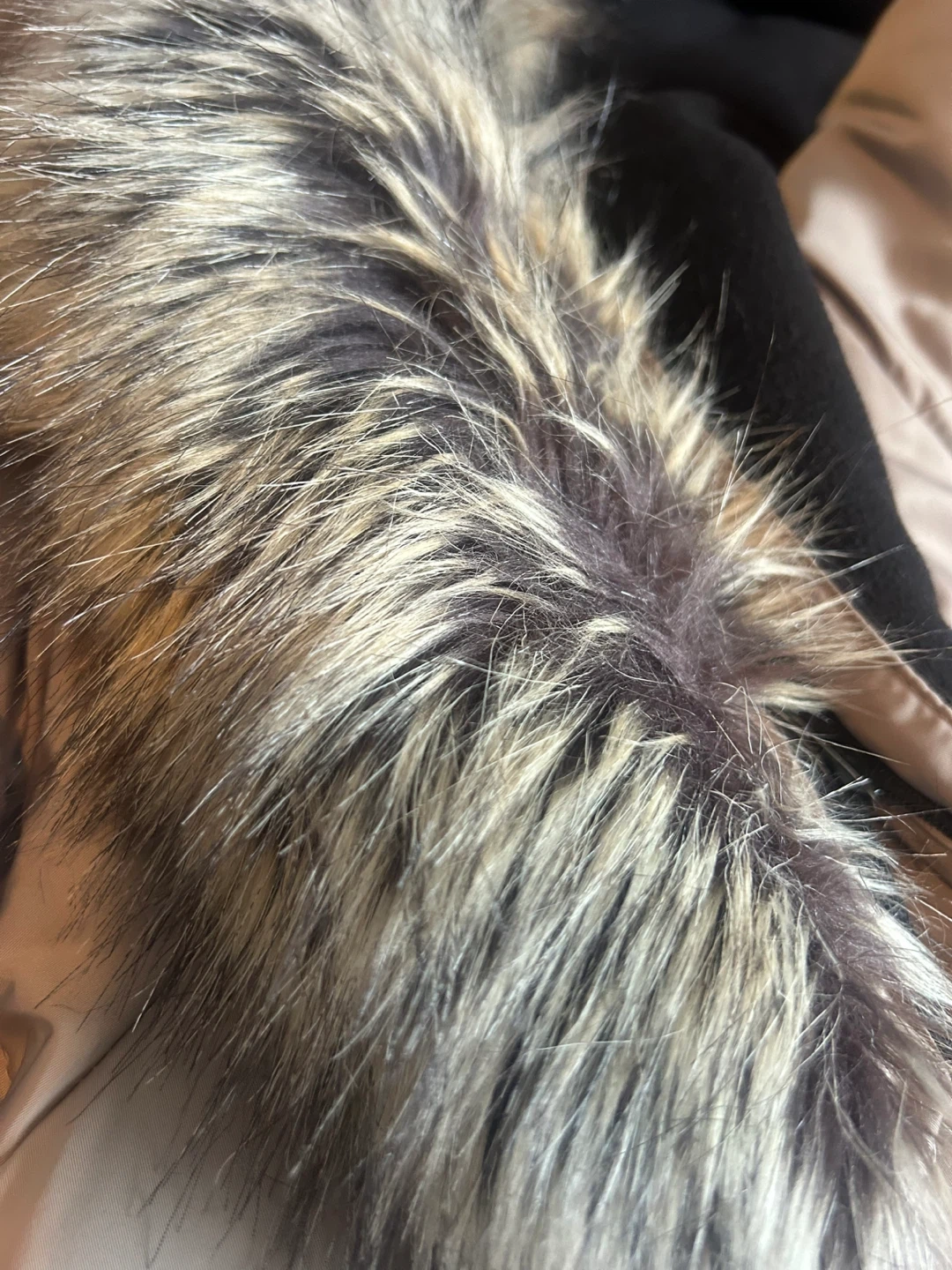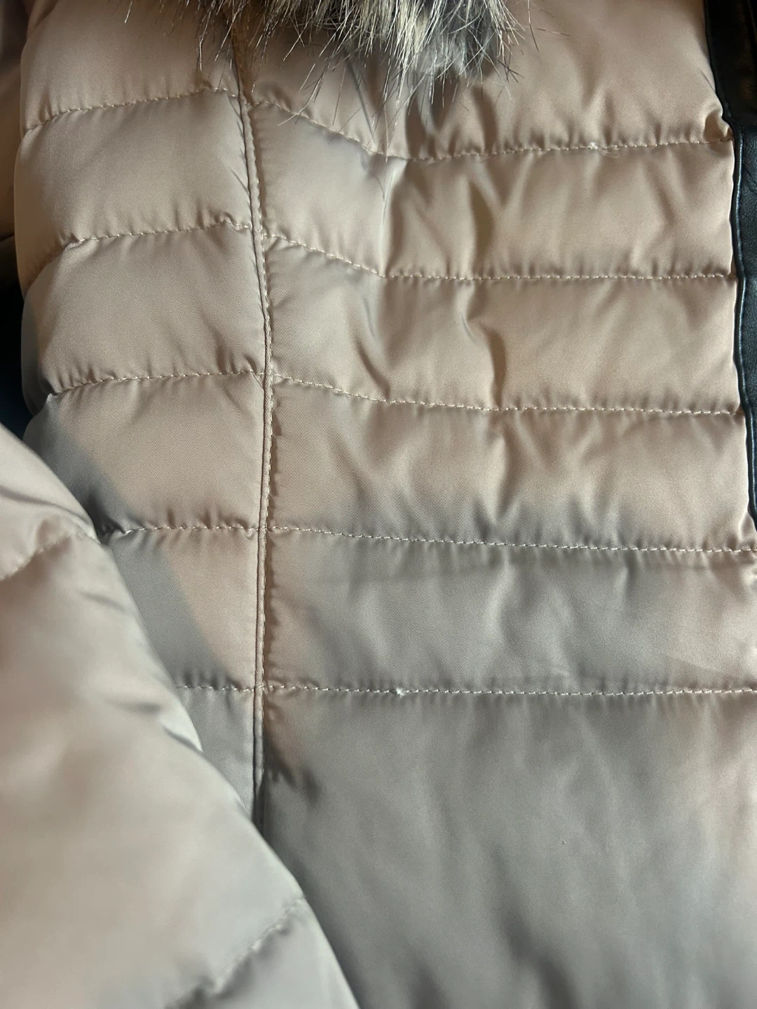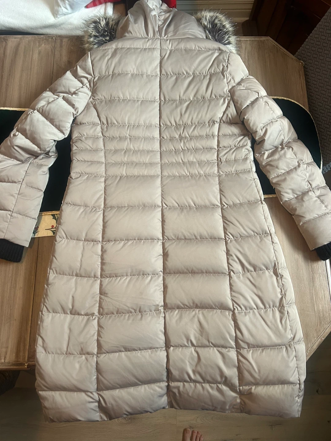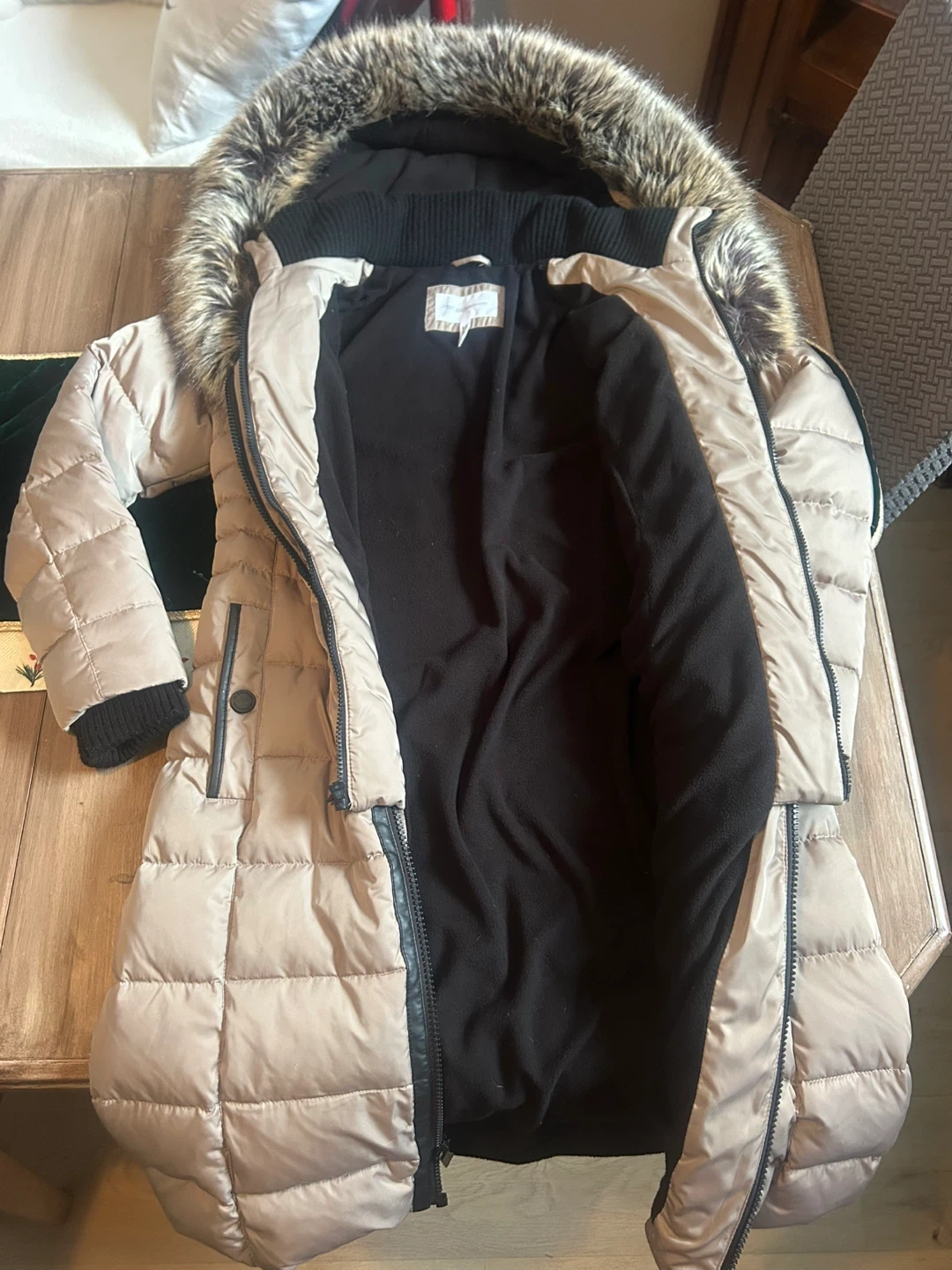 Stylish BCBG down filled puffer coat in a neutral colour, perfect for staying warm this winter! This jacket has a double zipper, and it is lined in fleece. It features a cozy faux fur hood and is in excellent condition. Size medium. Retails for over $200.