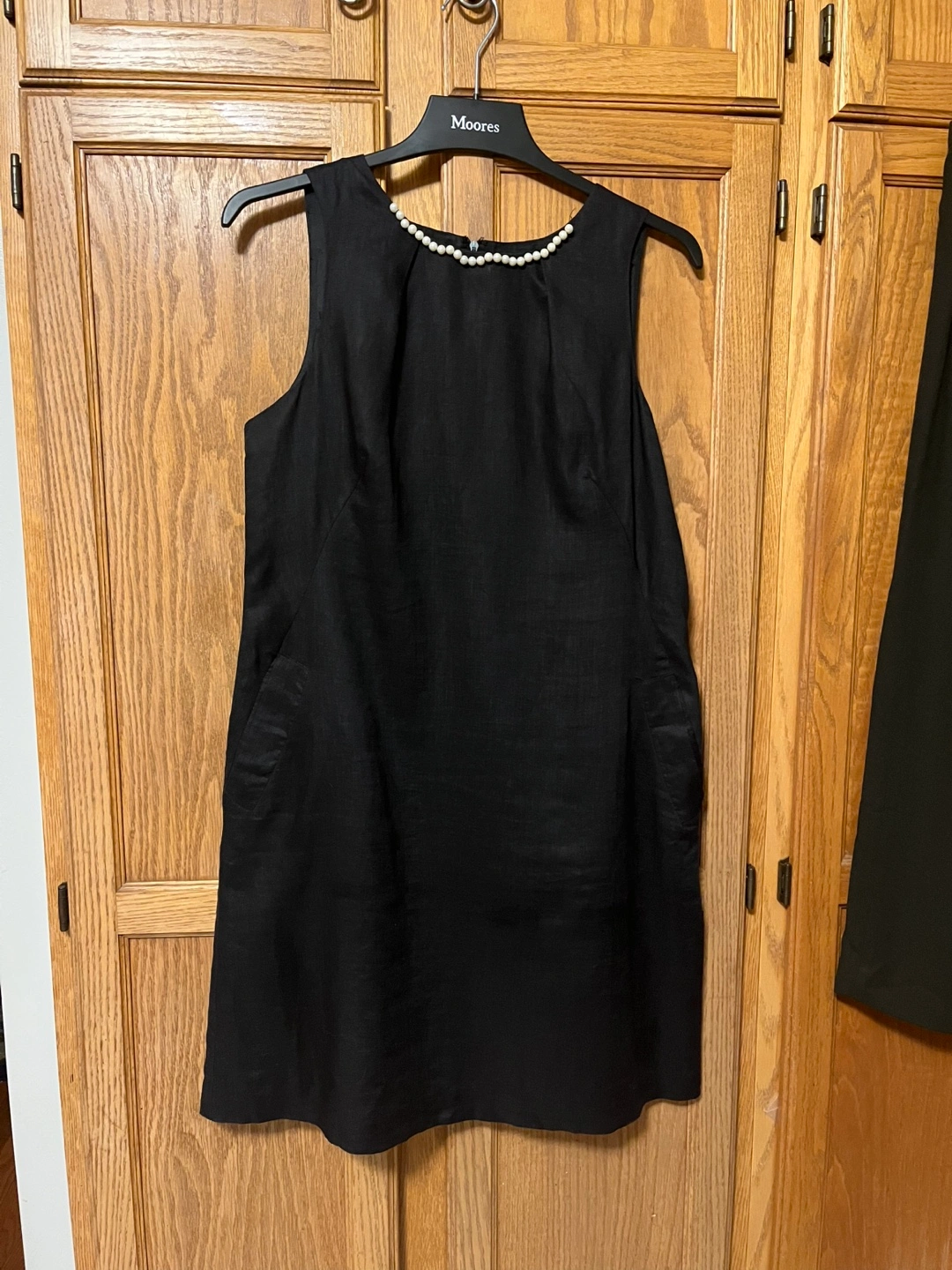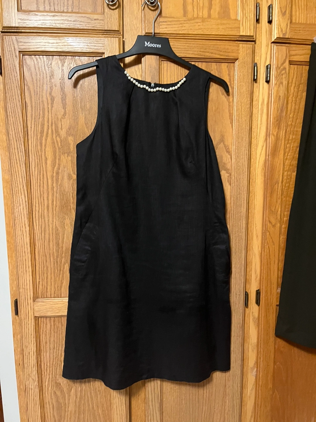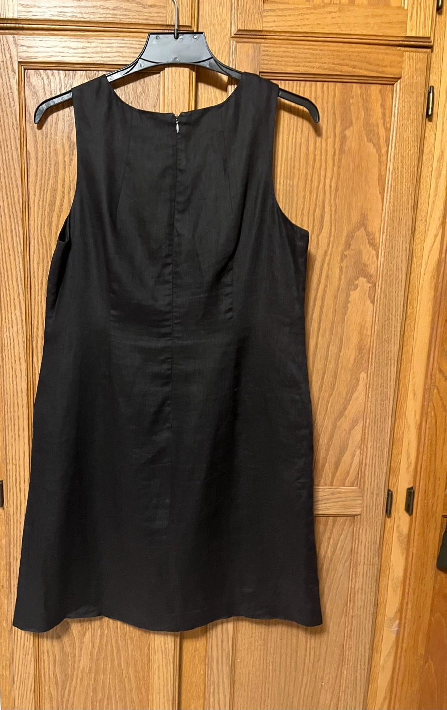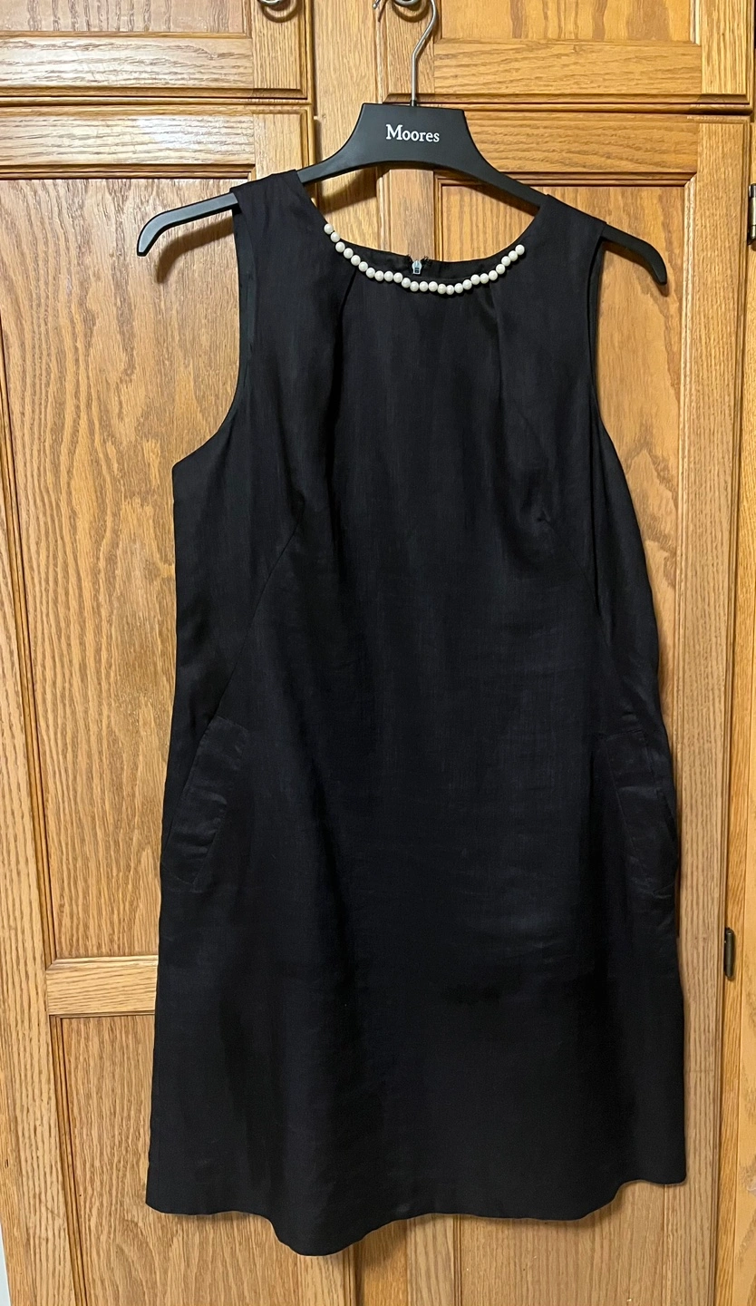 Lucy & Laurel black linen with two pockets, it is in size 10-12. The dress is made of 100% linen for the shell and exterior, and 100% acetate for the lining. It's a stylish and comfortable piece for any occasion!
