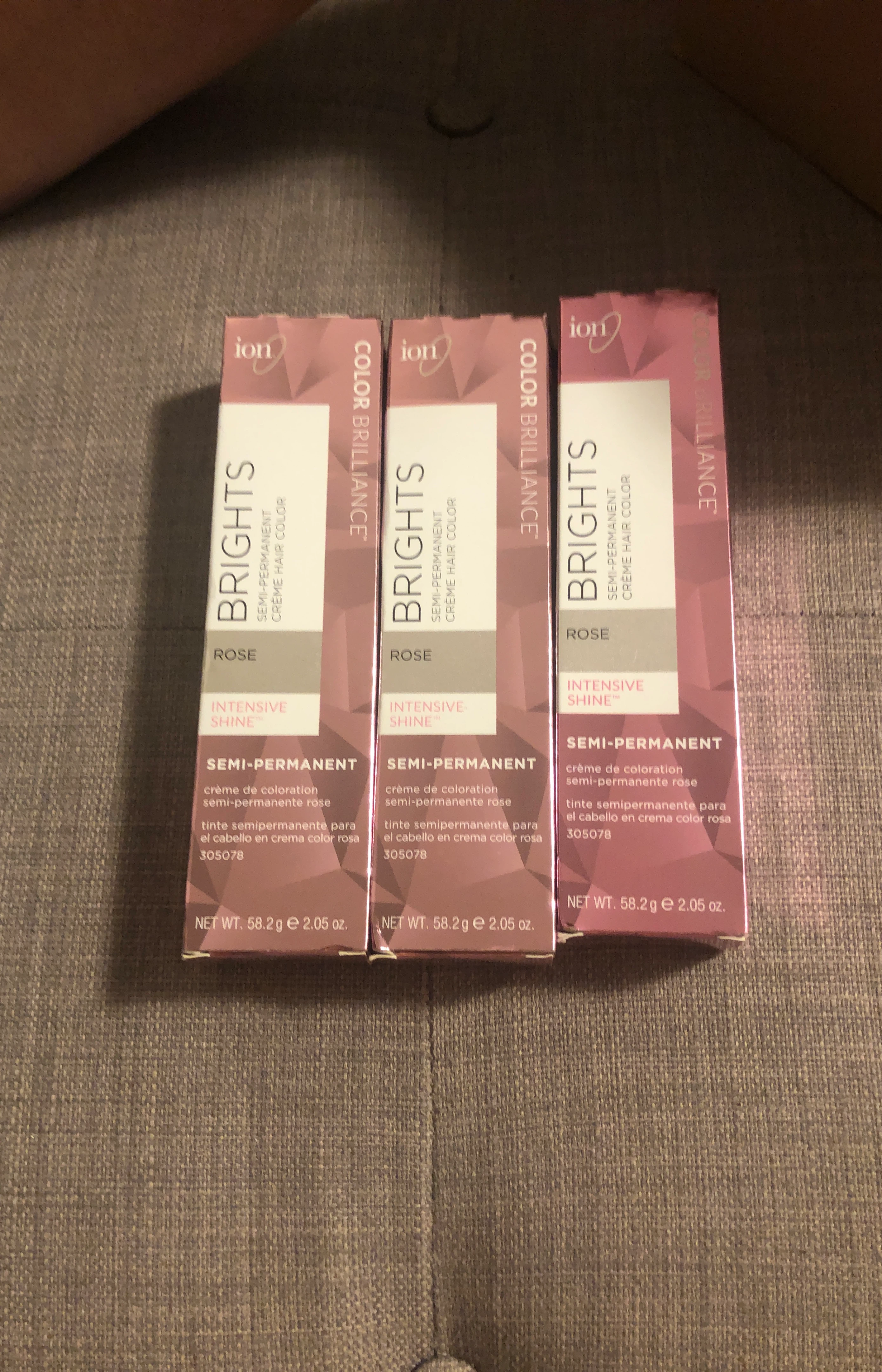 Selling three boxes of Ion Brights semi-permanent creme hair color in the shade Rose. Each box contains 58.2 g / 2.05 oz of product. Perfect for adding a pop of colour to your hair! $50 for 3 boxes