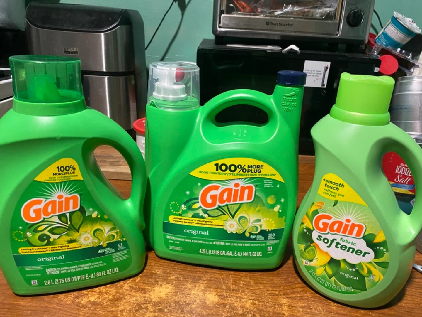 I have Gain laundry detergent and fabric softener available. Liquid detergent -88 FL OZ LIQ and a Large Liquid detergent of 144 FL. OZ LIQ. And fabric softener of 72 FL OZ LIQ.