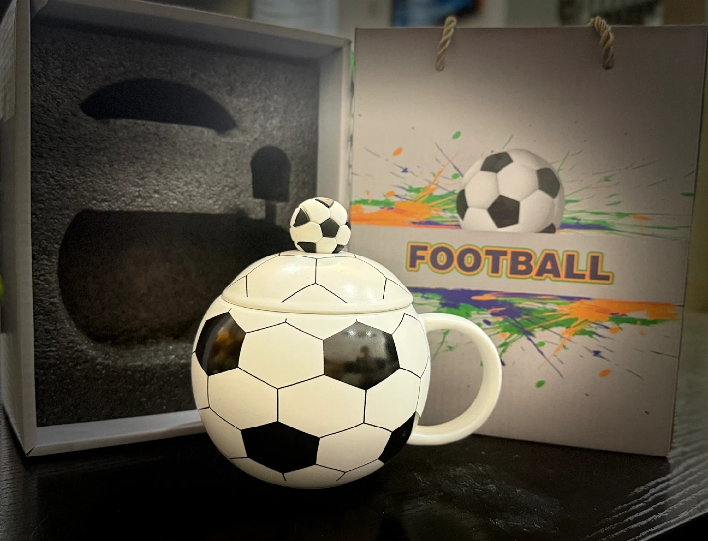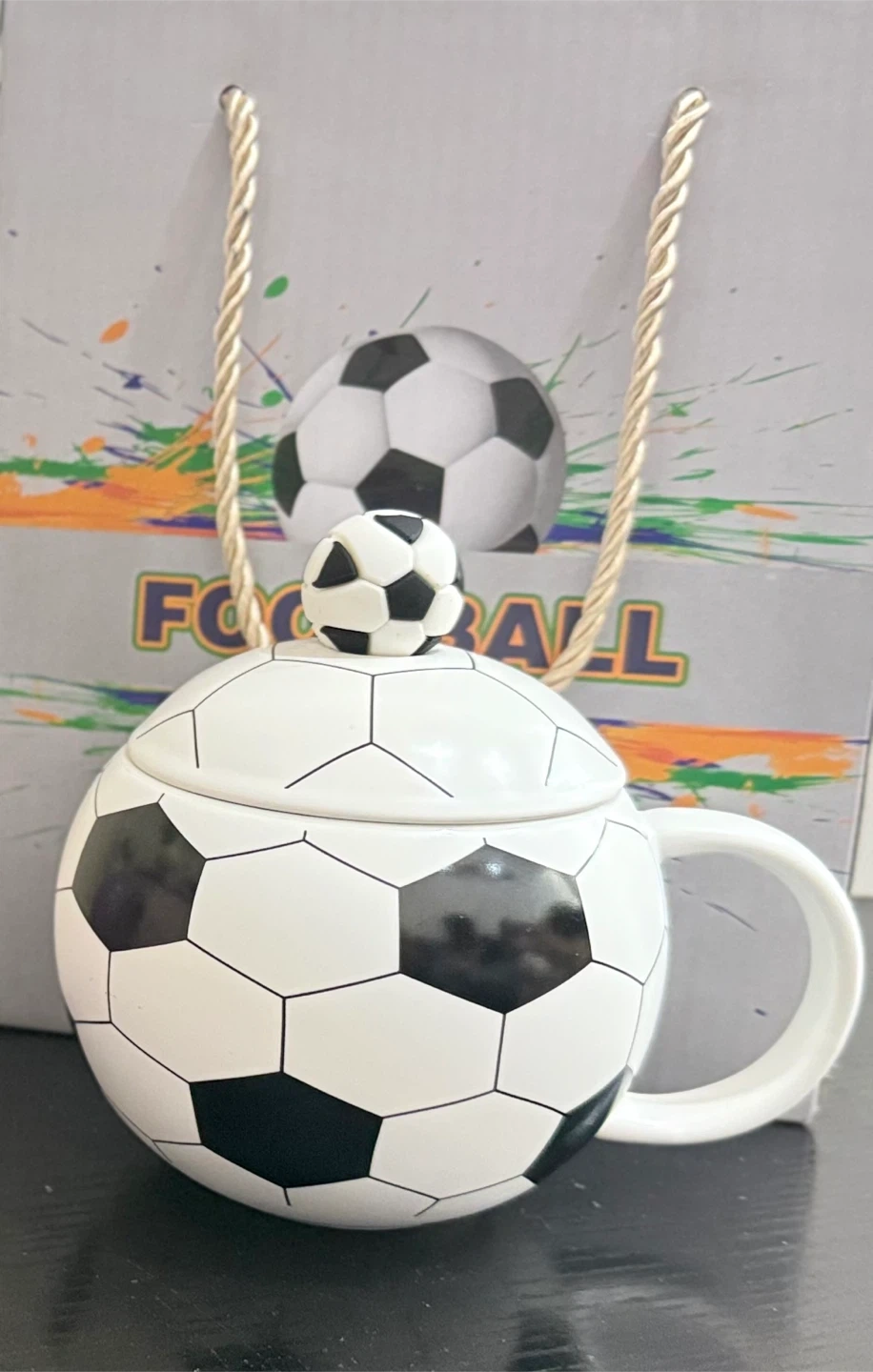 I have a super cute mug set for sale! One mug features a sweet rabbit design and the other is shaped like a soccer ball. Both are brand new and come in their original boxes. They each include a matching lid and spoon, so they're ready to use or give as a gift!