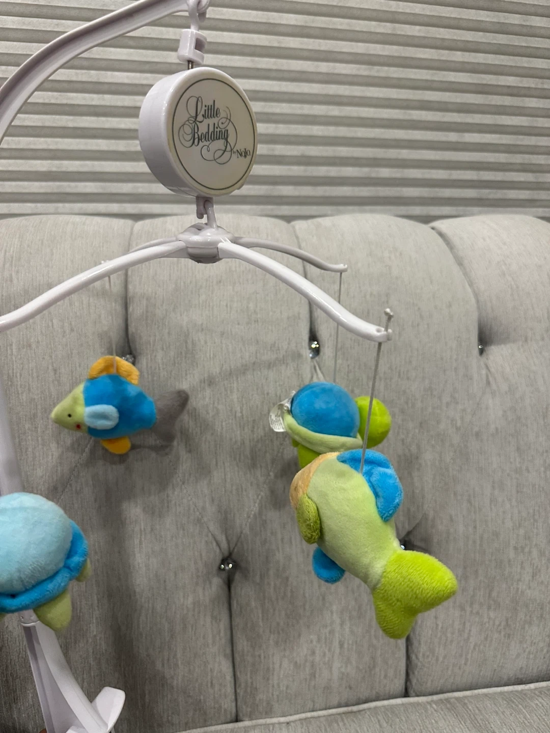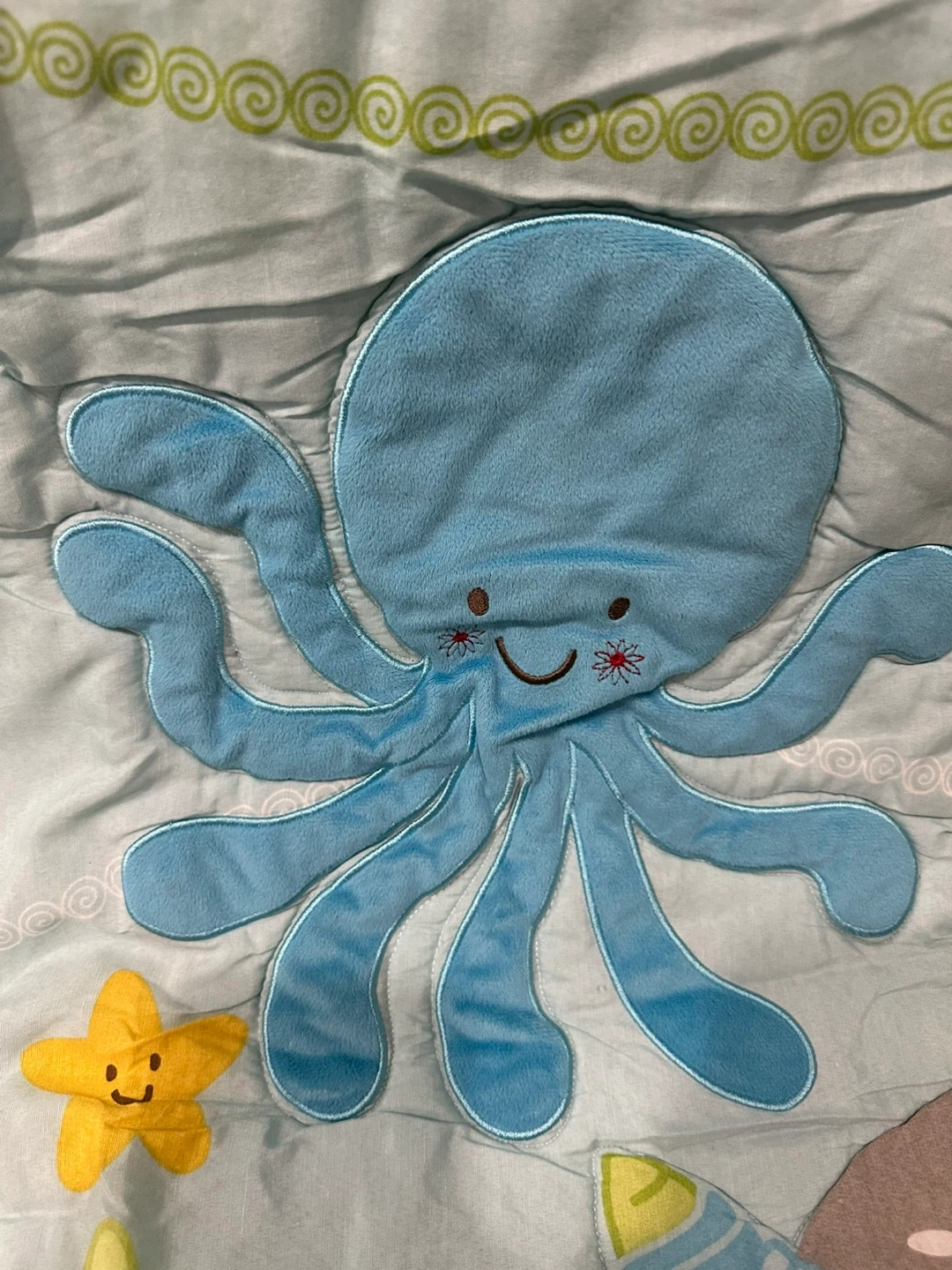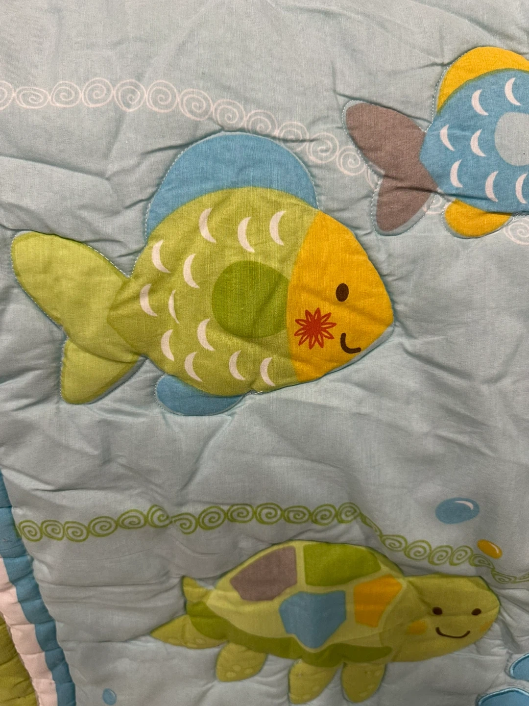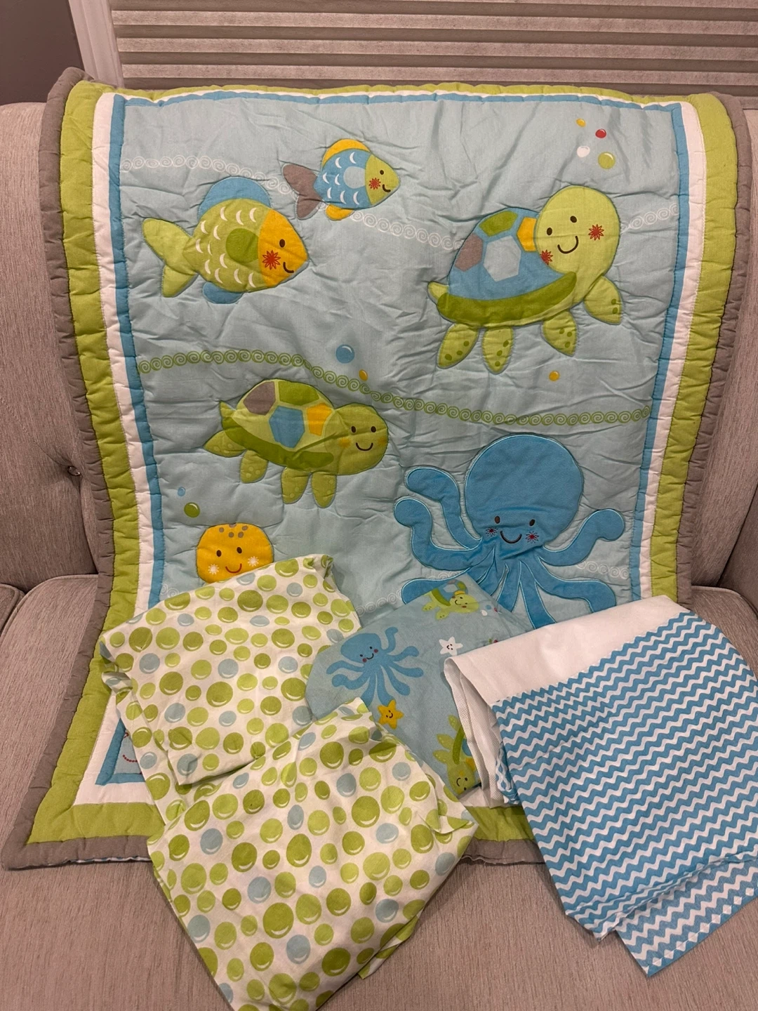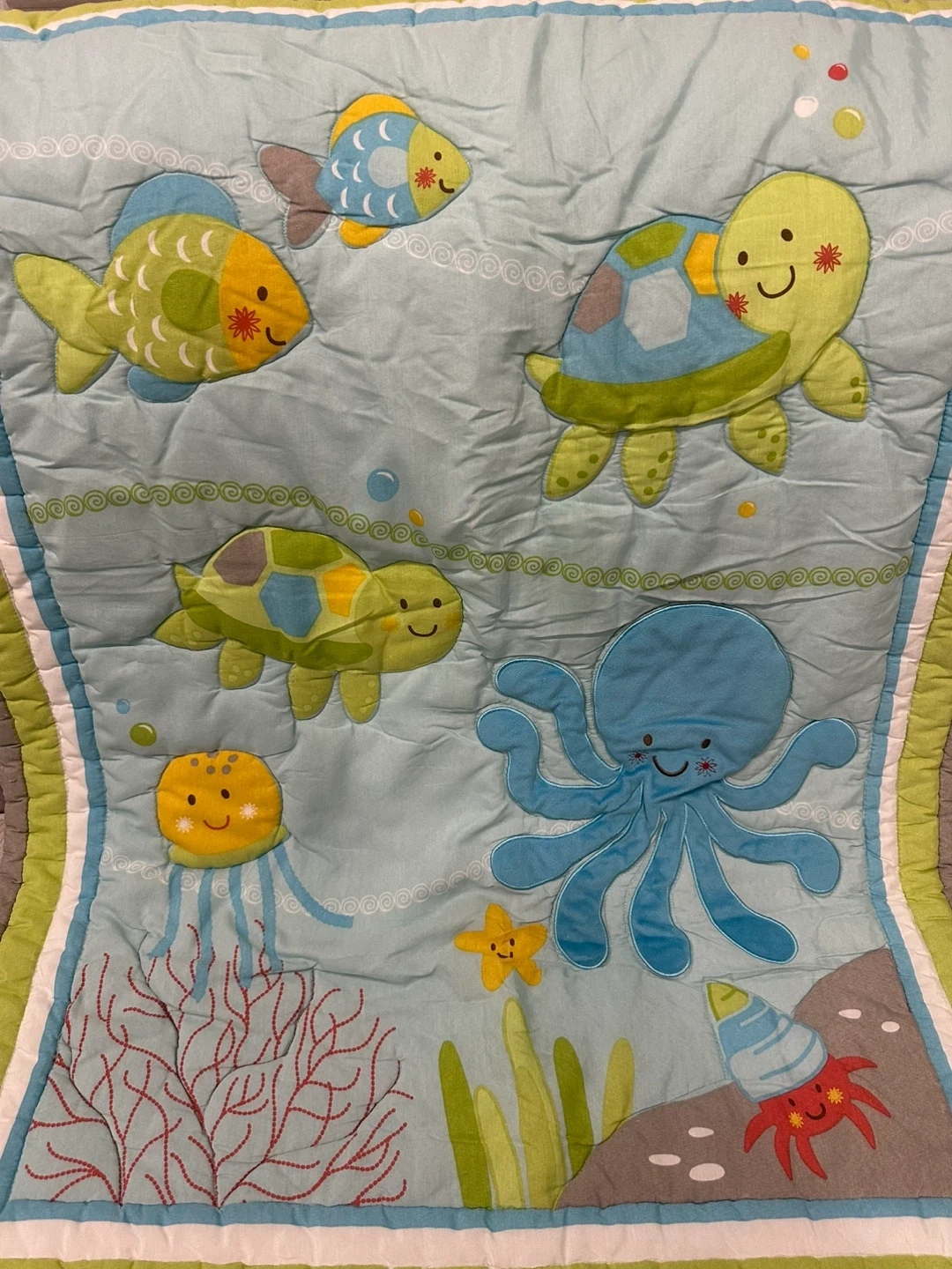 This is an underwater themed crib bedding set in great condition. It includes a quilt, 3 fitted sheets, a crib skirt and a musical mobile. The quilt features adorable sea creatures like fish, turtles, and an octopus!