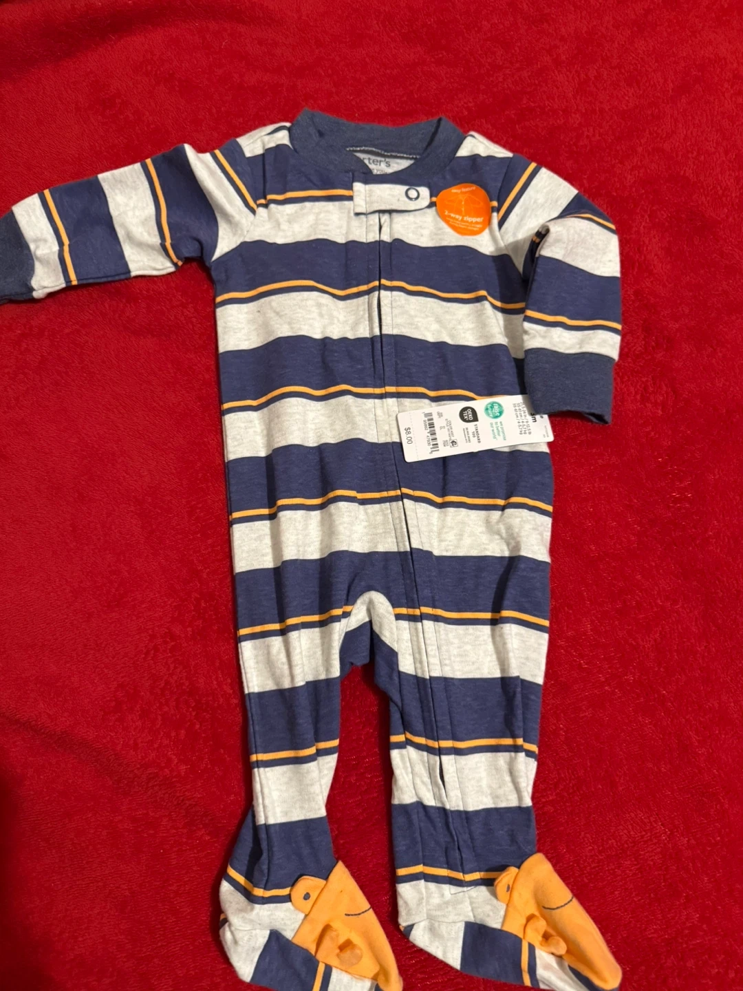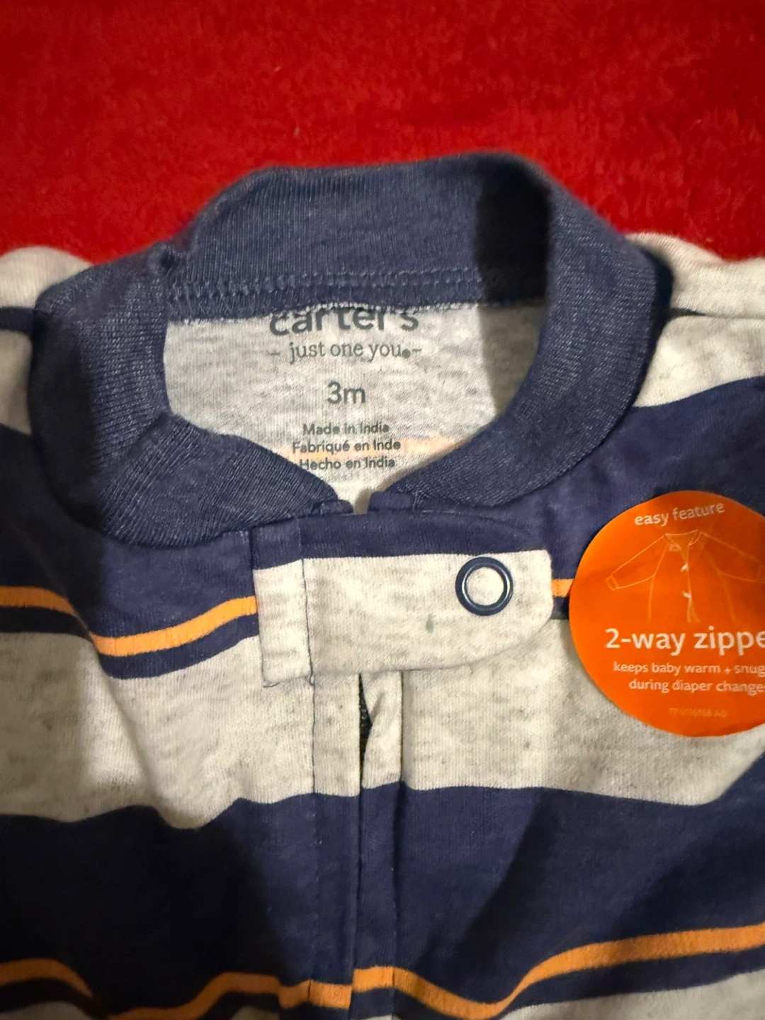 Here's a cute Carter's Just One You striped baby onesie in size 3M! It has a 2-way zipper for easy diaper changes. Perfect for keeping your little one warm and snuggly