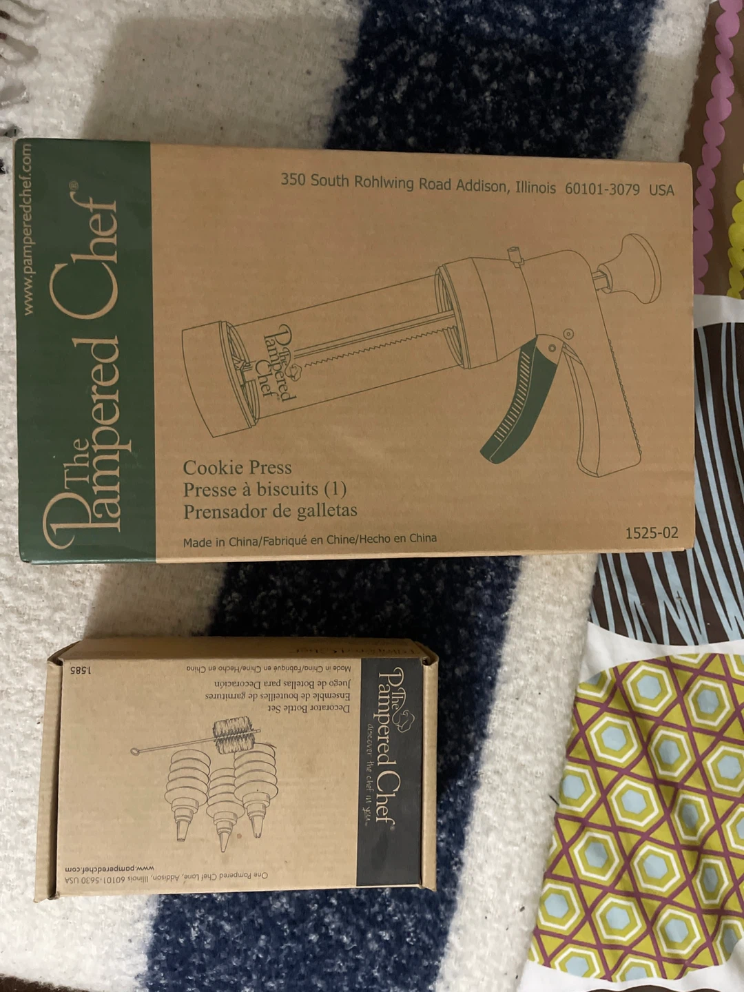 Selling a Pampered Chef cookie press and decorator bottle set. Both are in their original boxes and ready for your baking needs!