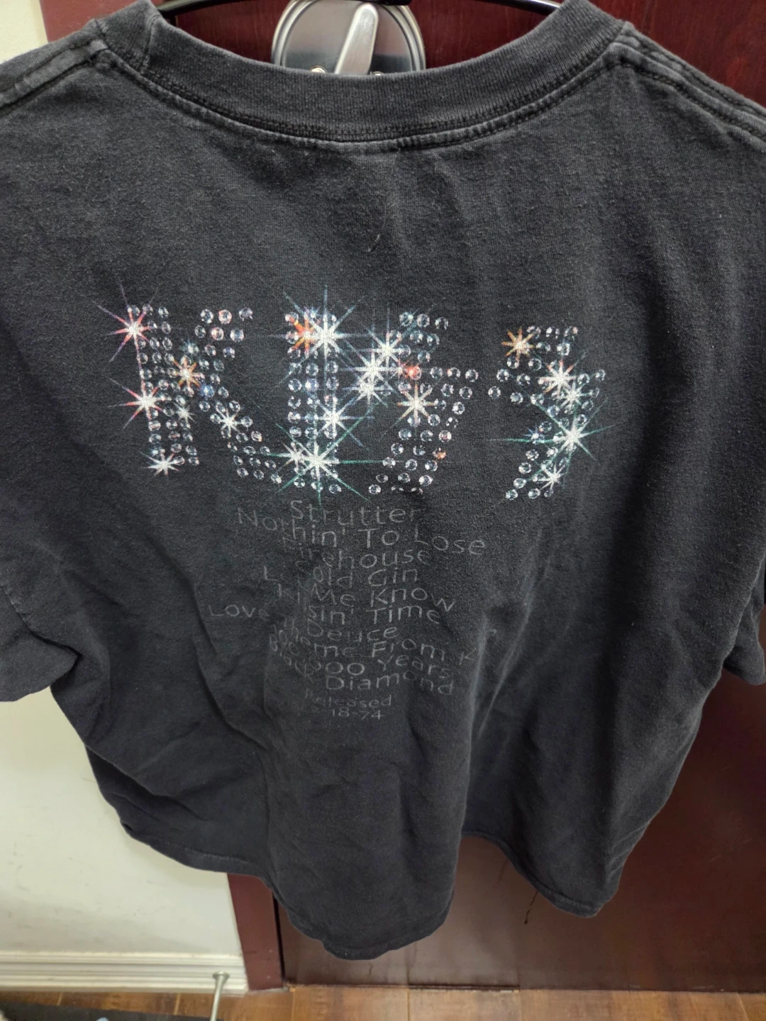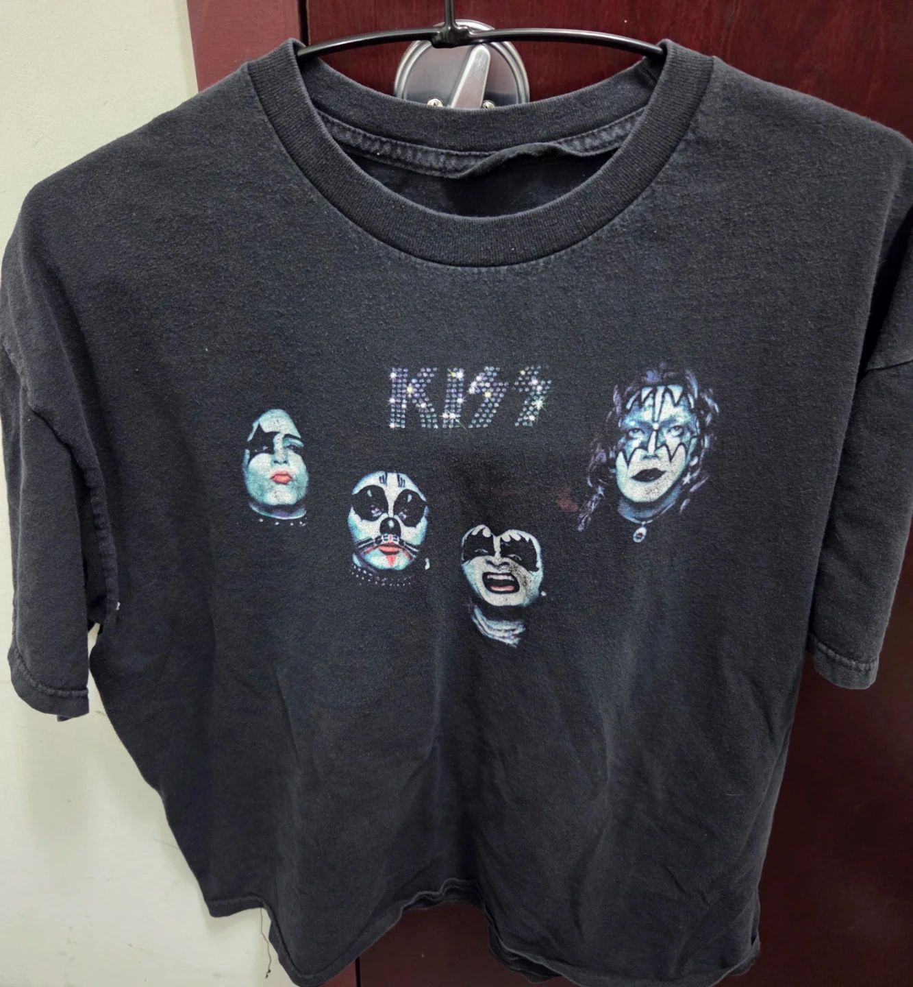 Selling a KISS band t-shirt! It's black and features the band members on the front. The back has the KISS logo in rhinestones and some song titles. It's in good condition!