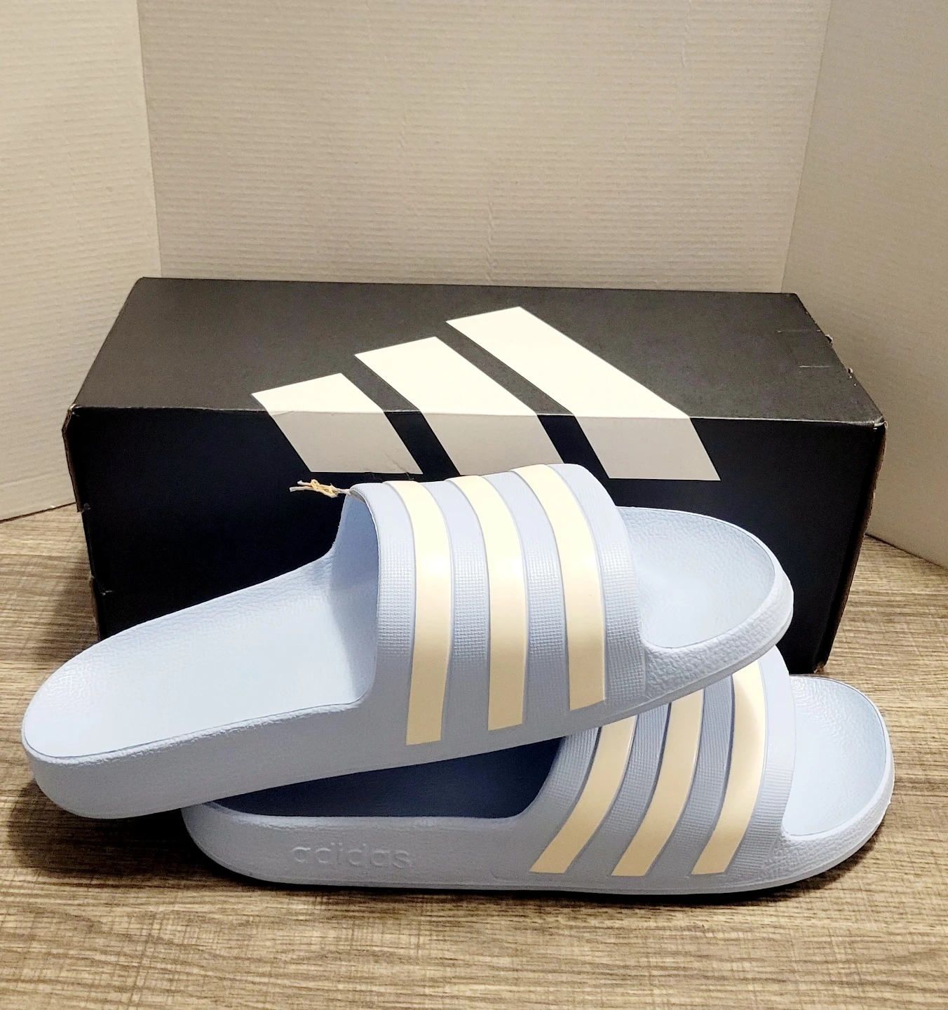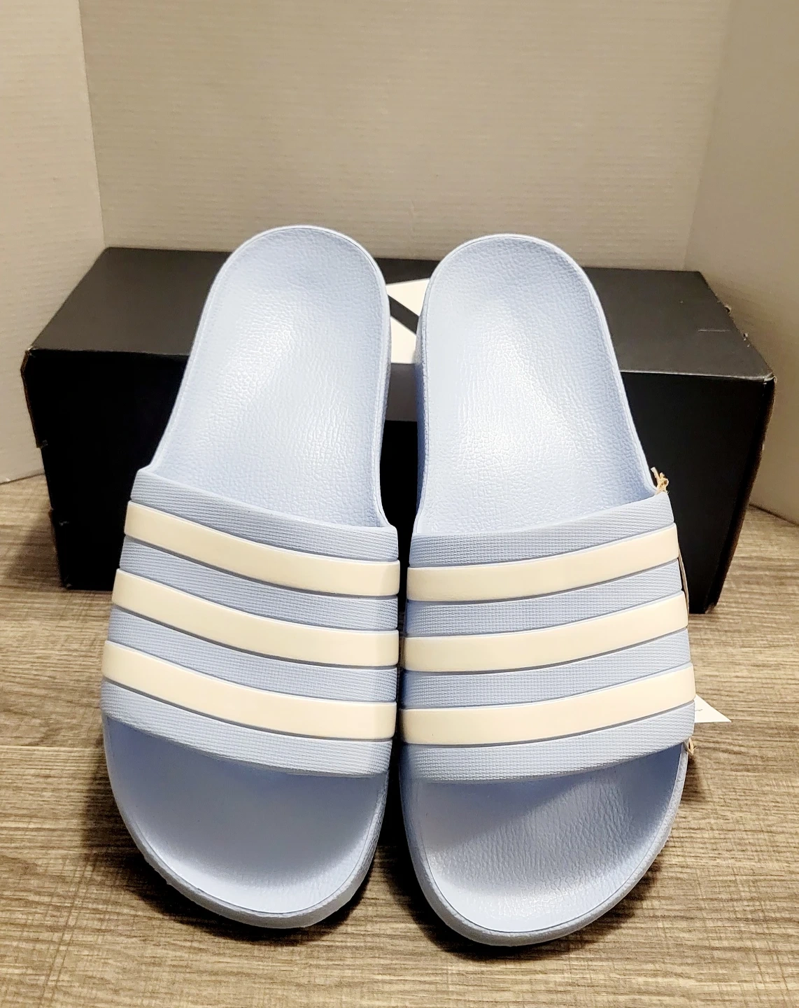 Get ready for summer with these Adidas Adilette Aqua slides! They are a light blue color with white stripes and come in size 11. The slides are in great condition and include the original box!