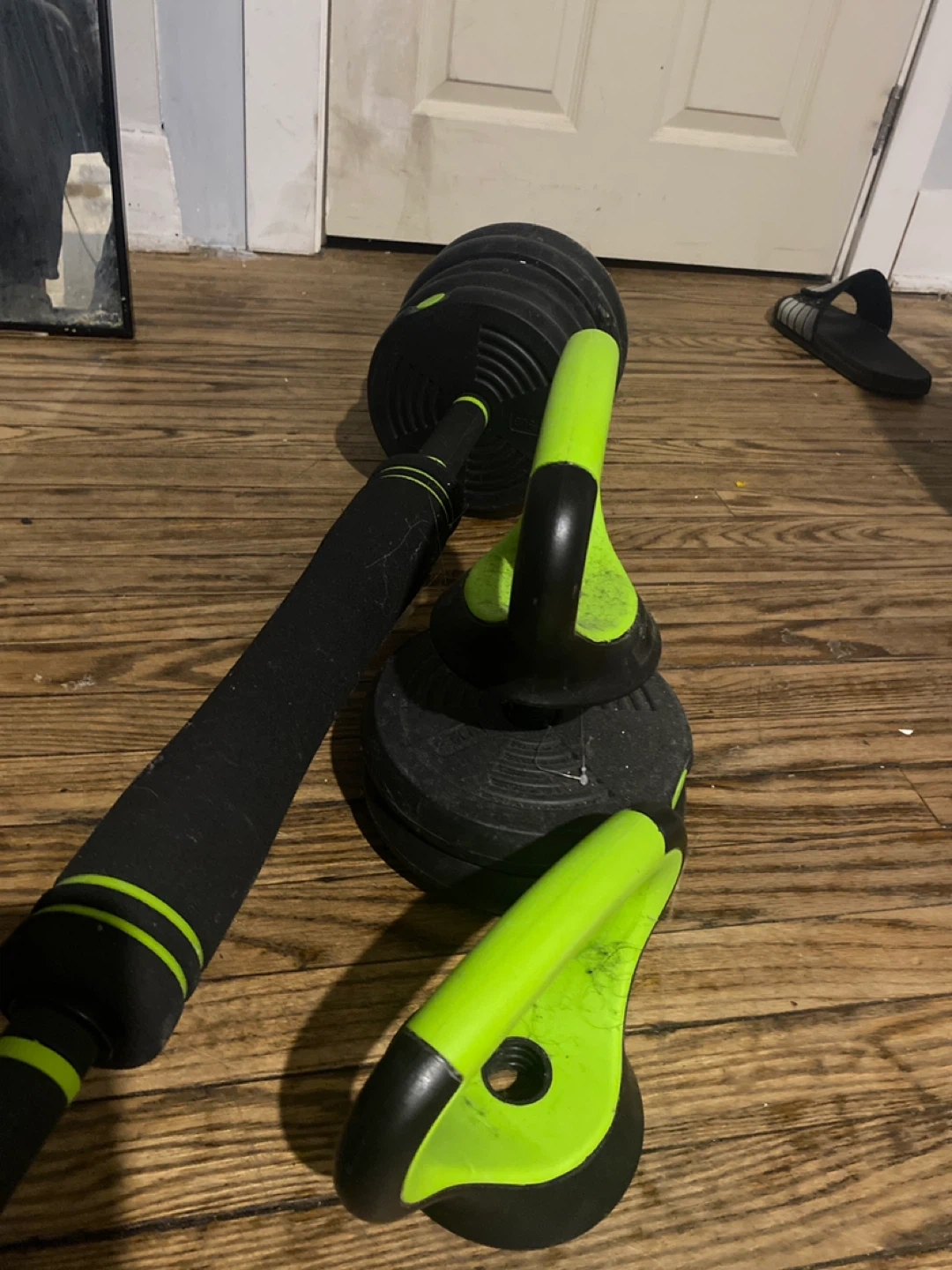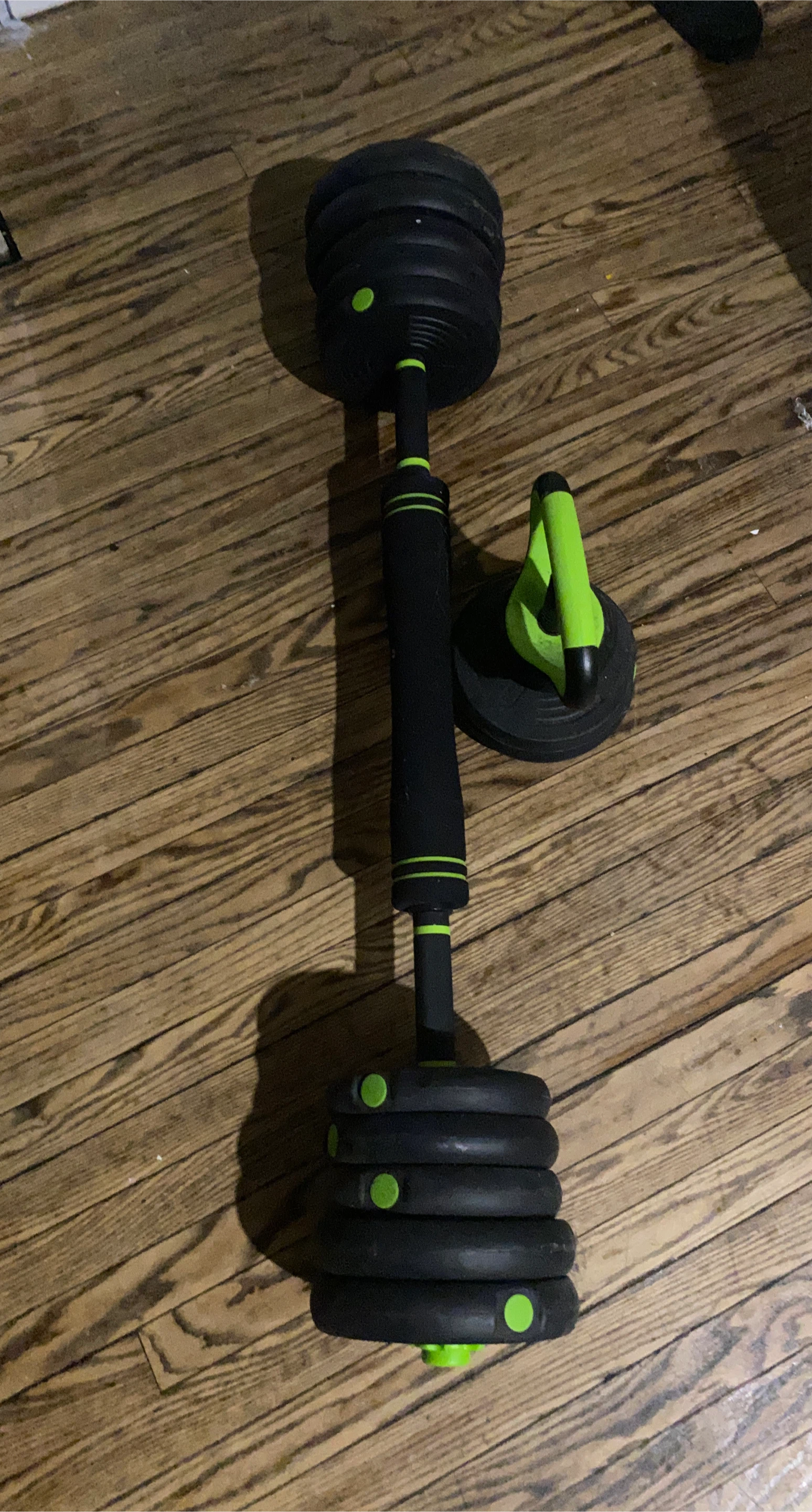Selling an adjustable dumbbell set with a mix of black and green accents. It includes the dumbbell bar, weight plates, and what looks like attachments for push-ups or other exercises. Great for home workouts!