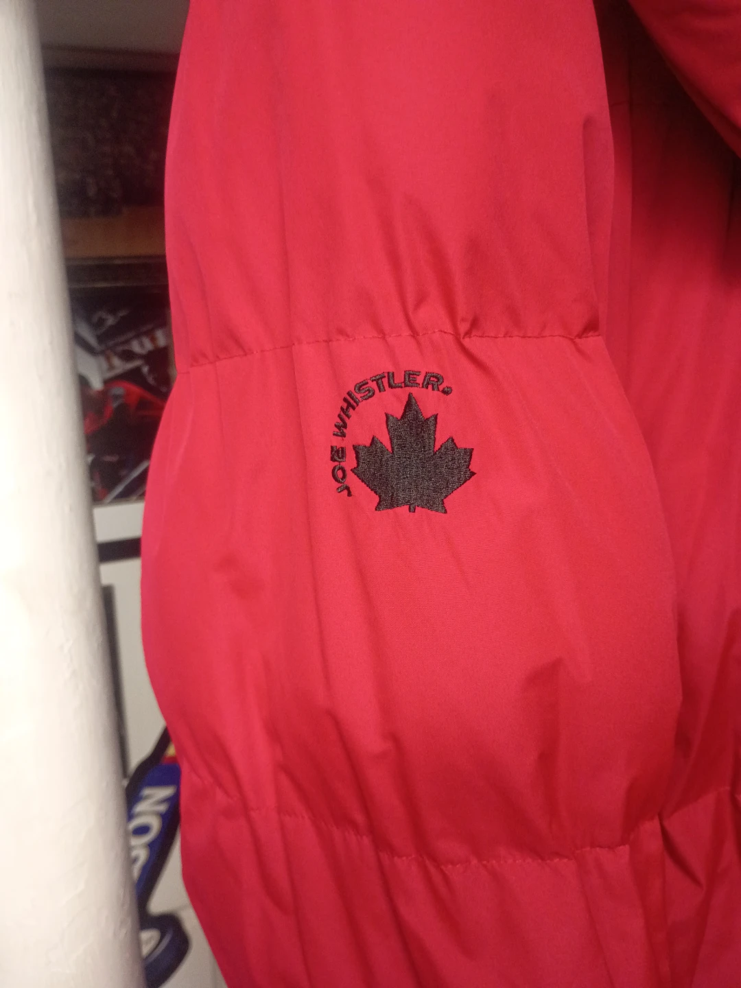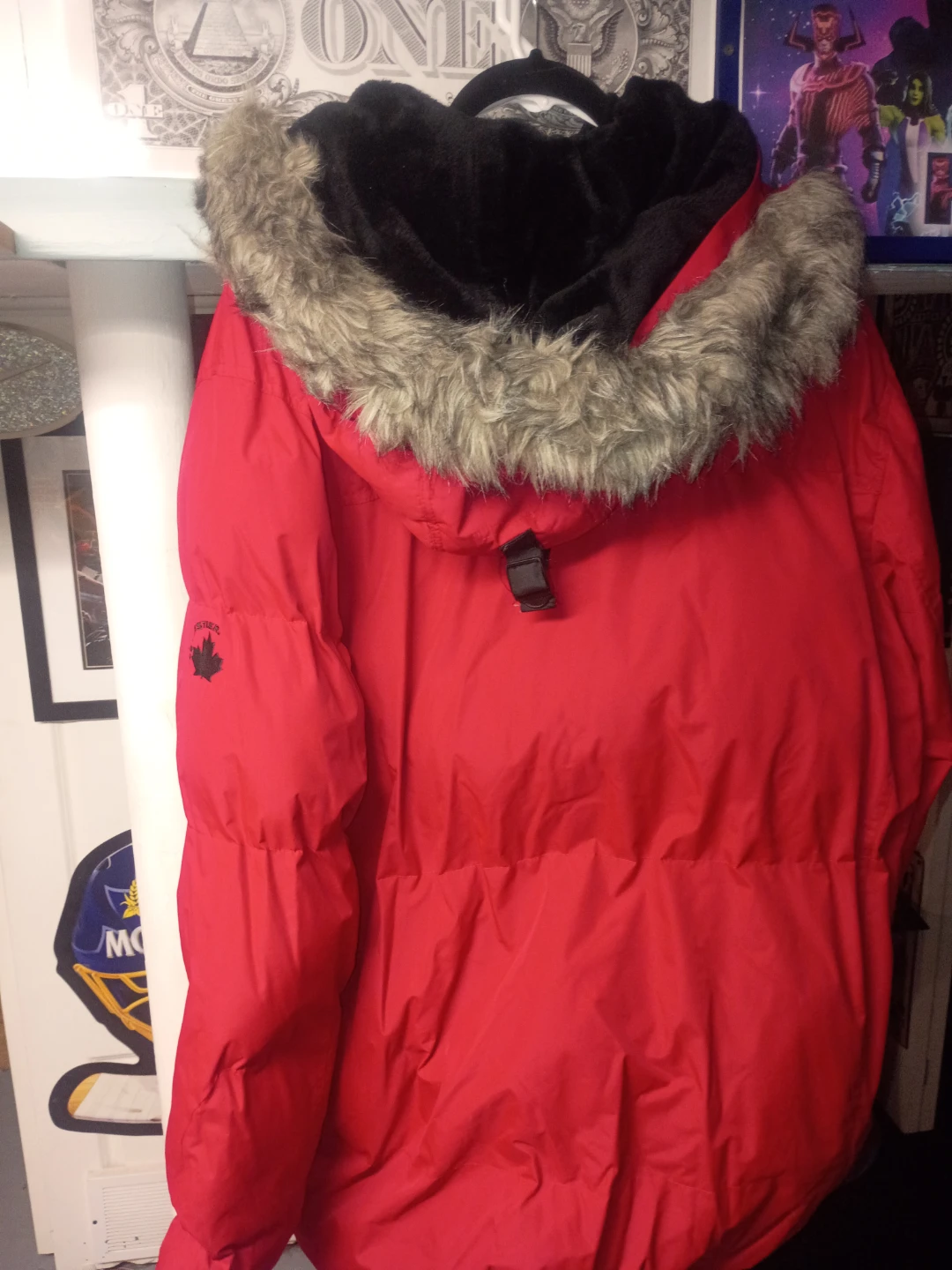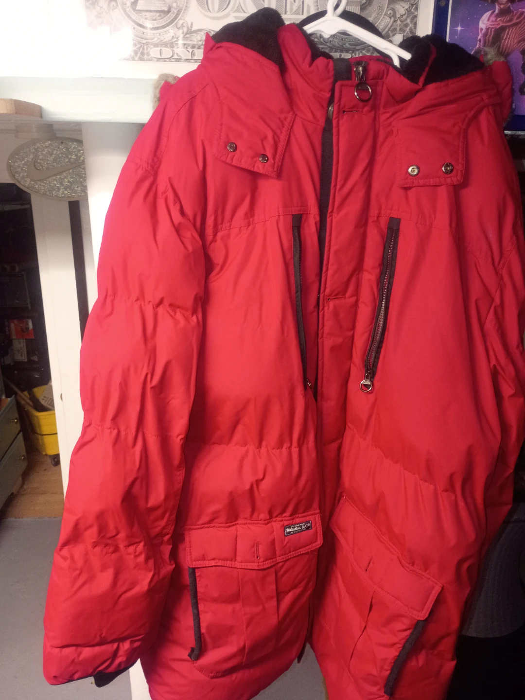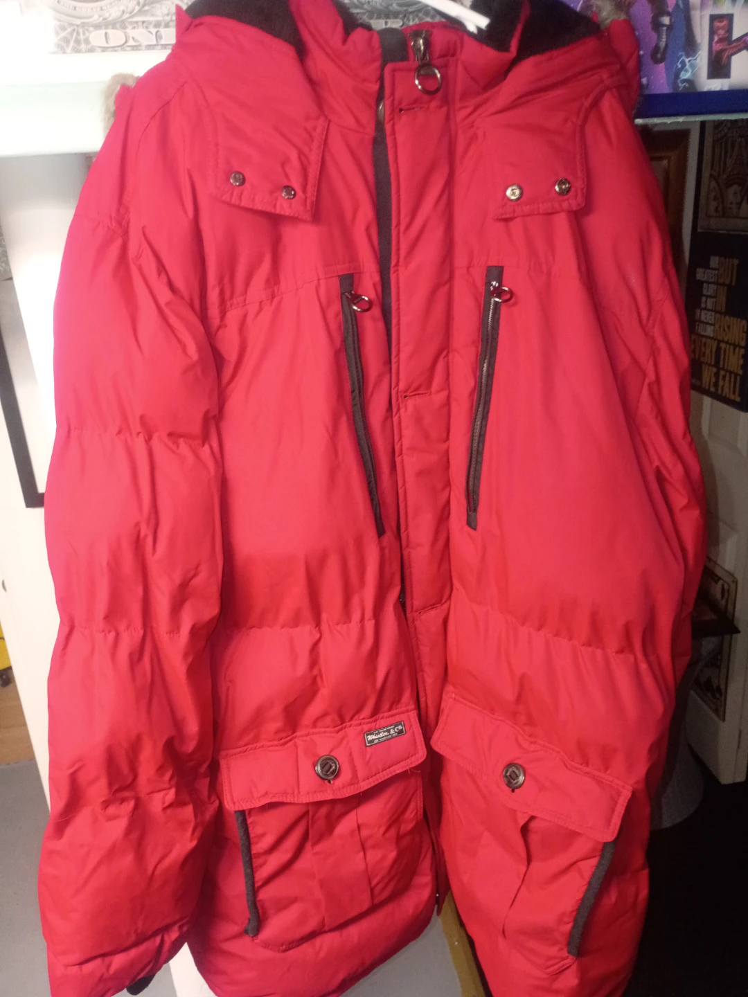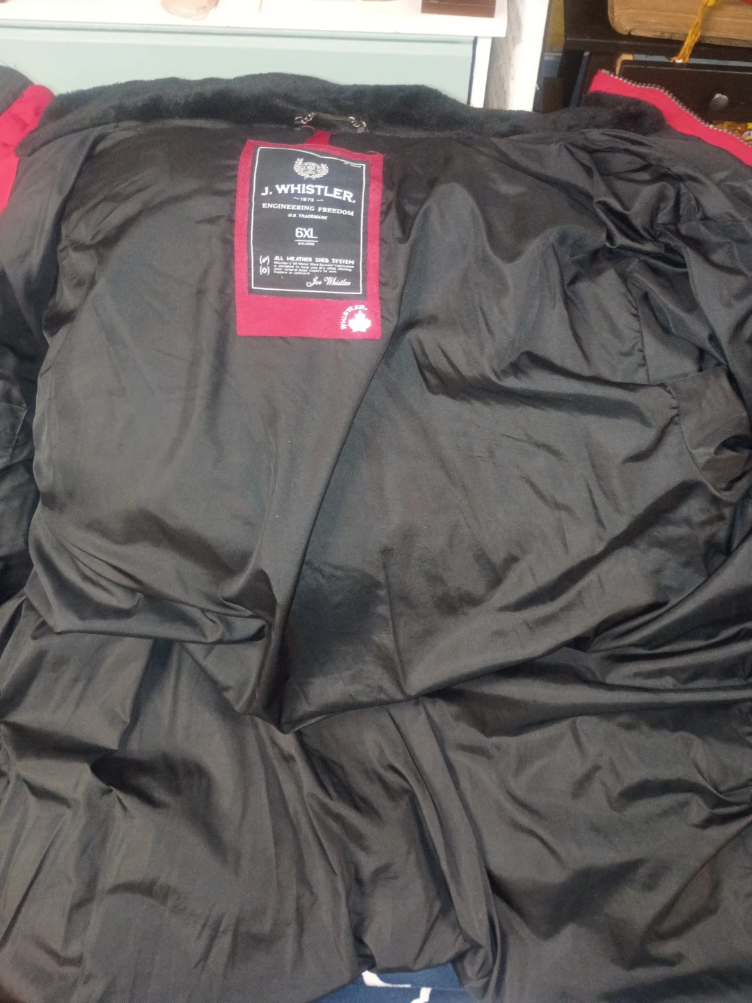J. Whistler Milano men's bomber jacket in red with a removable hood and faux fur trim. Used in excellent condition needs a dry clean stored over the summer