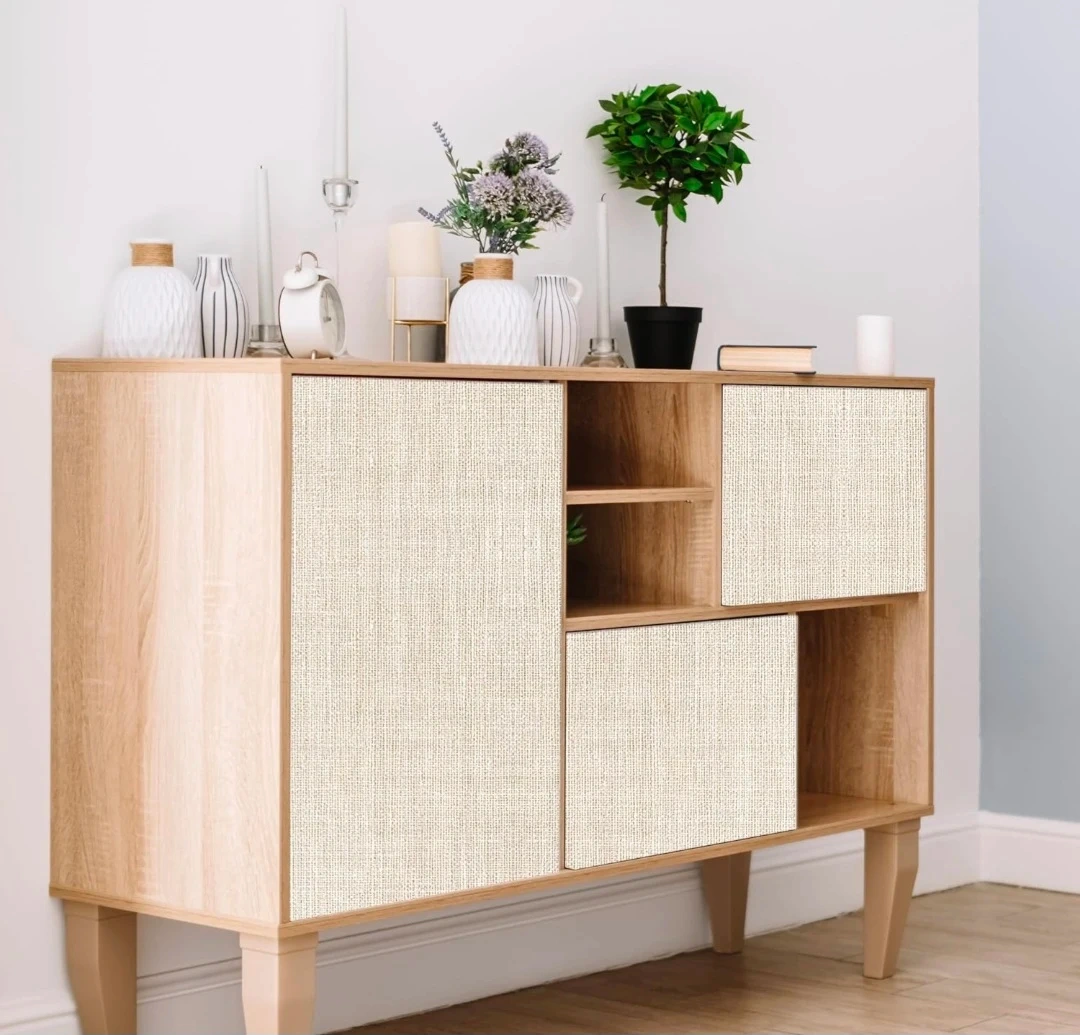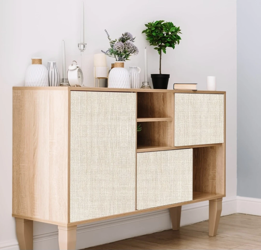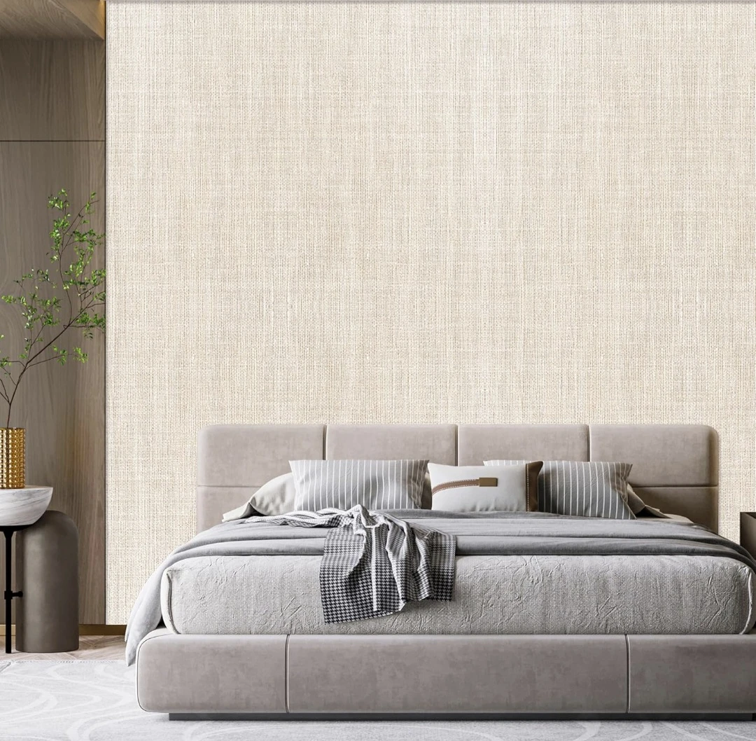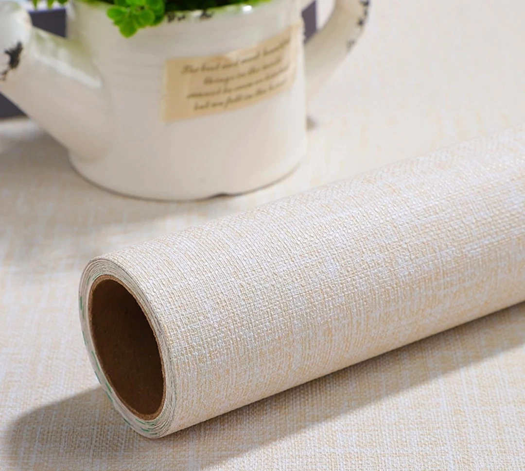 Textured grasscloth wallpaper in a neutral beige tone! 15.7"×374" It's perfect for adding a subtle touch of elegance to any room. The material has a nice woven texture that catches the light beautifully. Self-adhesive, waterproof, vinyl. Have multiple rolls available.