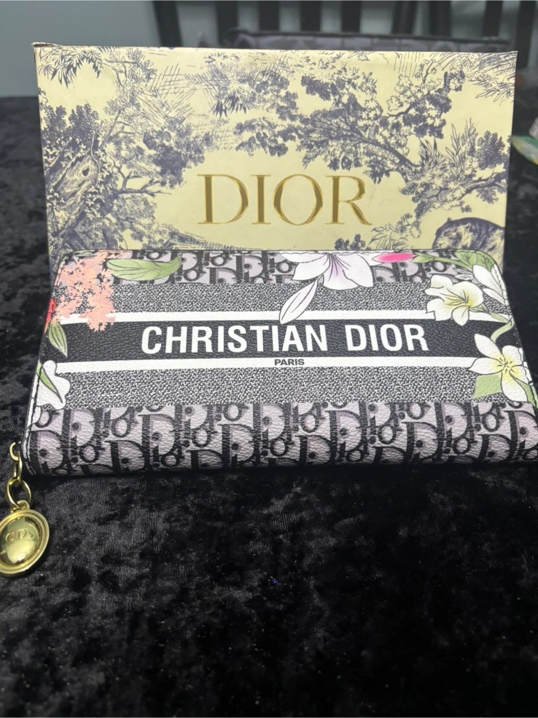 Selling a lovely Christian Dior wallet with a floral design! It comes with its original box. The wallet features the classic Dior Oblique pattern with a beautiful floral accent. It's in great condition and ready for a new owner!