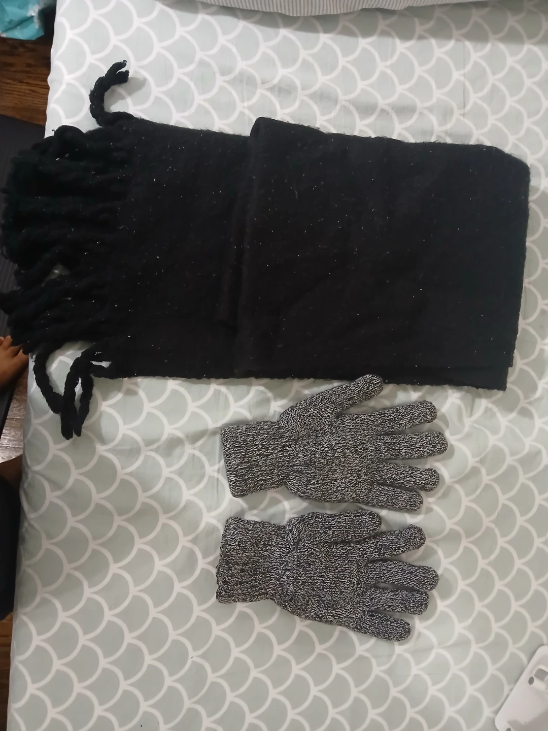 Selling a cozy black scarf and gloves set! Perfect for keeping warm during the colder months. The scarf has a fringed edge, and the gloves (M/L) are knit with a gray and white pattern. Both are in good condition and ready for a new owner. #gifting